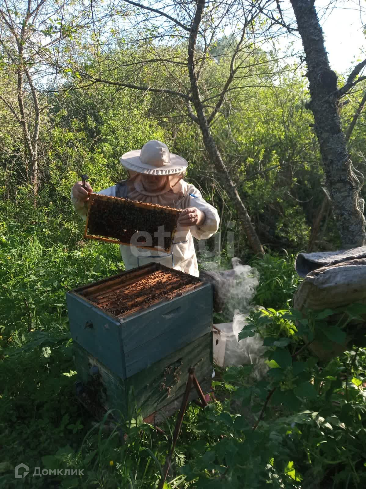 На участке расположены два сарая для хранения инструментов для работы с пчелами, мотоблок для обработки земли, а так же теплица.