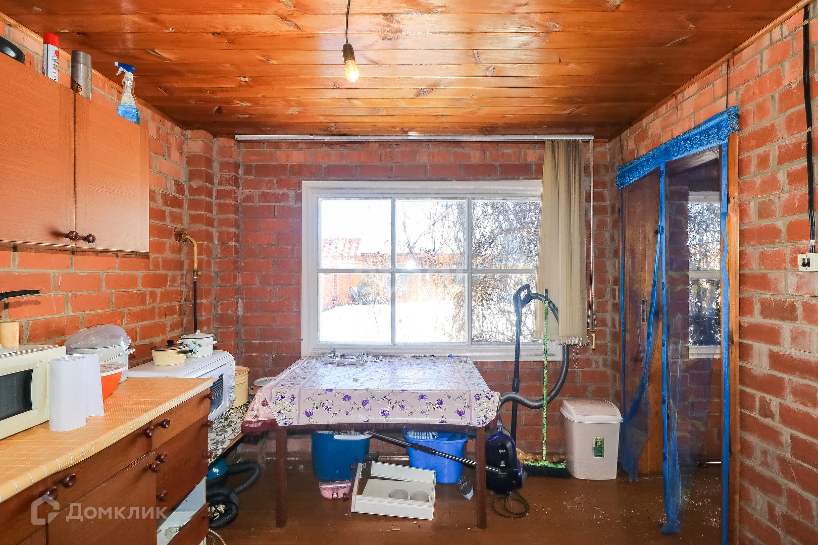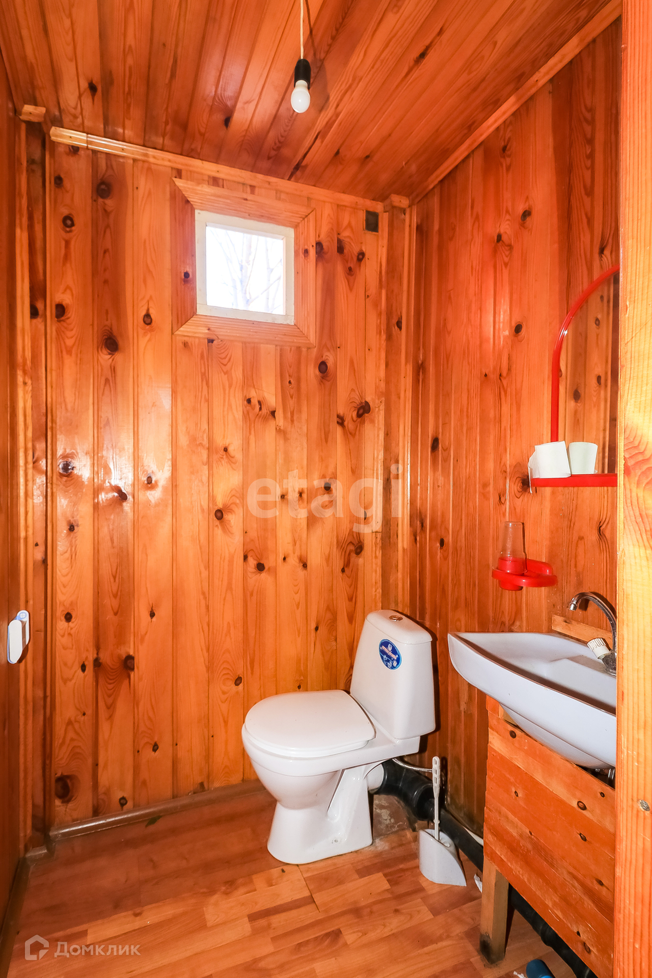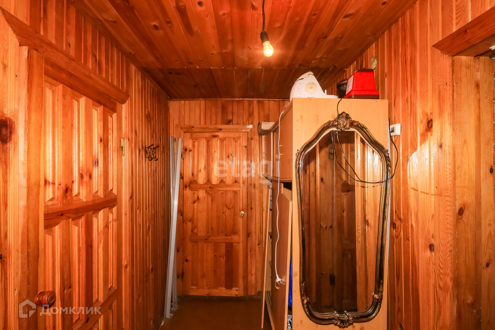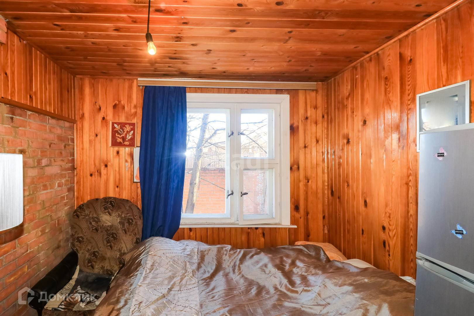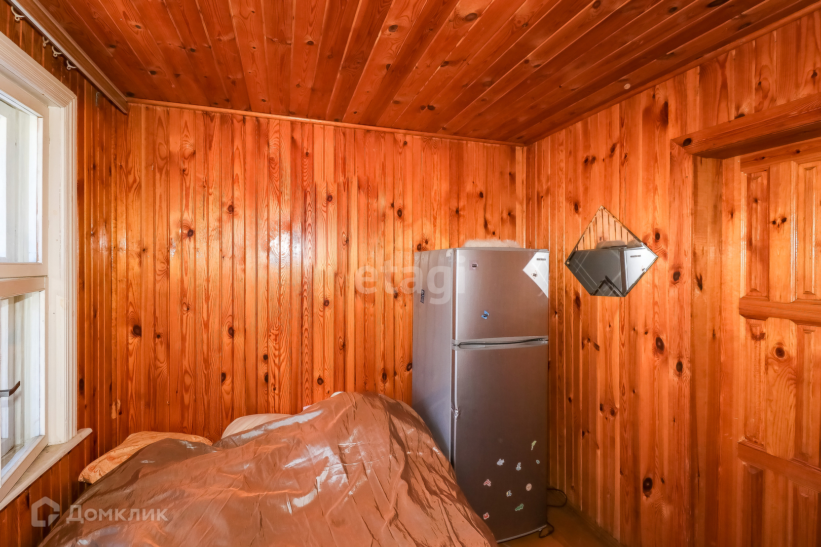 Дом панельный одноэтажный 50 кв.м., облицован кирпичём. Внутри дом обшит вагонкой, окрашен в светлый цвет. Сверху - мансардный этаж со спальными местами. Установлены газовые конвекторы. В доме есть санузел, установлен септик. Первый этаж включает в себя веранду, кухню, комнату с печкой и камином, спальню.