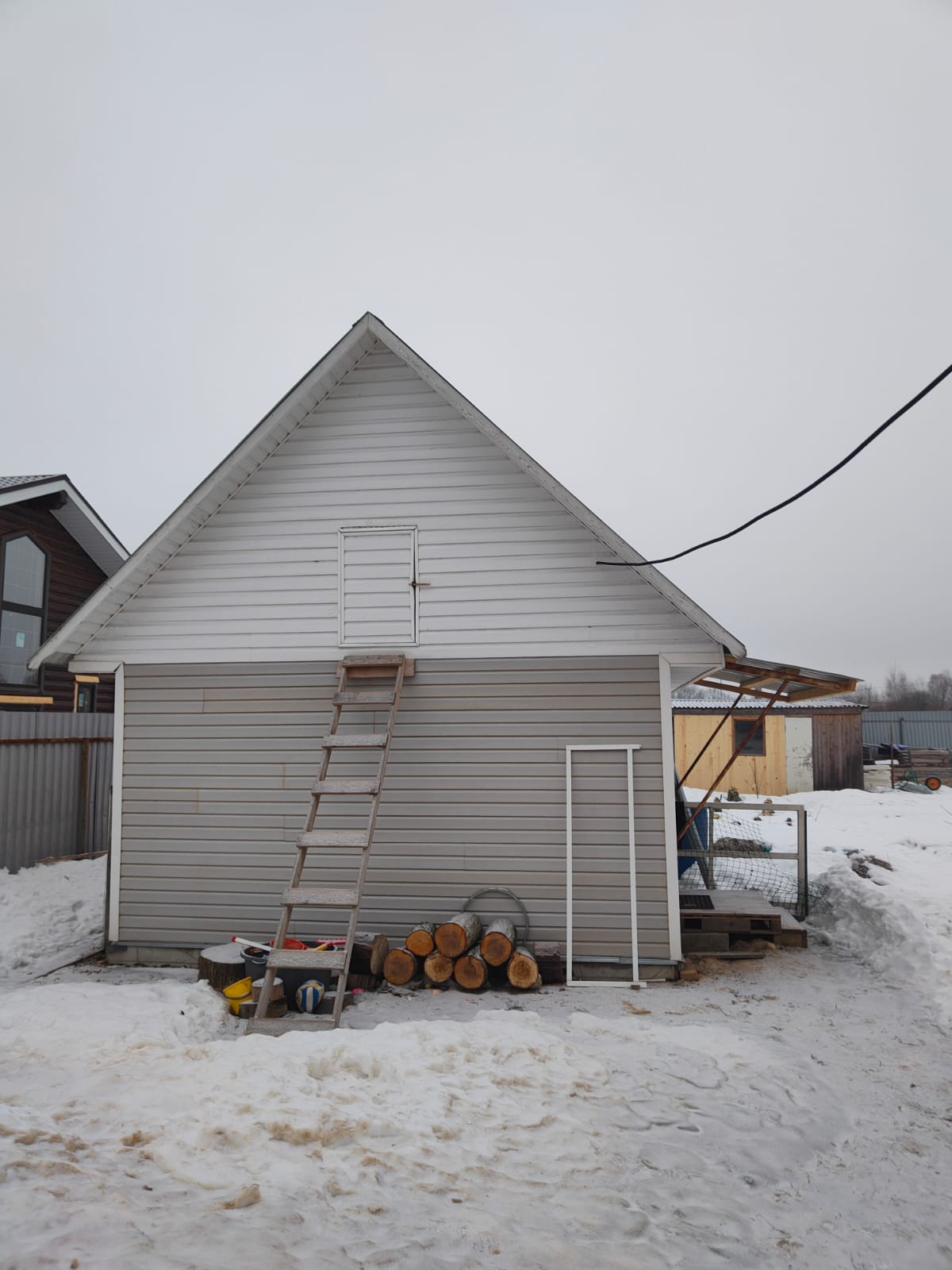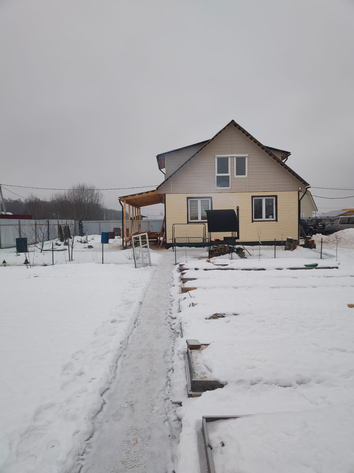 Участок огорожен забором из профнастила с откатными воротами под электропривод.