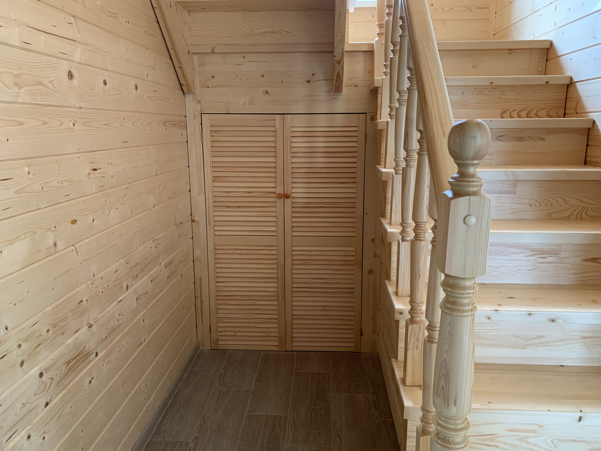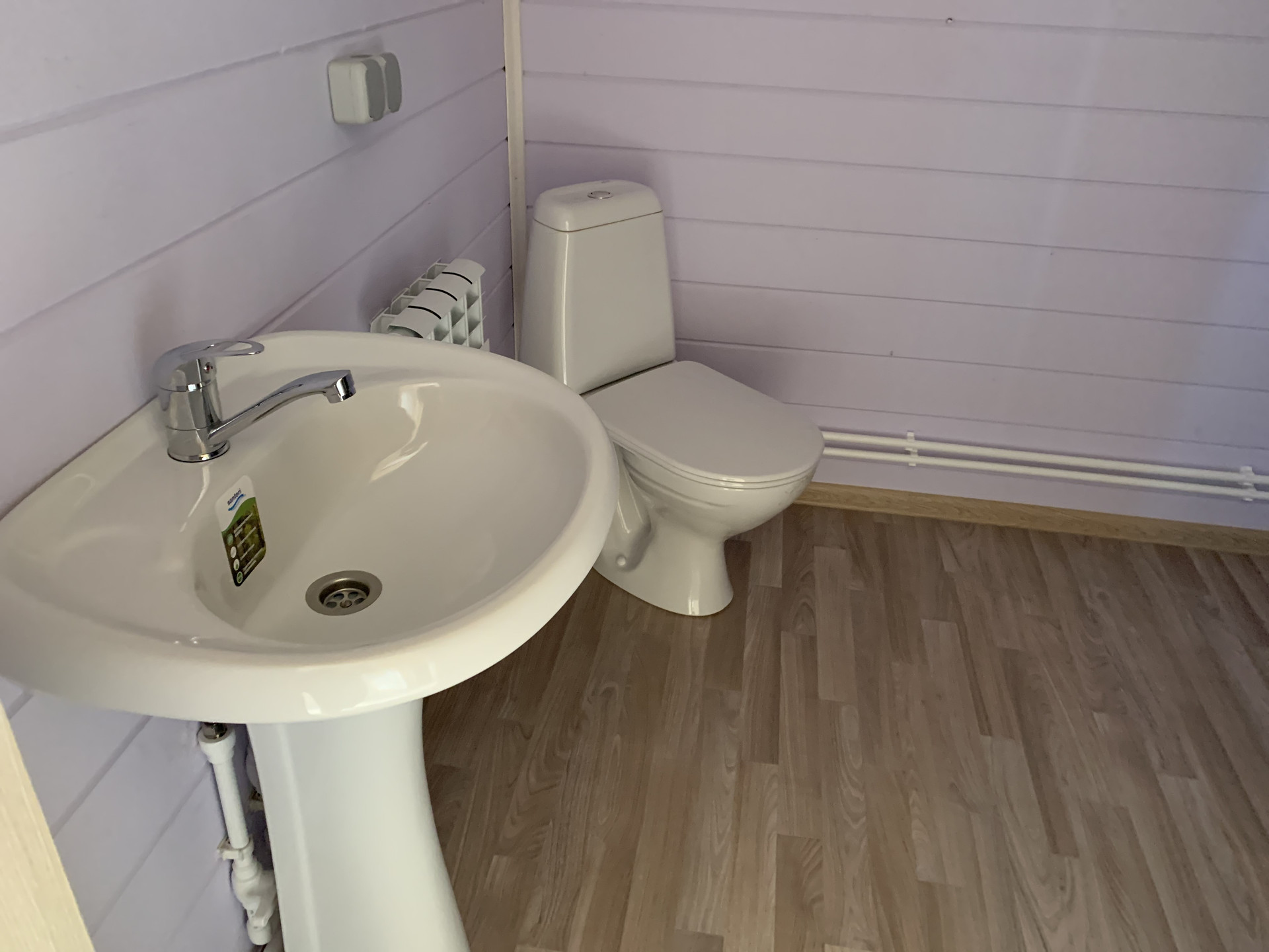 На первом этаже большой холл, гостевая комната или кабинет, светлая гостиная с кухней, санузел с ванной, на втором этаже три комнаты, уютных холл.