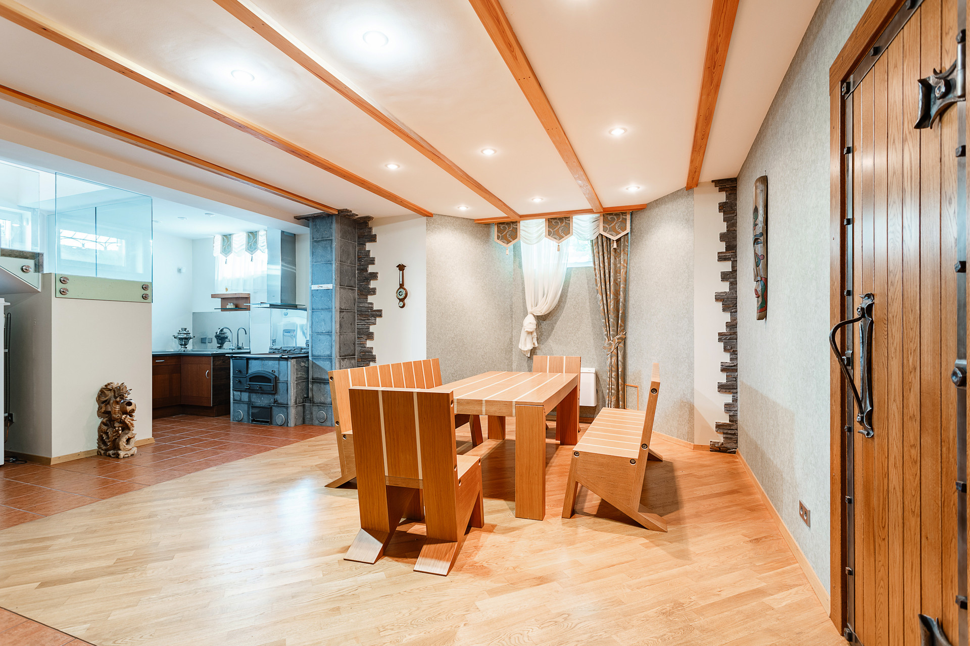 1 этаж h-2.97м финская сауна электрическая, бассейн с подогревом, двухступенчатая очистка воды + массаж+противоток, комната отдыха, холл, кухня-гостиная, каминный зал со вторым светом h- 6.08м,гардеробная, хозпомещение, с/у.