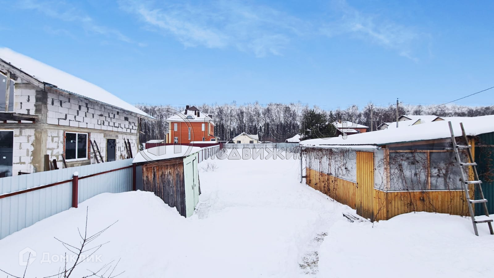 На участке стоит модульное здание 5 на 6 метров, с верандой, для круглогодичного проживания, в доме свет, отопление, горячая холодная вода из скважины в 20 метров, есть мебель, холодильник.