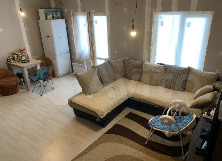 Ковролин в комнатах, в кухне-гостиной ламинат. Стены подготовлены к поклейке обоев.
