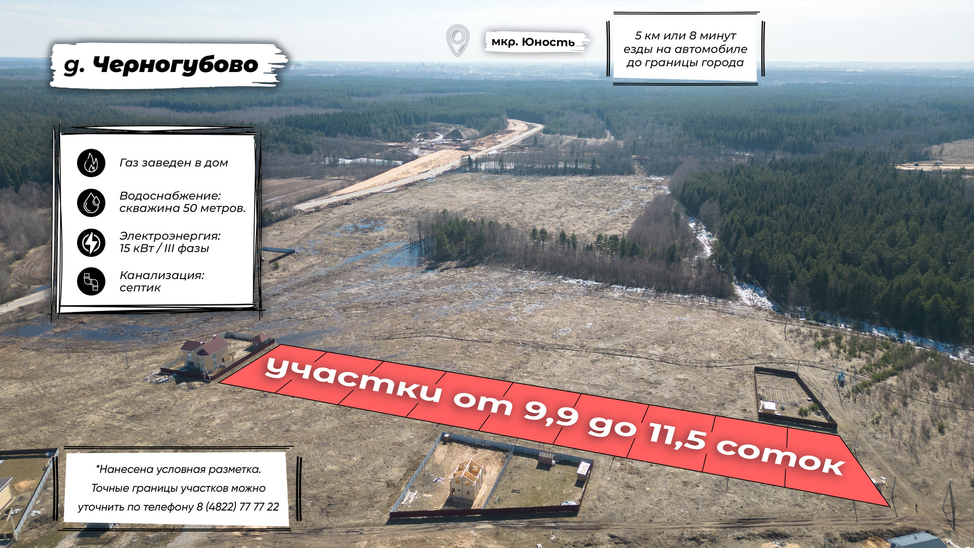 Газ– по границе участка (при необходимости помогаем осуществить подключение)