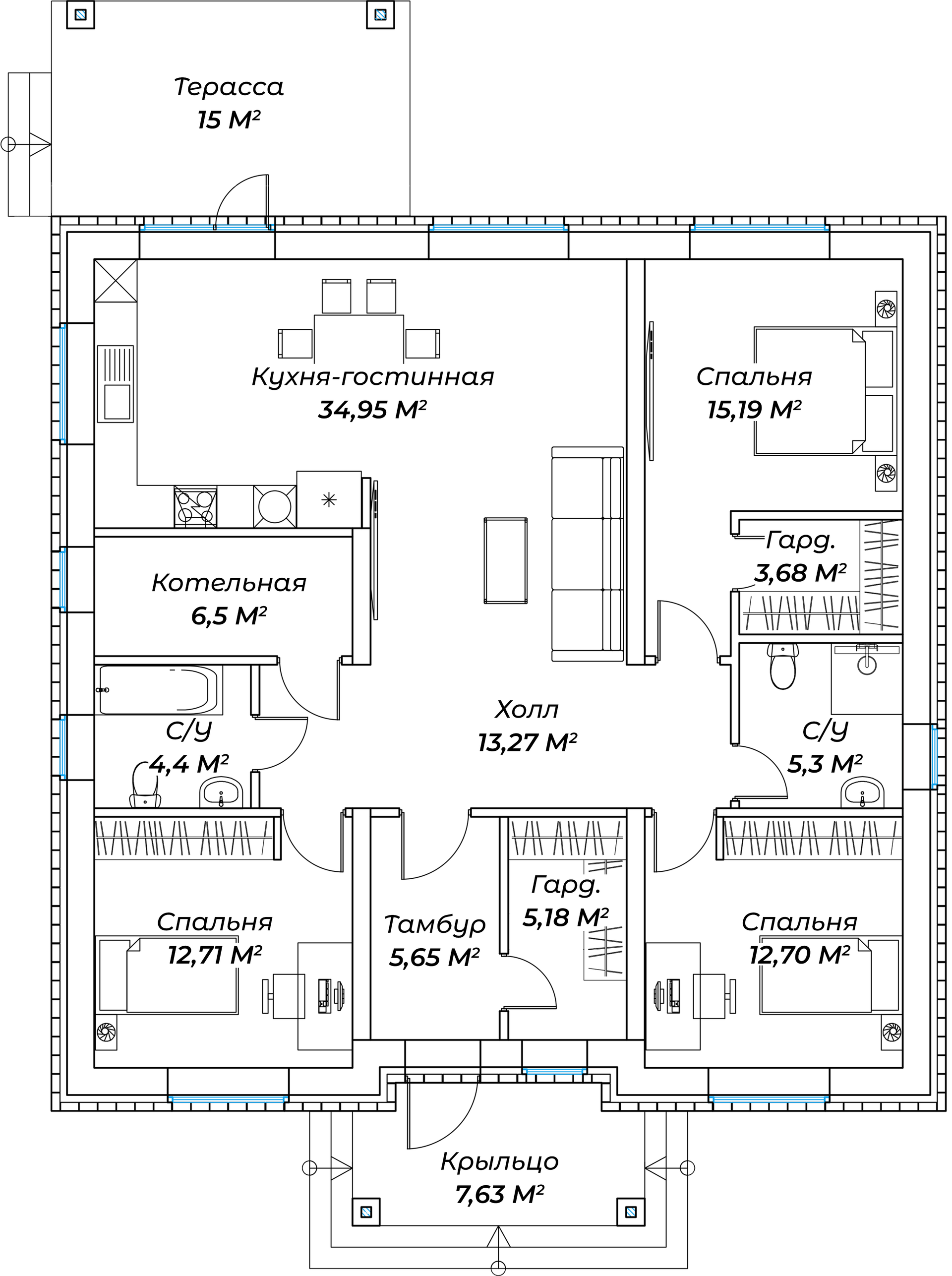 Так же к фасаду дома примыкает тамбур 7,6 м², на тыльной стороне расположена открытая терраса 15 м².