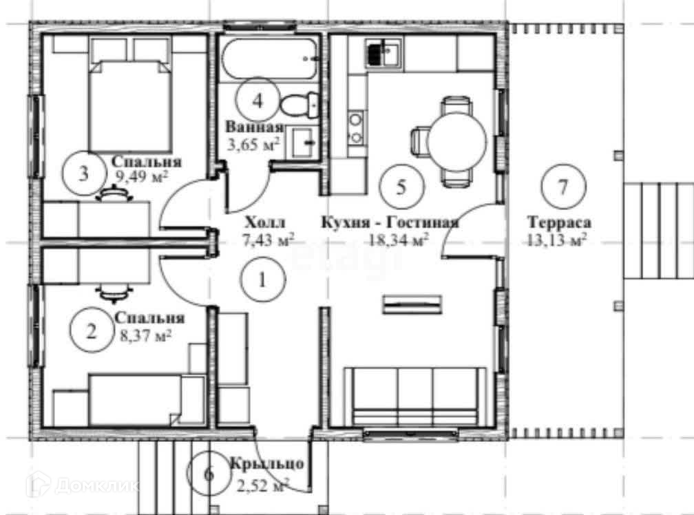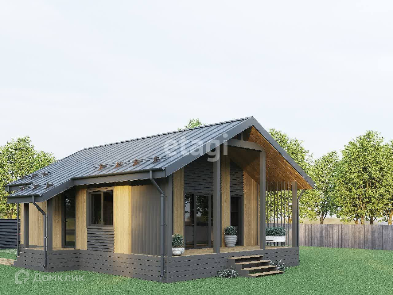 Каркасный дом для круглогодичного проживания. Общая площадь 60м2, две изолированные комнаты 10 м2 /8,5 м2, кухня –гостиная 19м2, су 3,65м2, терраса 14м2.