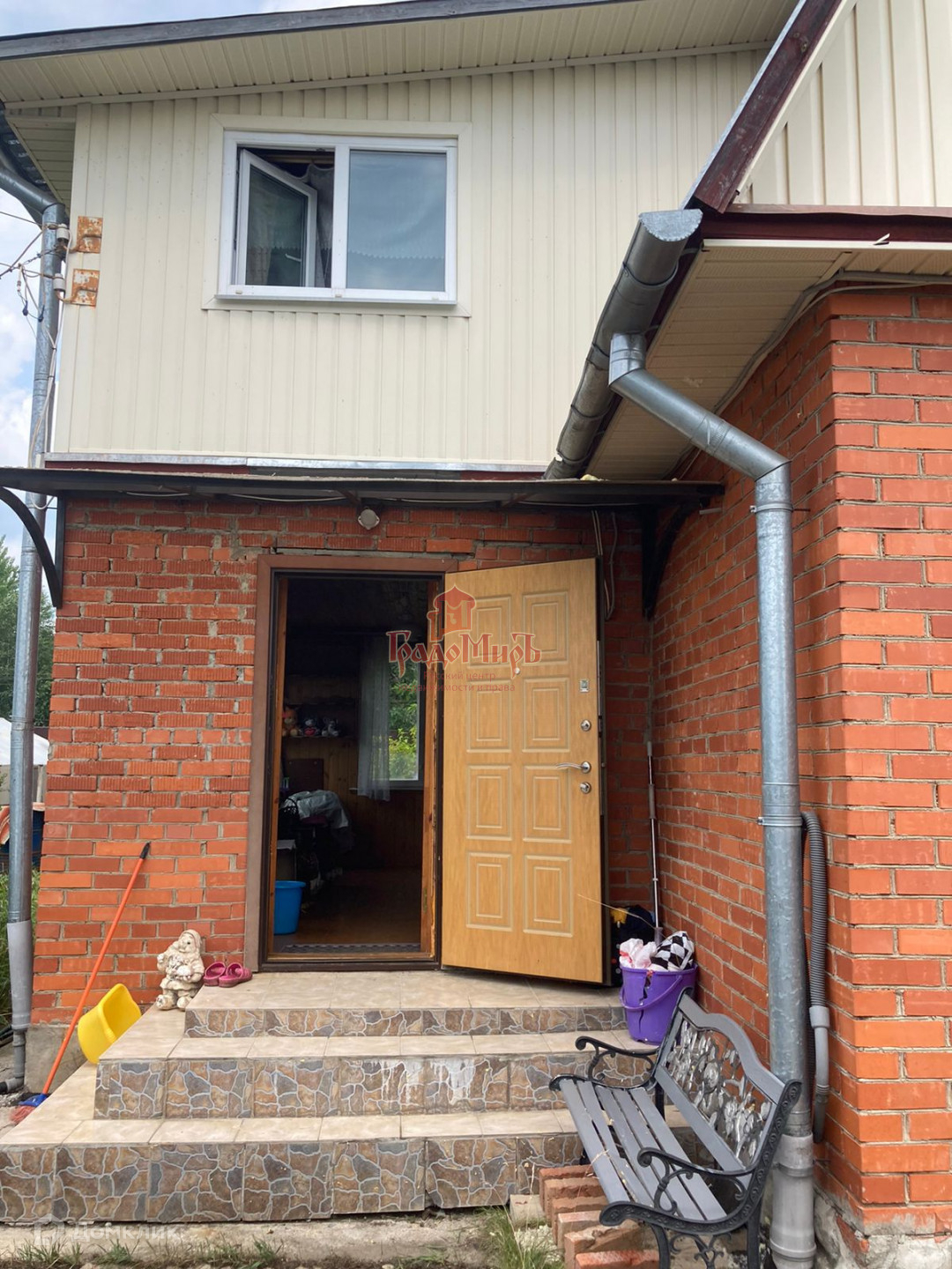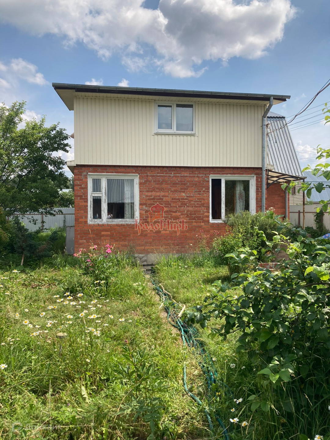 Дом двухэтажный, каркасно-щитовой (утеплен), обложен кирпичом, стоит на ленточном фундаменте + плиты, кровля - оцинкованное железо.
