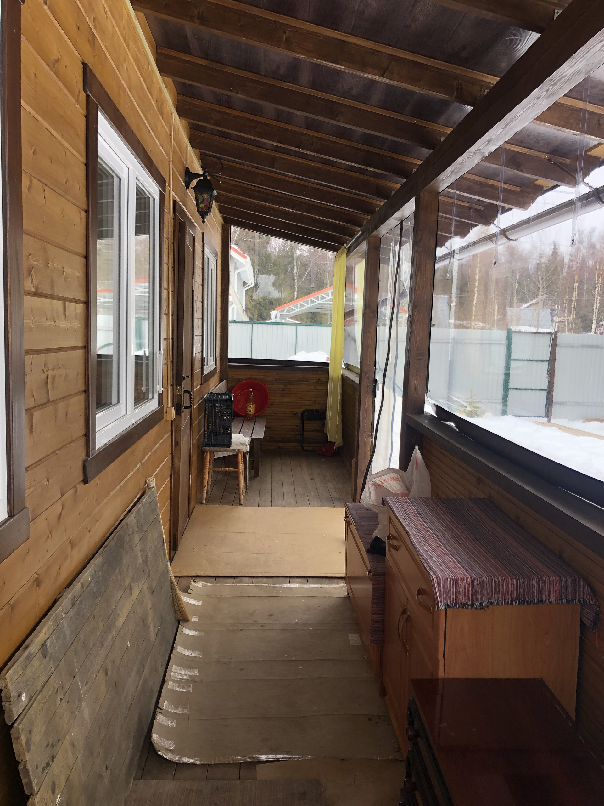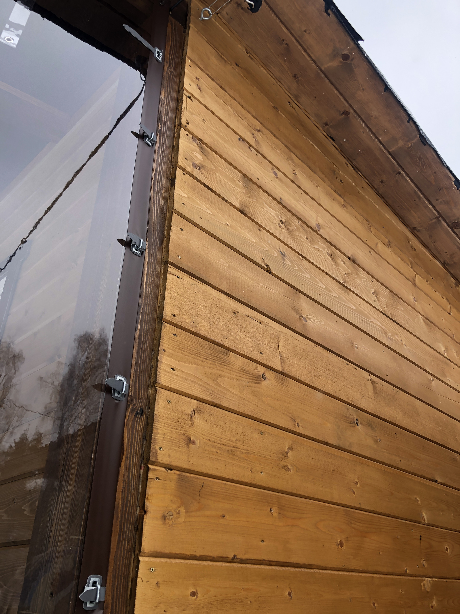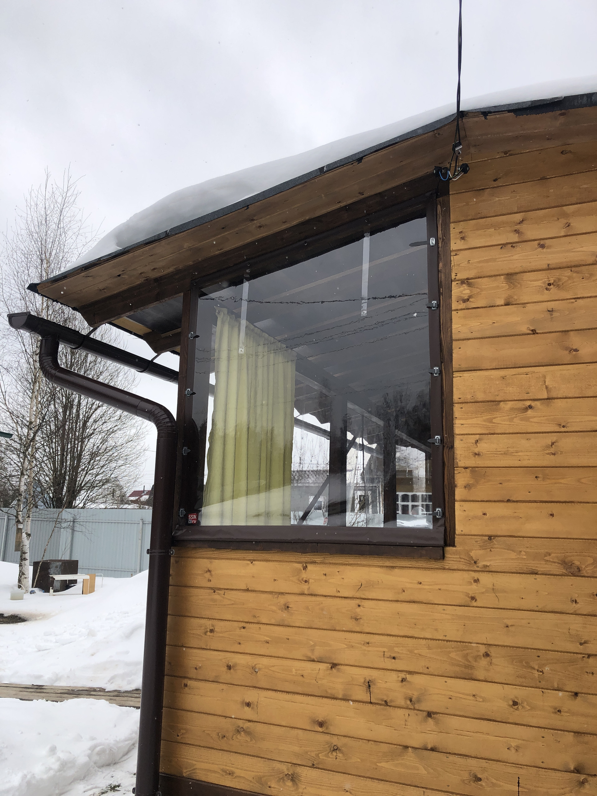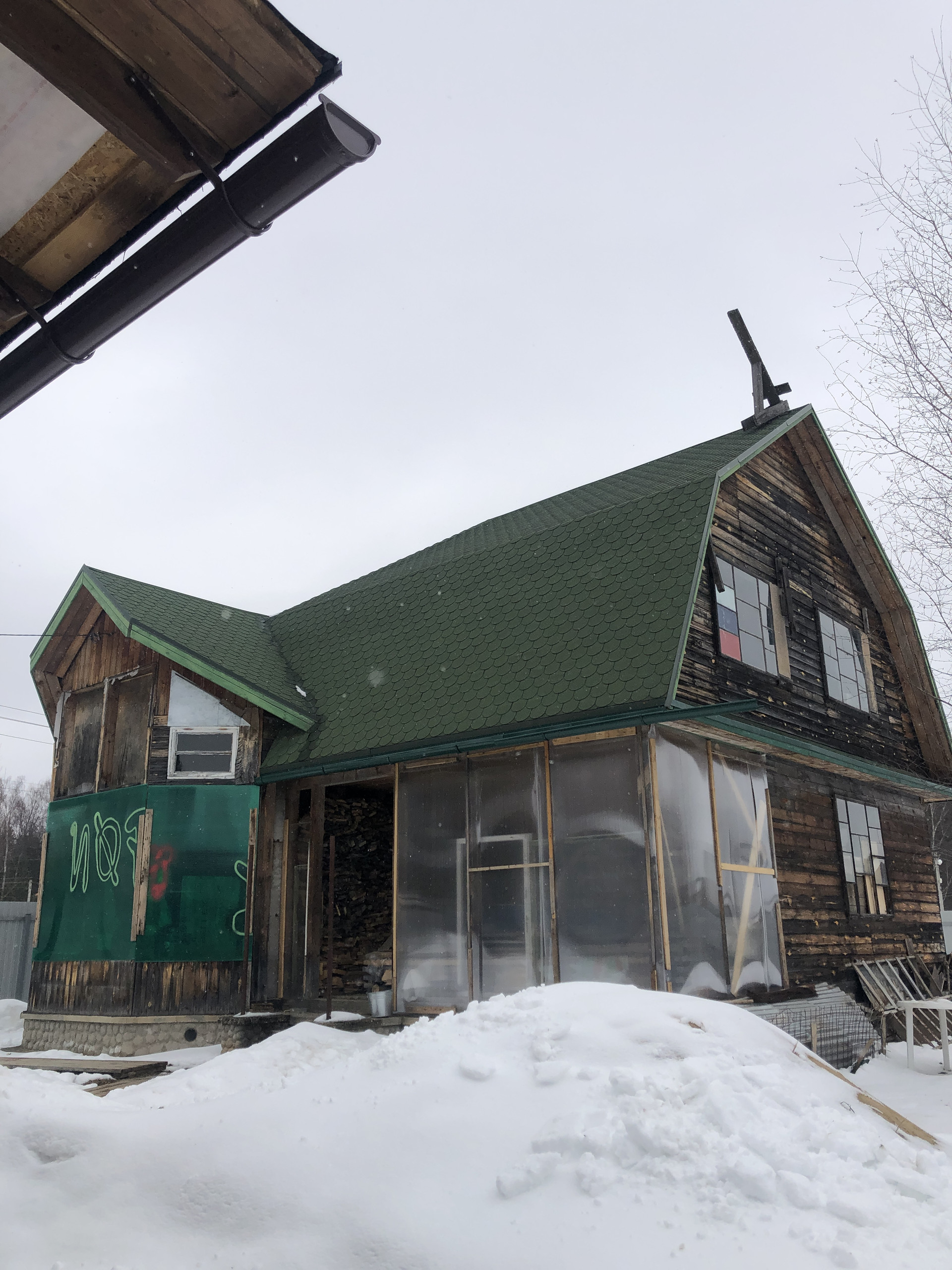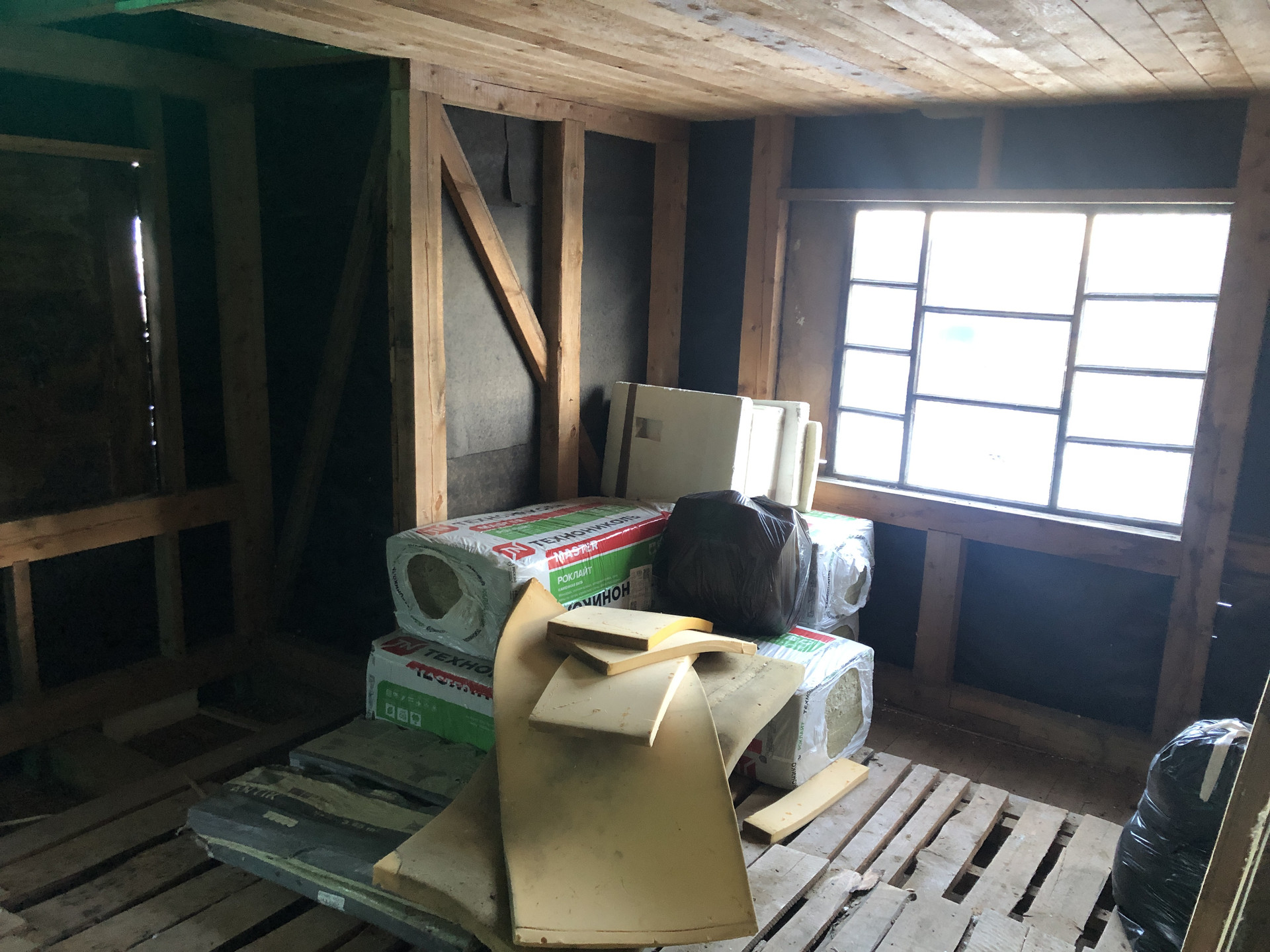 Сделана кровля, каркас из бруса, снаружи отделка доска.