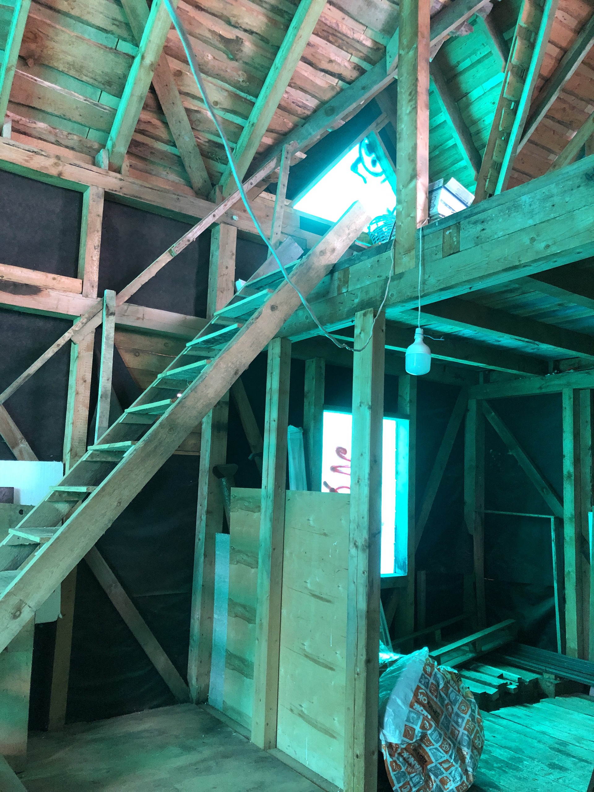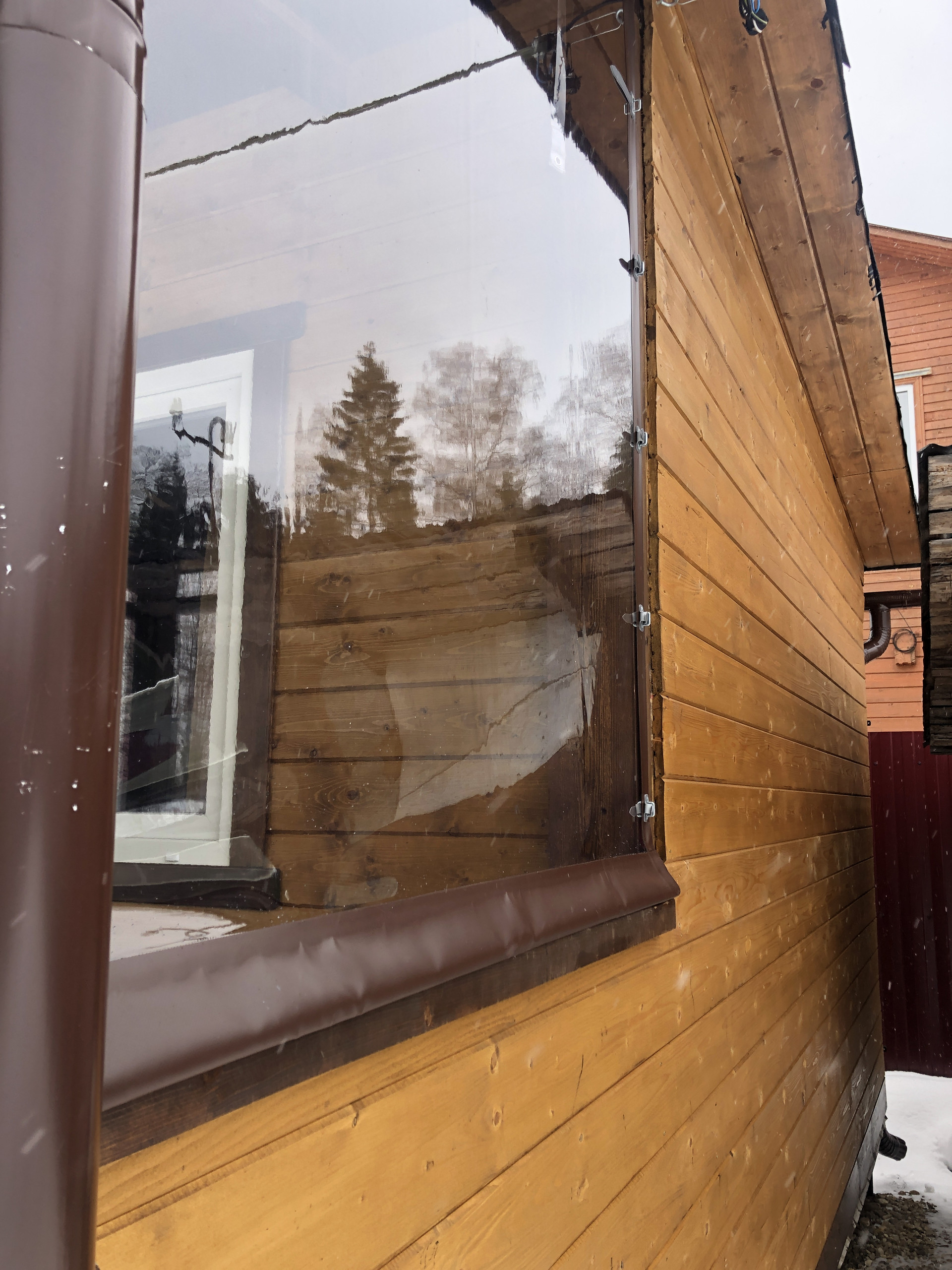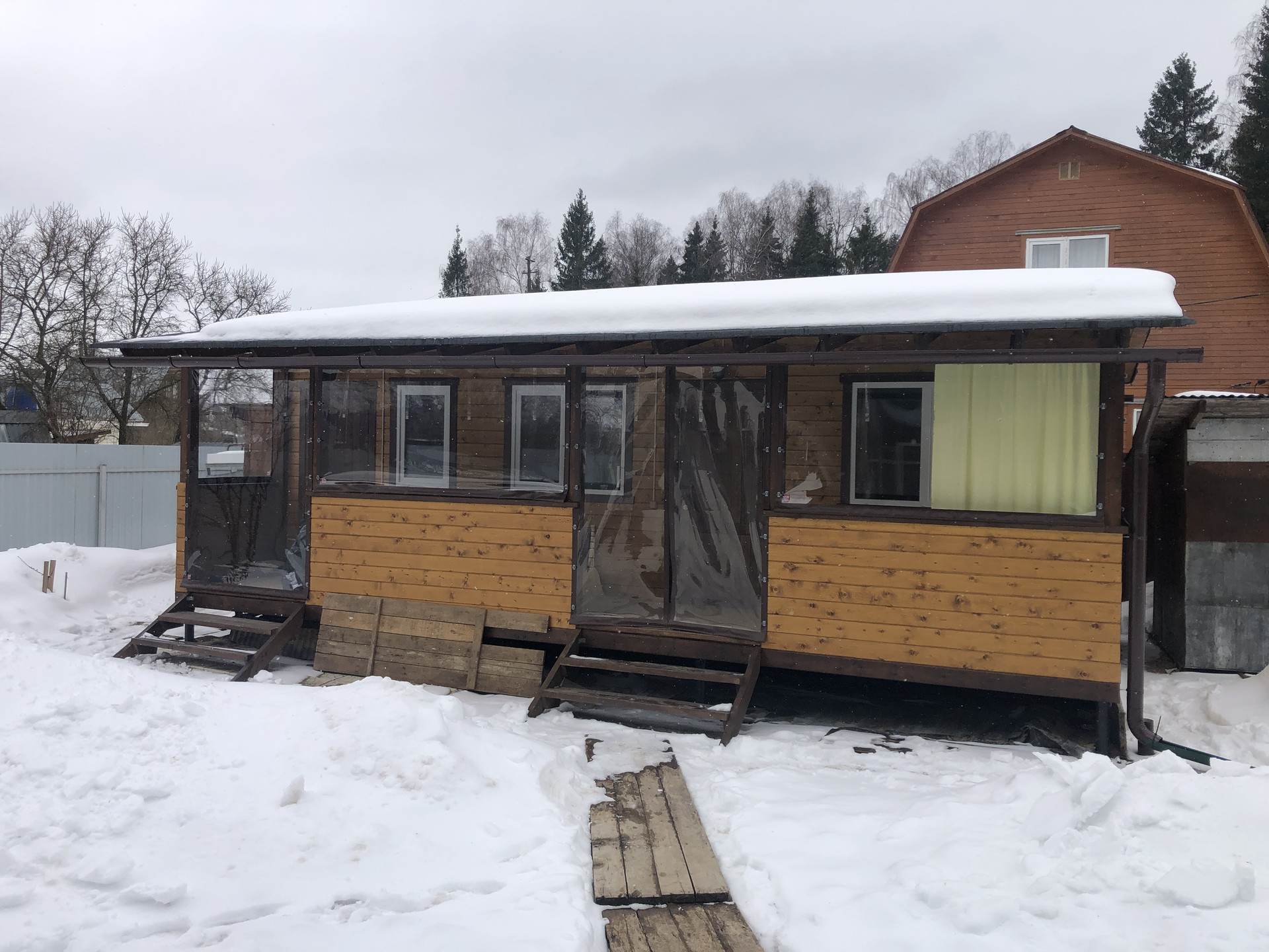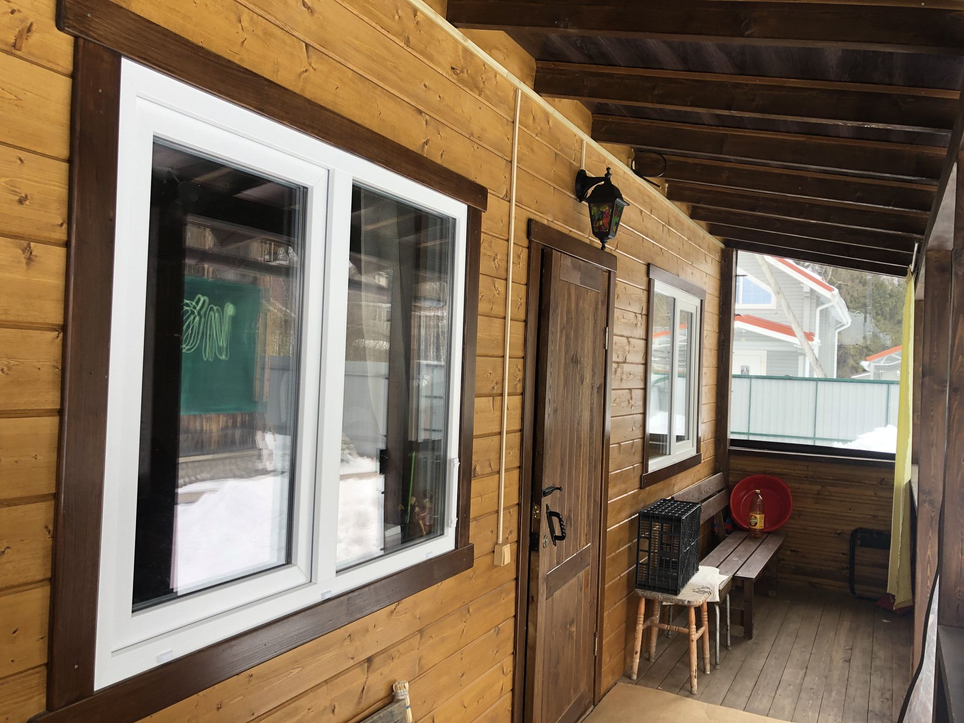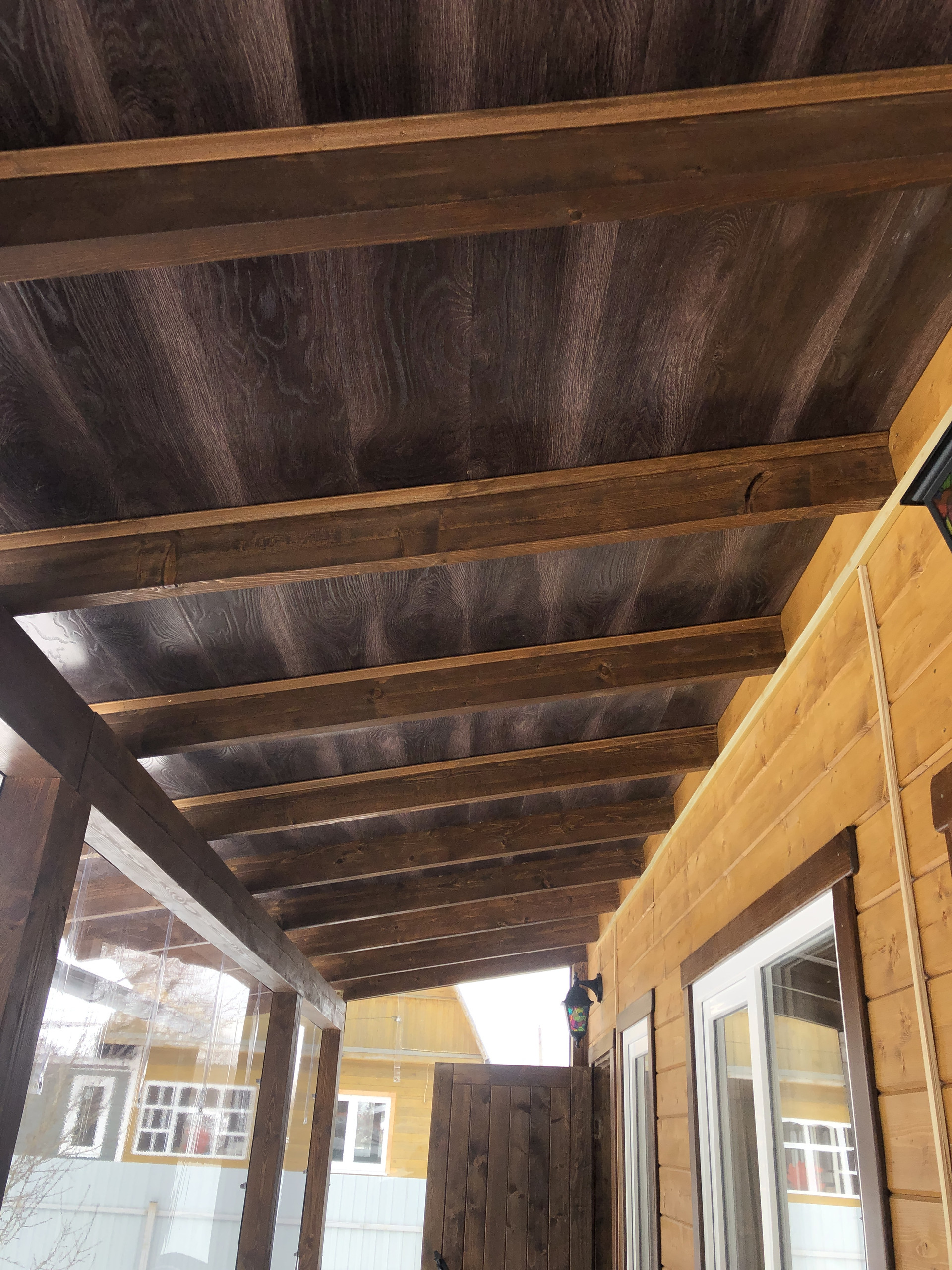 Сделана кровля, каркас из бруса, снаружи отделка доска.