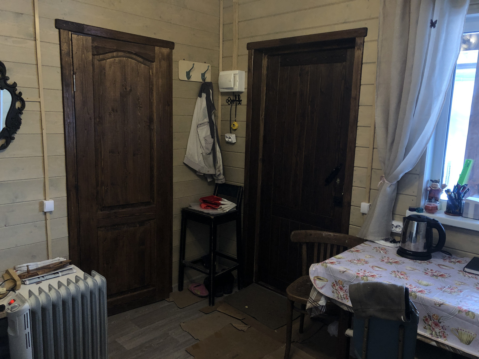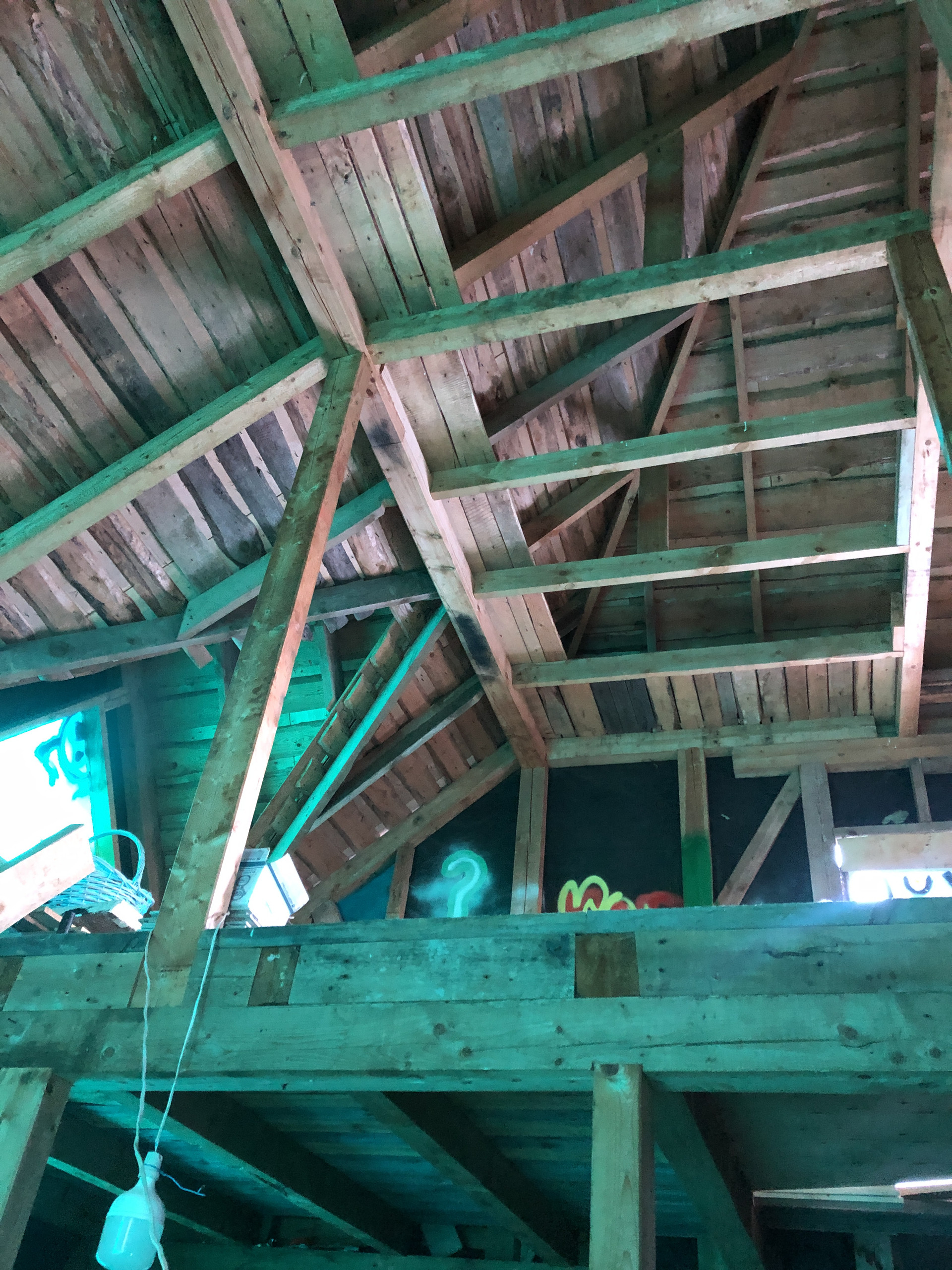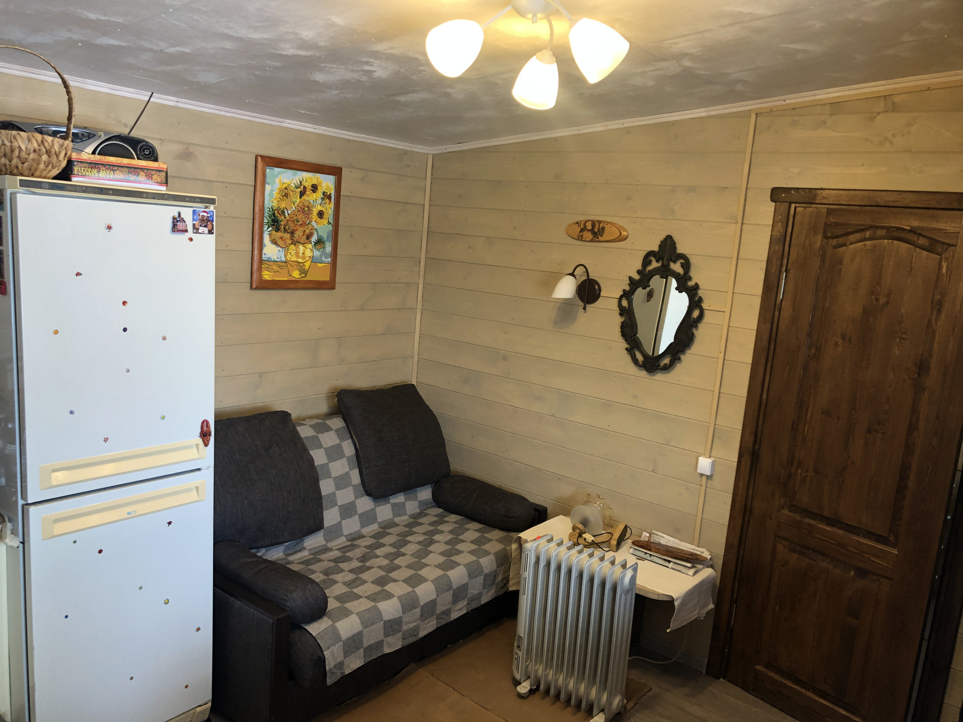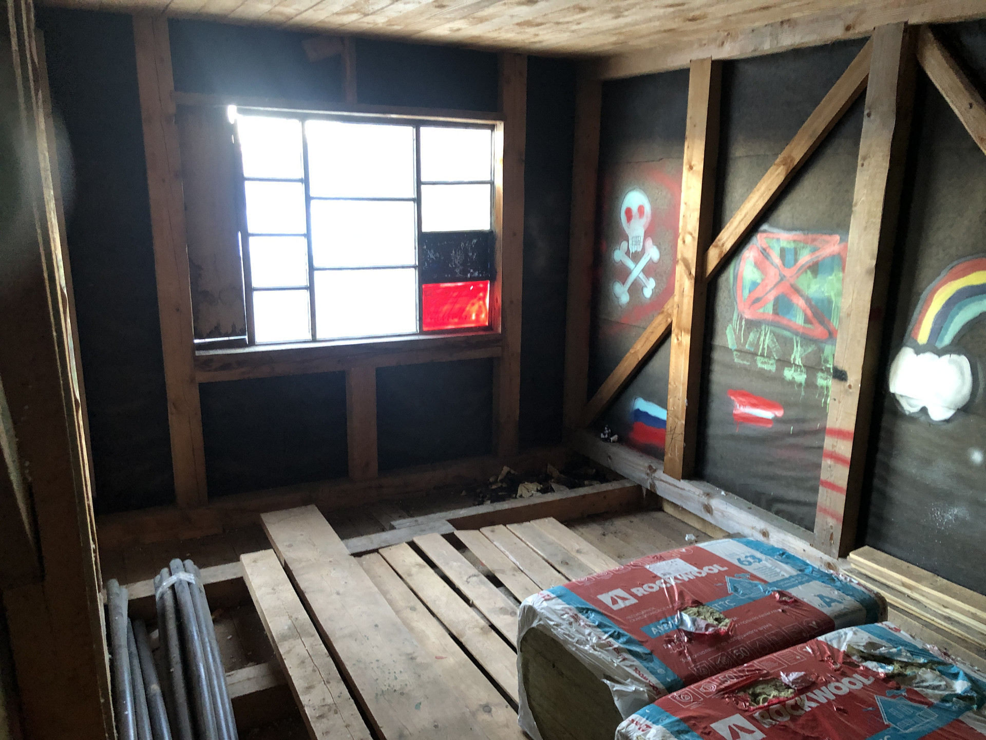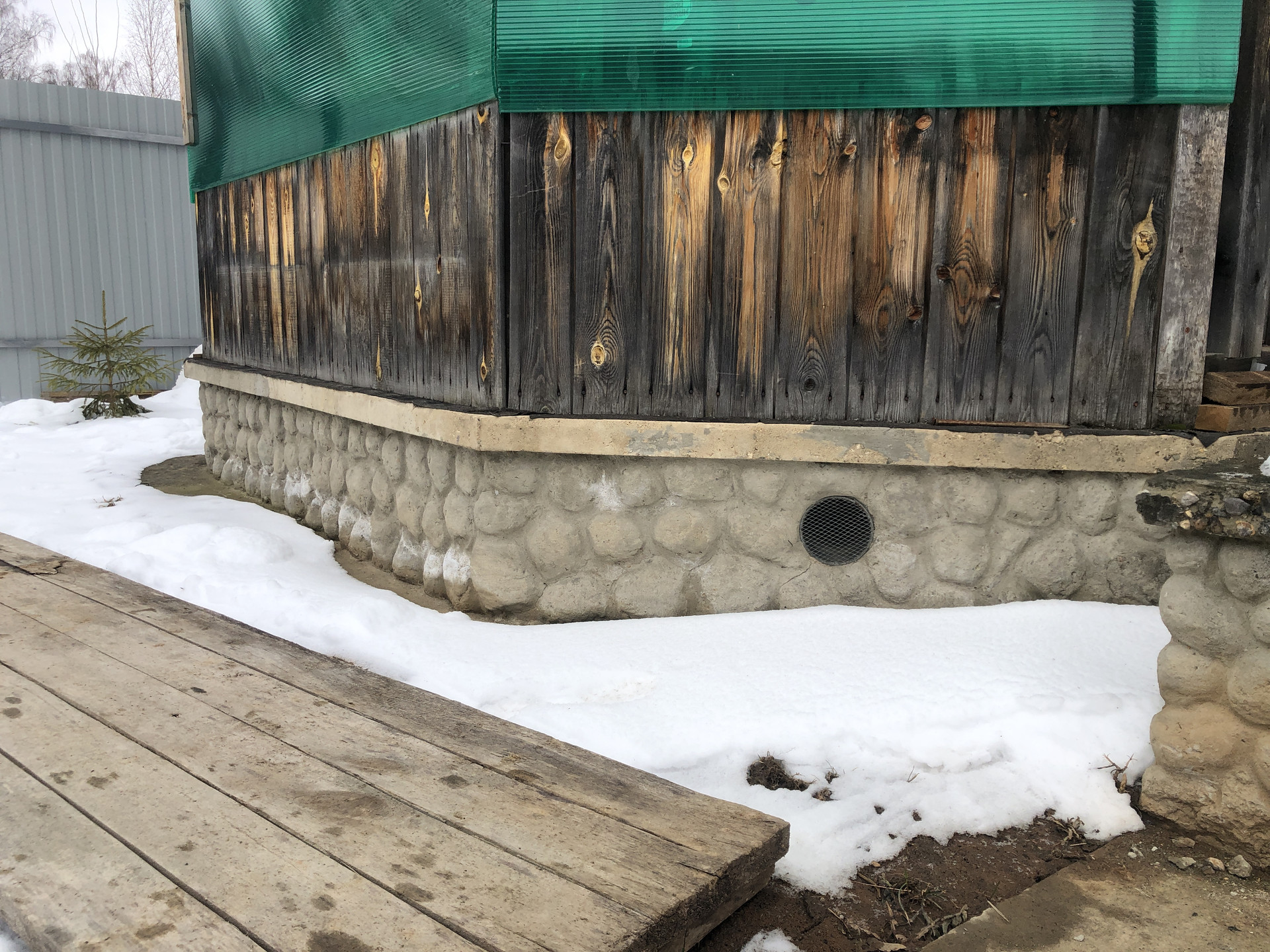 Сделана кровля, каркас из бруса, снаружи отделка доска.
