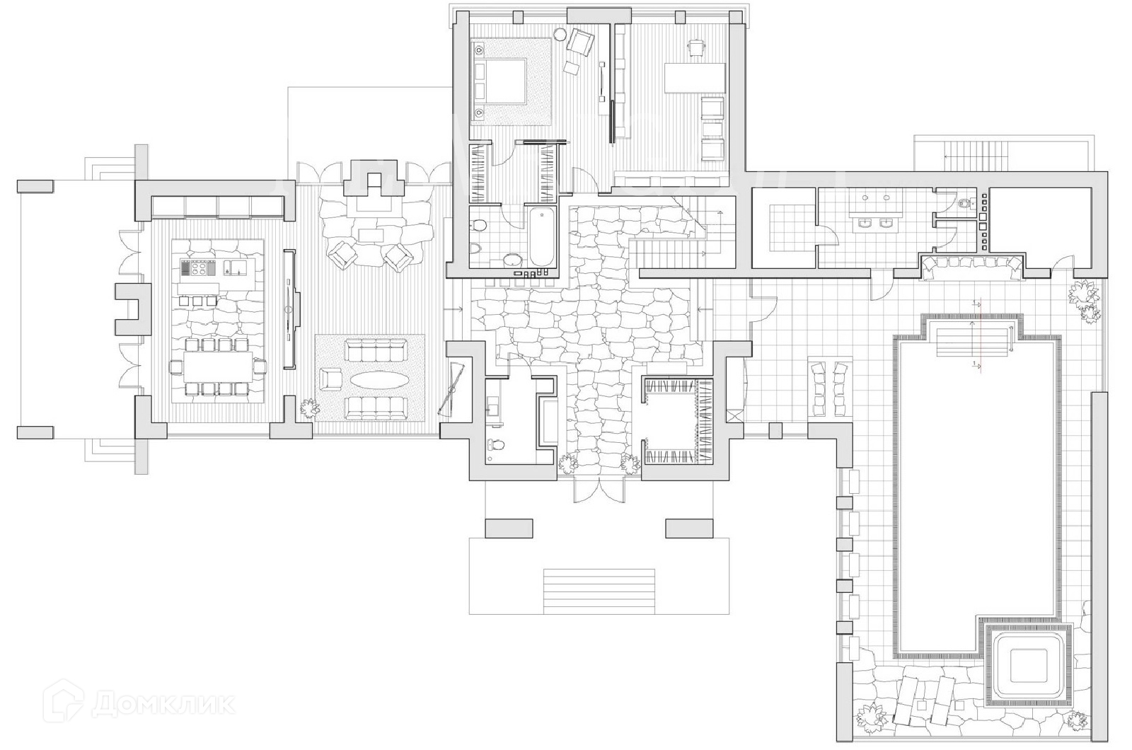 1 этаж - холл, гардеробная, с/у, гостиная с камином, кухня, столовая, крытая терраса с камином, спальня, гардеробная, санузел, кабинет, СПА-зона, бассейн 18м, душевая, санузел, хаммам, постирочная,
