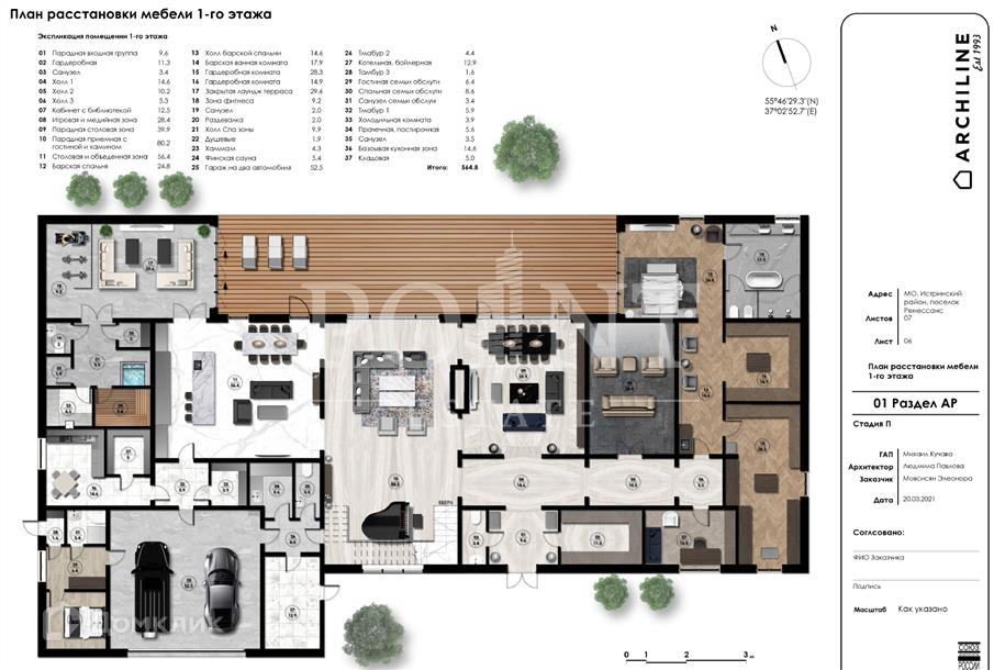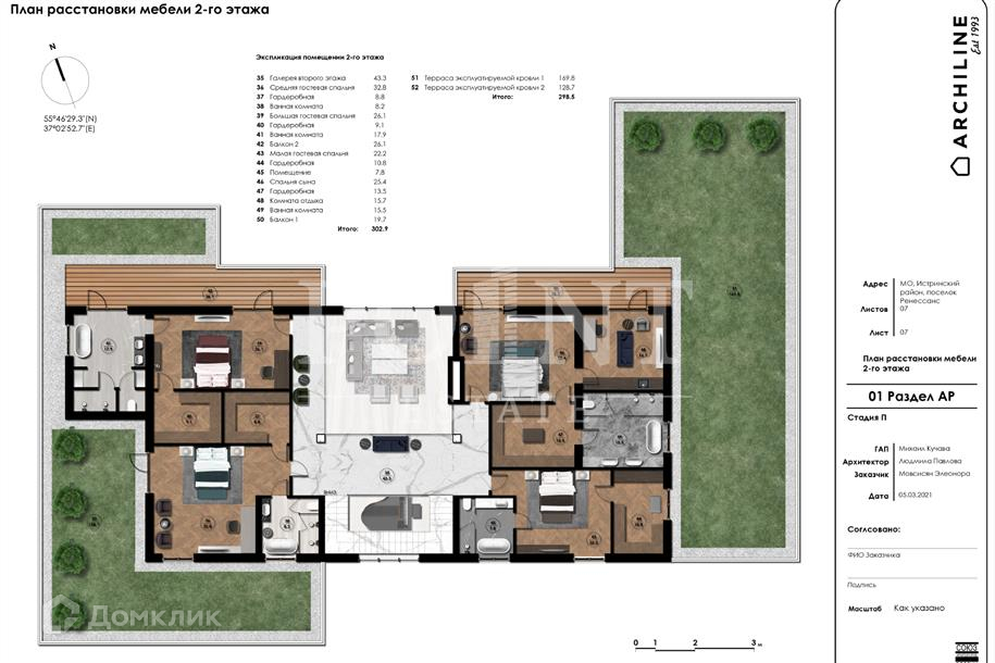 Лот: 99142.   Предлагается прекрасный современный двухэтажный загородный дом площадью 1 295 кв.м, построенный на участке 18,2 сотки в элитном коттеджном поселке "Ренессанс Парк". Свободная планировка позволит будущим владельцам организовать жилое пространство в соответствии с собственными пожеланиями и предпочтениями. На первом этаже можно разместить гостиную-столовую, кухню-столовую, двусветную гостиную с камином, кабинет, спальню с гардеробной и санузлом, три гостевых санузла, кинотеатр, тренажерный зал, спа-зону с сауной, хаммамом и душевой, холодильную комнату, постирочную, котельную, кладовую, рабочую кухню, блок для пероснала, три гардеробные, несколько прихожих. Второй этаж могут занять четыре спальни с гардеробными и санузлами, холл, комната отдыха, два балкона, две террасы. Предусмотрен встроенный гараж на два шино-места. Есть готовый дизайн-проект под ключ. Поселок располагает благоприятными условиями для спокойной семейной жизни и отдыха на природе.