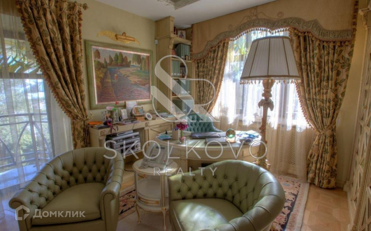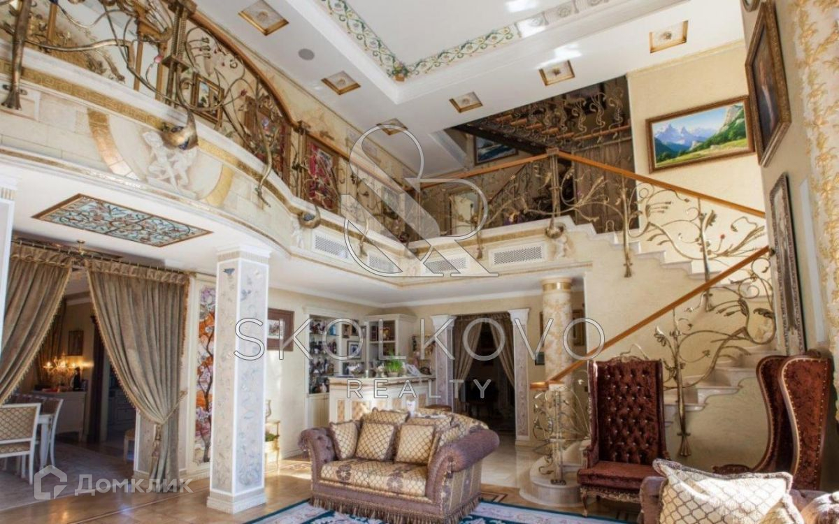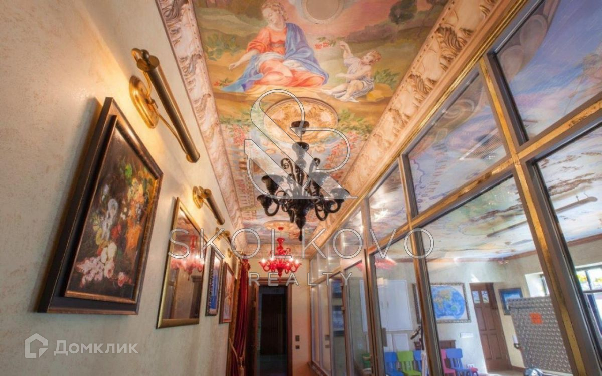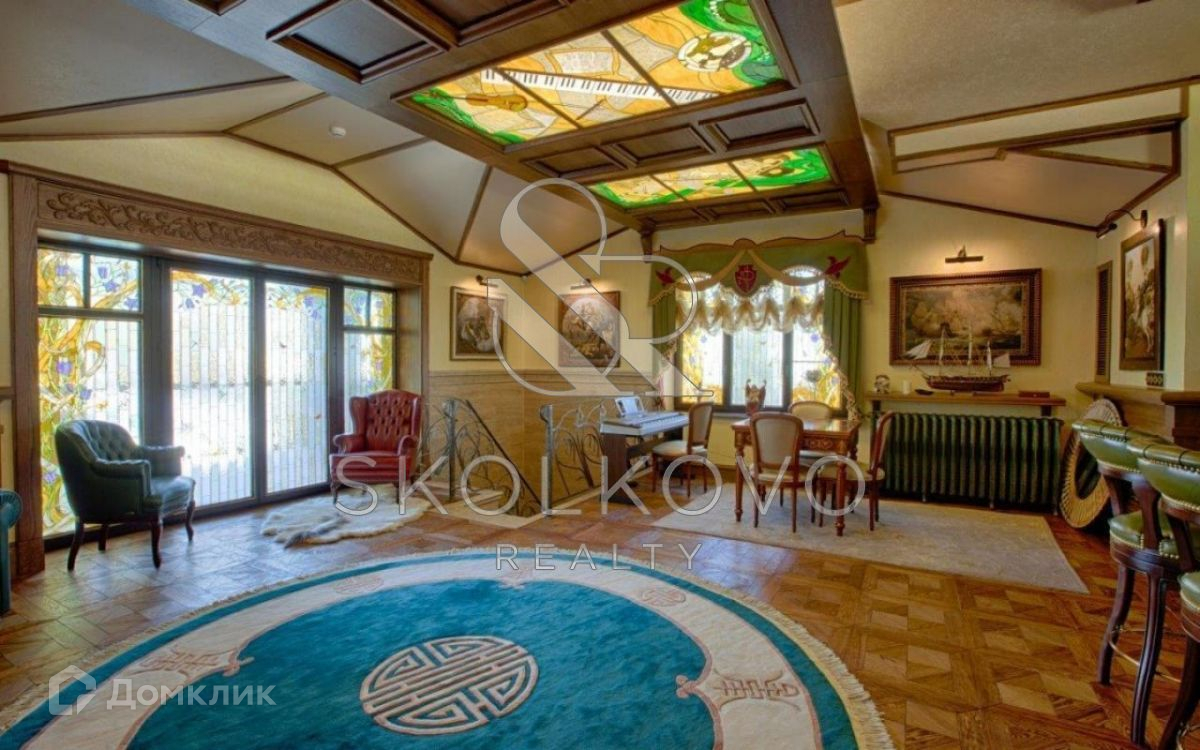 1 этаж: холл,  гостиная со вторым светом , кухня столовая, библиотека с камином, зимний сад, кабинет.