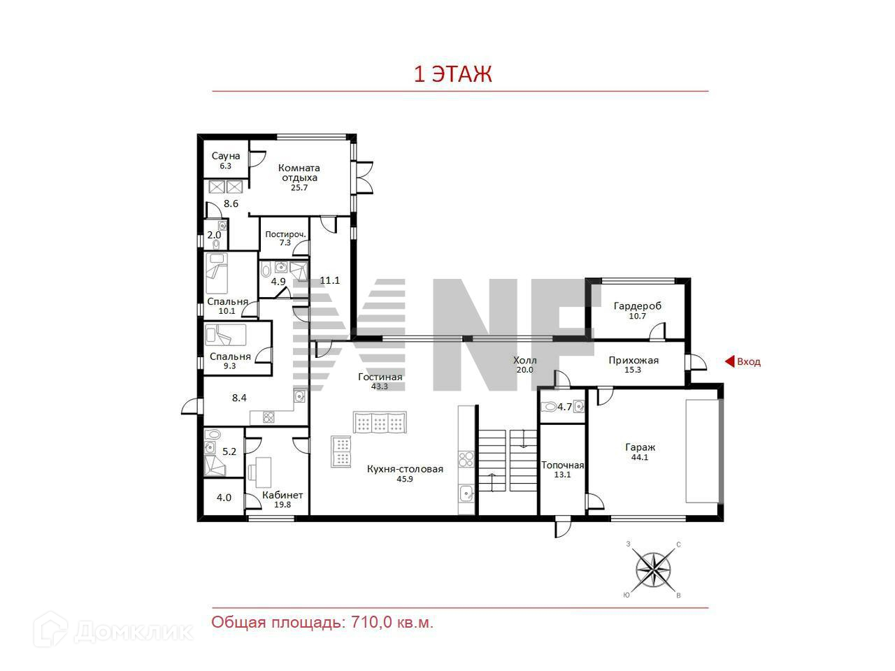 1 этаж: прихожая, гардеробная, с/у, кухня-гостиная-столовая, кабинет с с/у и гардеробной, коридор, постирочная, тренажерный зал, сауна, купель, с/у, душевые, блок для персонала с отдельным входом, 2-я спальнями, кухней и с/у;