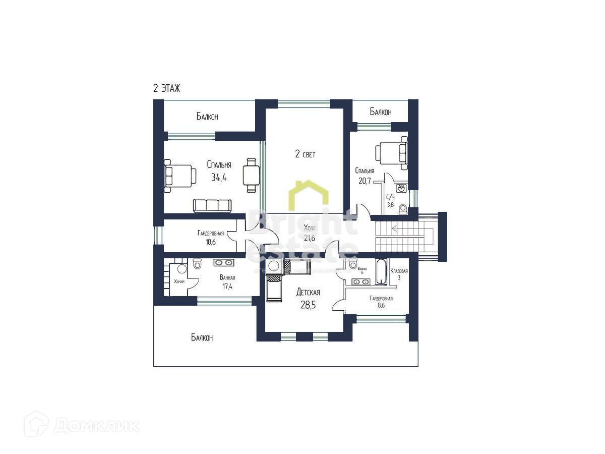 2 этаж: мастер-спальня с гардеробной, ванной комнатой и хамамом , спальня с гардеробной , спальня с с/у.