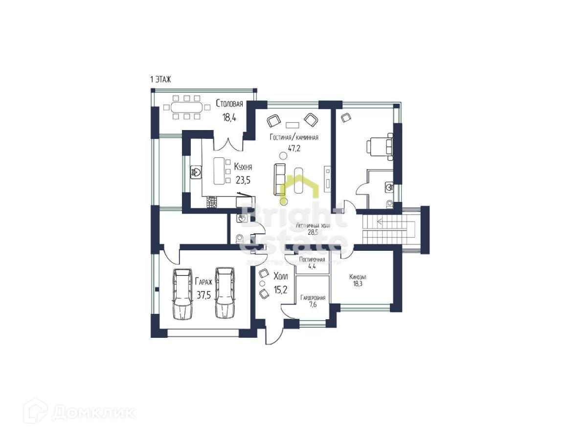 1 этаж: гостиная со вторым светом, кухня, столовая- крытая терраса, спальня с ванной комнатой, кинотеатр, прихожая, гардеробная, постирочная, с/у, гараж.