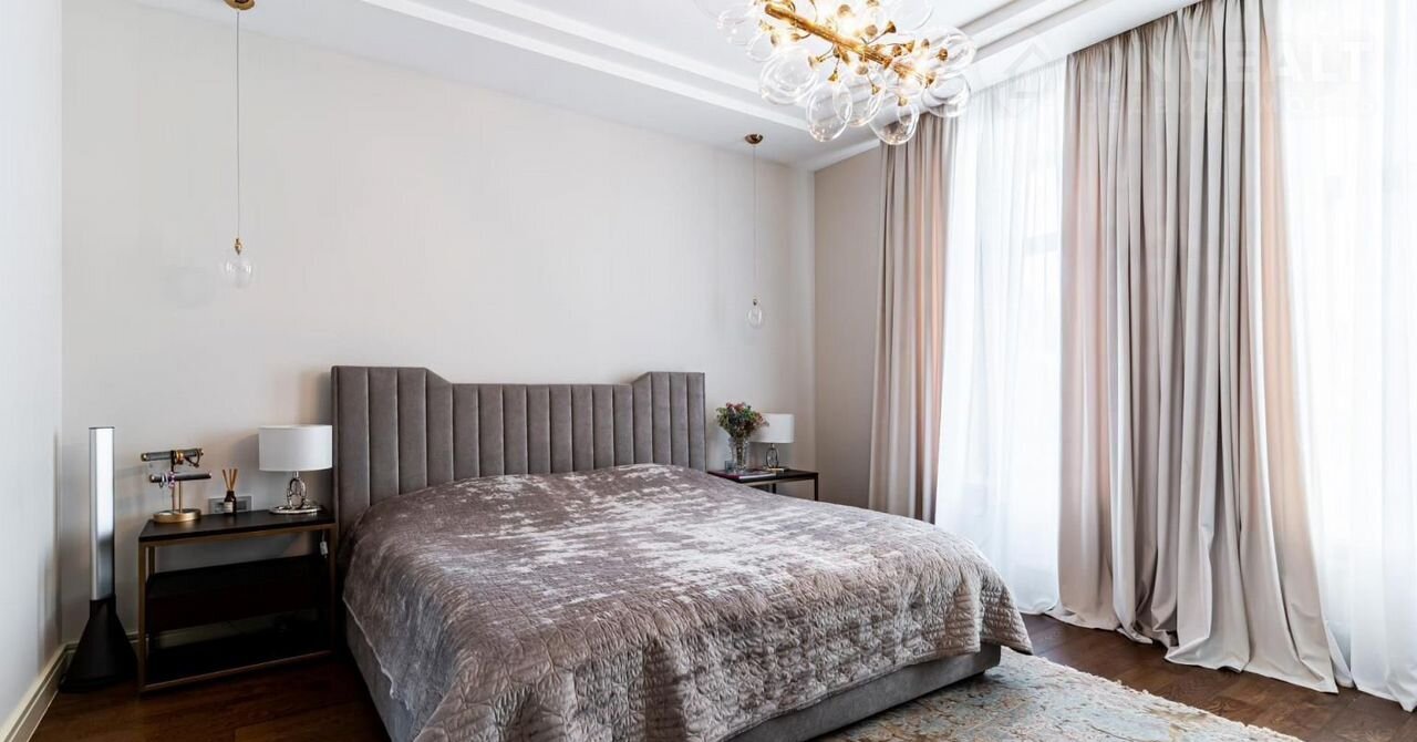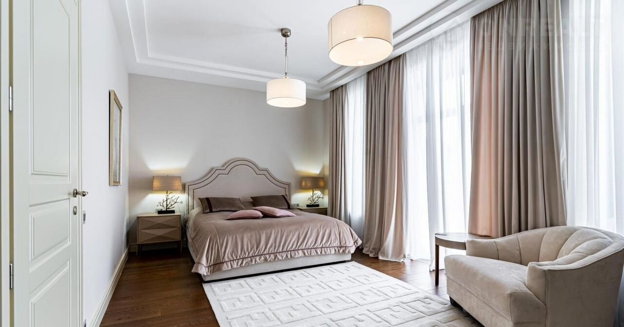 Гостевая спальня с ванной и гардеробной расположена на первом этаже. Еще 3 спальни размещены на втором этаже, две из них с балконами. Мастер-спальня занимает половину второго этажа.