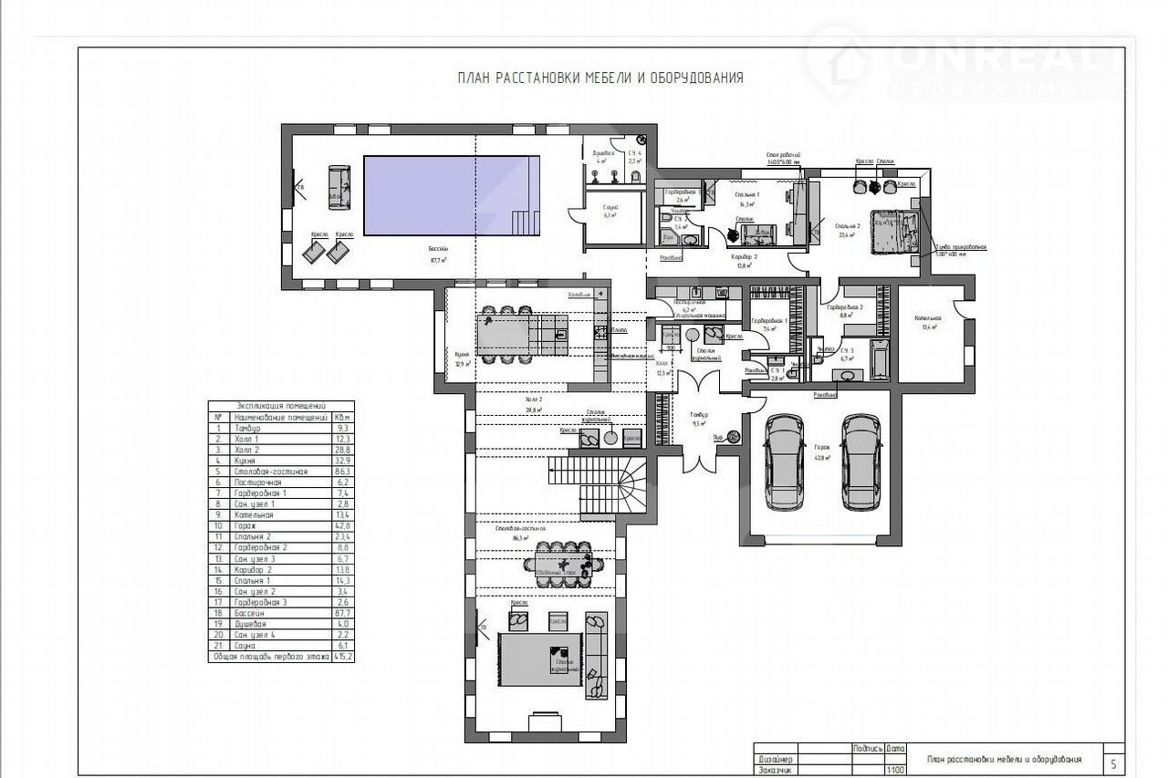 1 этаж: холл, гостиная-столовая, кухня, 2 спальни с с/у и гардеробными, СПА-зона (бассейн, сауна, душевая с с/у, зона отдыха), гостевой с/у, гардеробная, постирочная, котельная, гараж на 2 м/м;