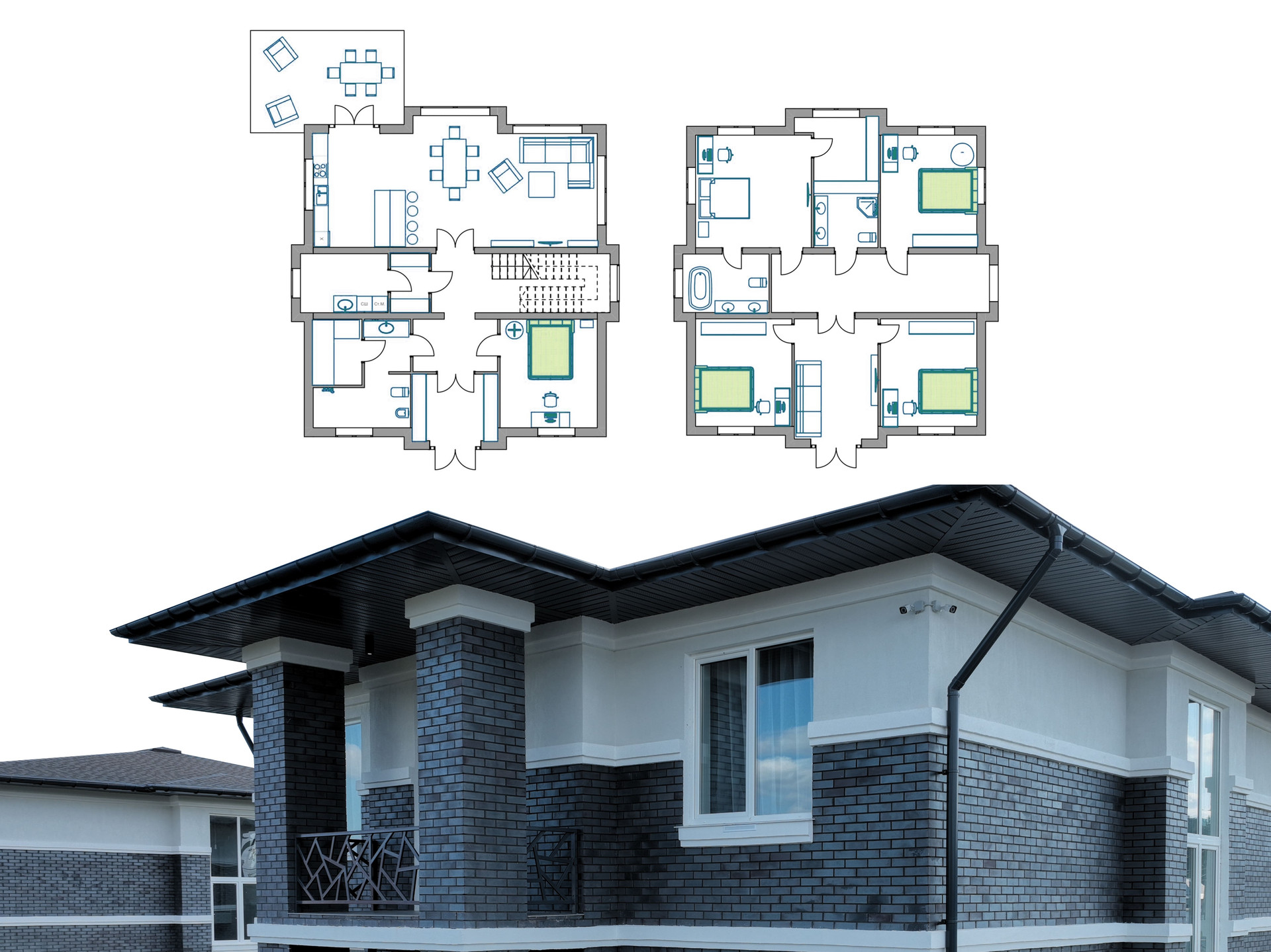 2 этаж: холл (можно использовать как детскую игровую, кабинет/библиотеку или зону отдыха), мастер спальня, санузел, три комнаты, балкон.