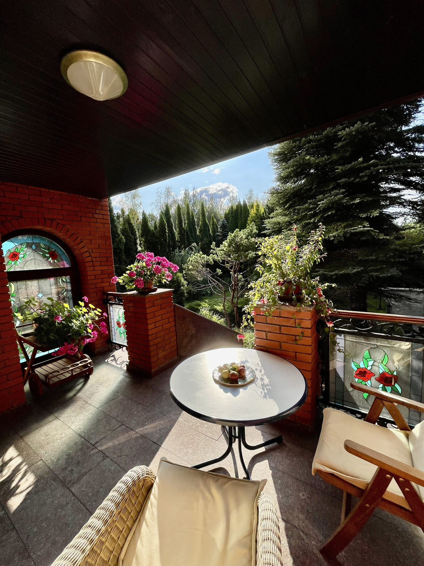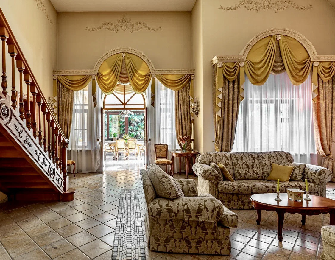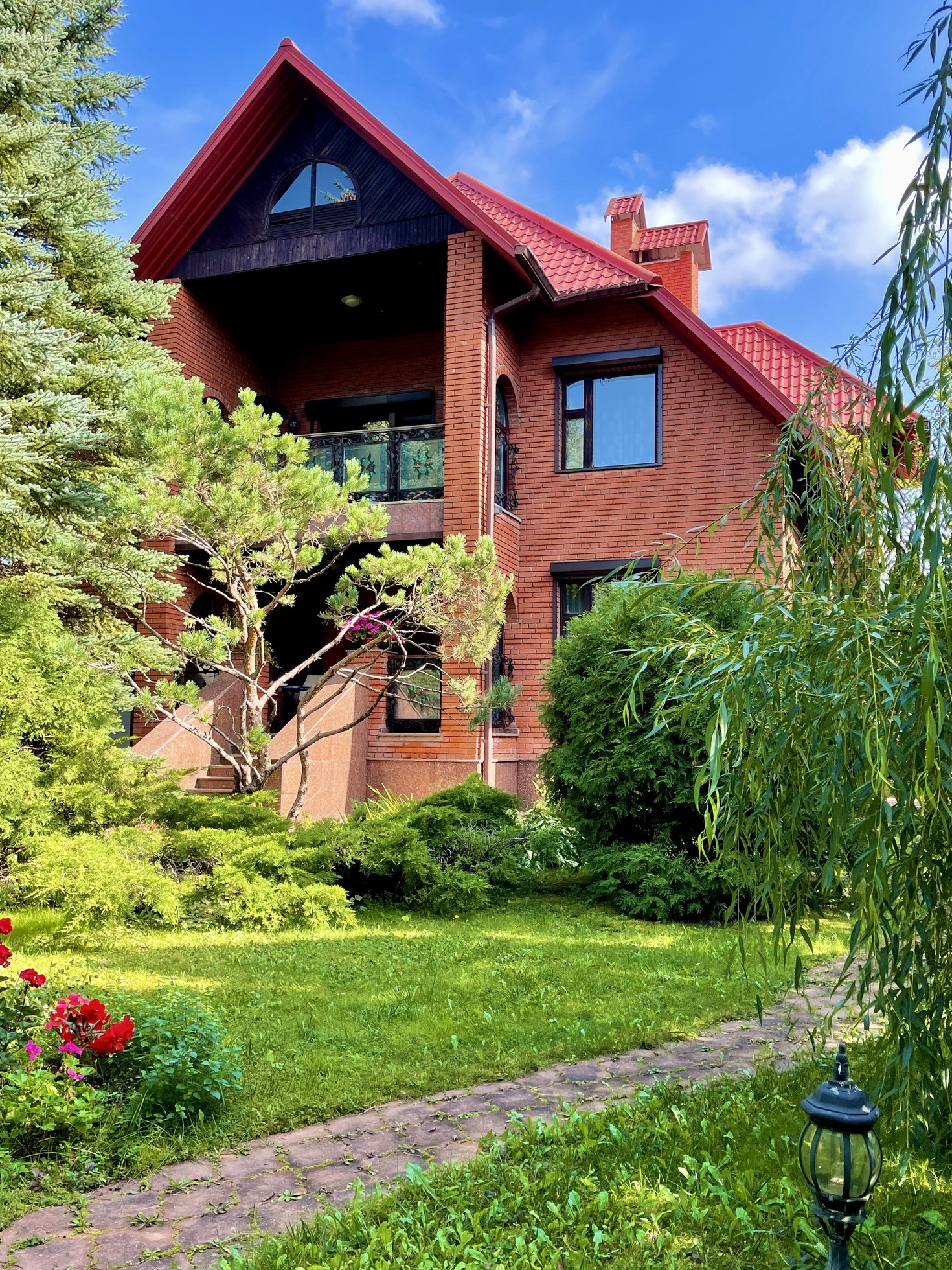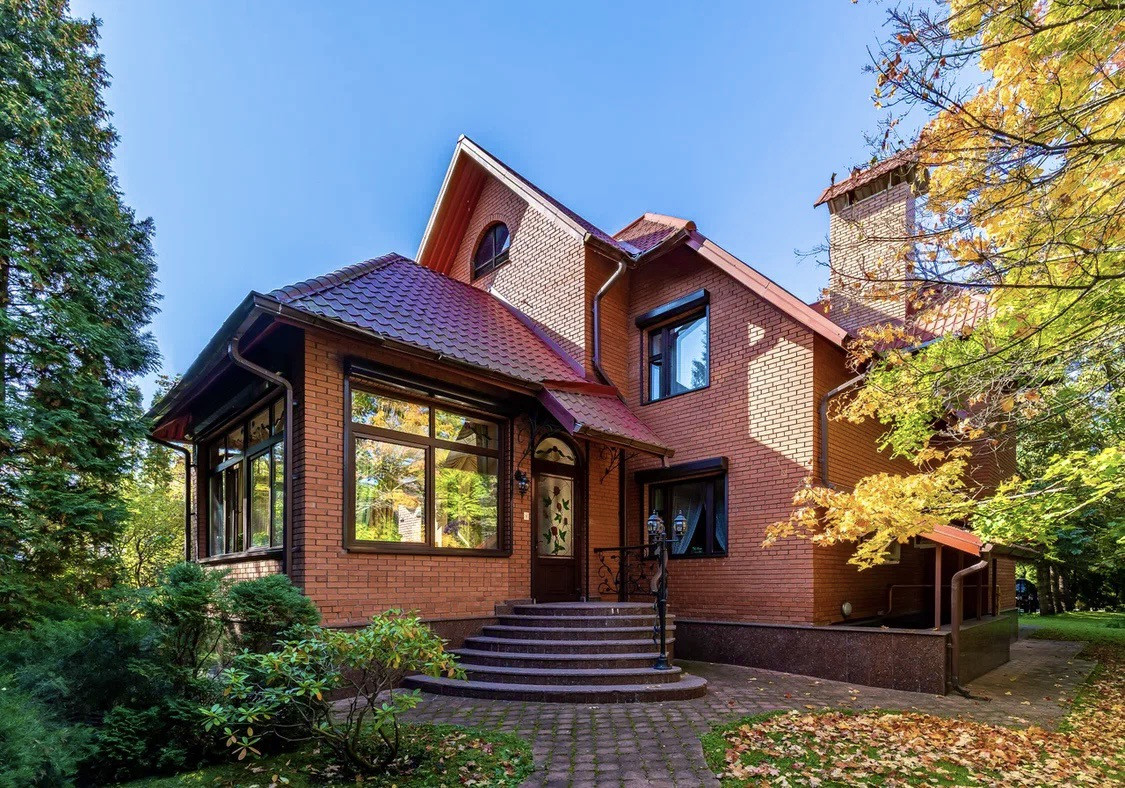 Трехэтажный кирпичный коттедж площадью 426 кв.м. (плюс 200 кв.м. мансарда) на участке 13,4 сотки, к нему примыкает участок 45 соток, который можно купить дополнительно. В доме 4 спальни и 5 санузлов. Дизайнерский проект, уникальные отделка и мебель.
