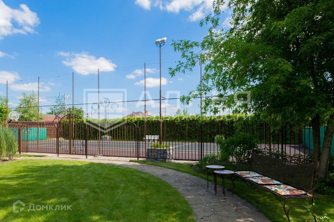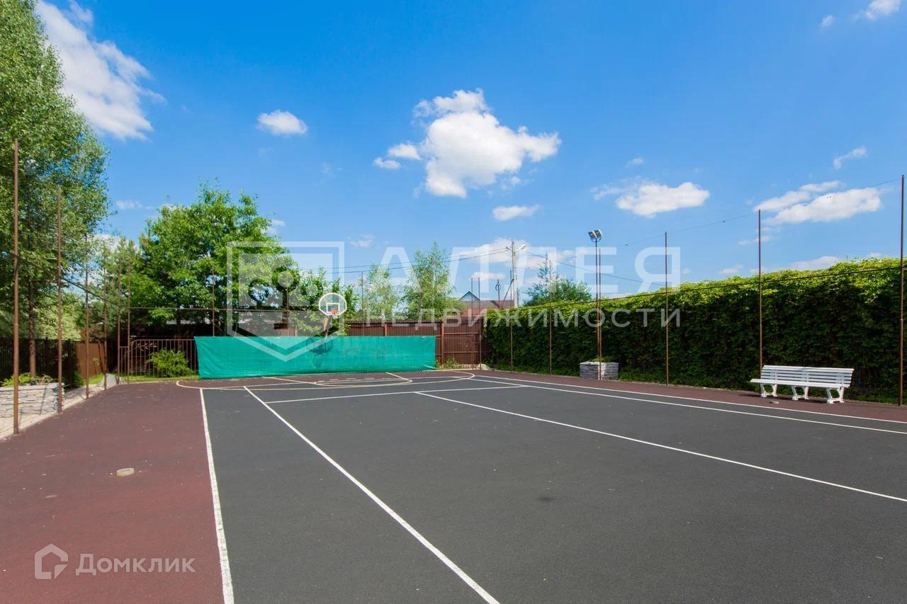 Участок: Участок с ландшафтным дизайном с умело вписанным в него теннисным кортом.По периметру участка установлен забор.