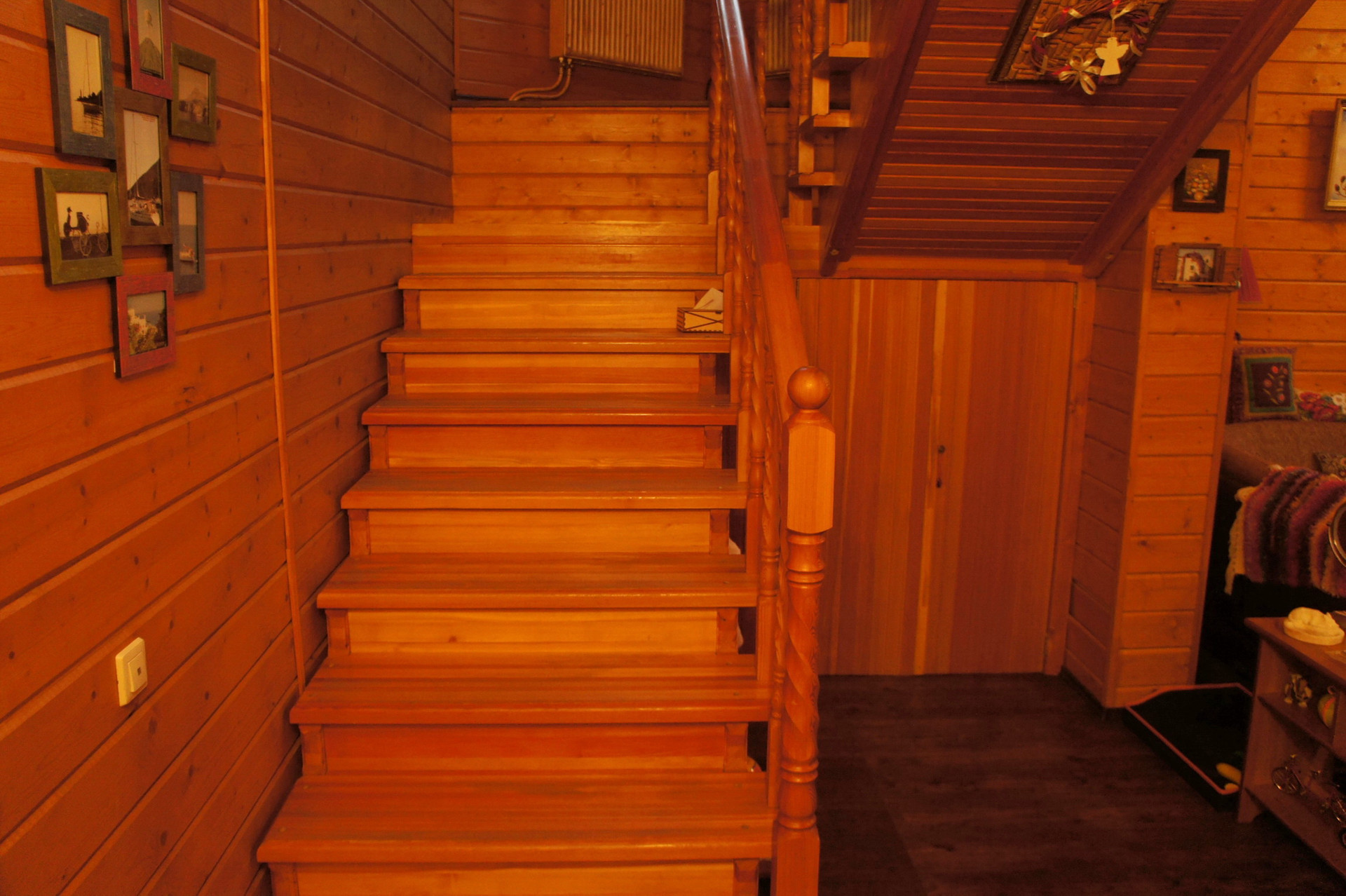 1 этаж: На первом этаже находятся: большая гостиная комната 24 кв.м. с высокими панорамными окнами и действующим камином фирмы Laudel , кухня с встроенной бытовой техникой, столовая 14 кв. метров с выходом на большую веранду с видом на сад и площадку барбекю, комната отдыха 10 кв. м. и гостевой санузел. Пол на первом этаже – дизайн-плитка ECOTILE - в гостиной и столовой – электроподогрев (devimat), на кухне плитка (подогрев водяной). Всегда тепло зимой. На второй этаж ведет крепкая деревянная лестница с большими окнами.