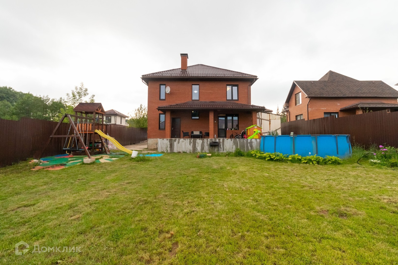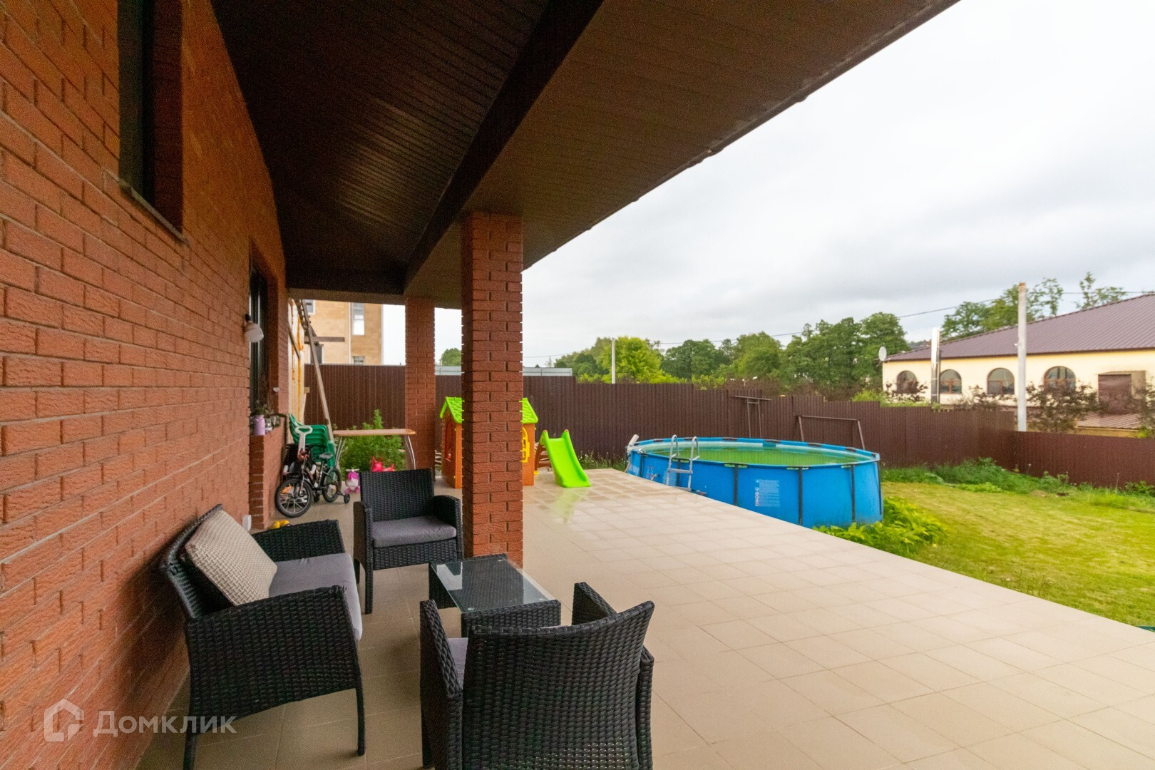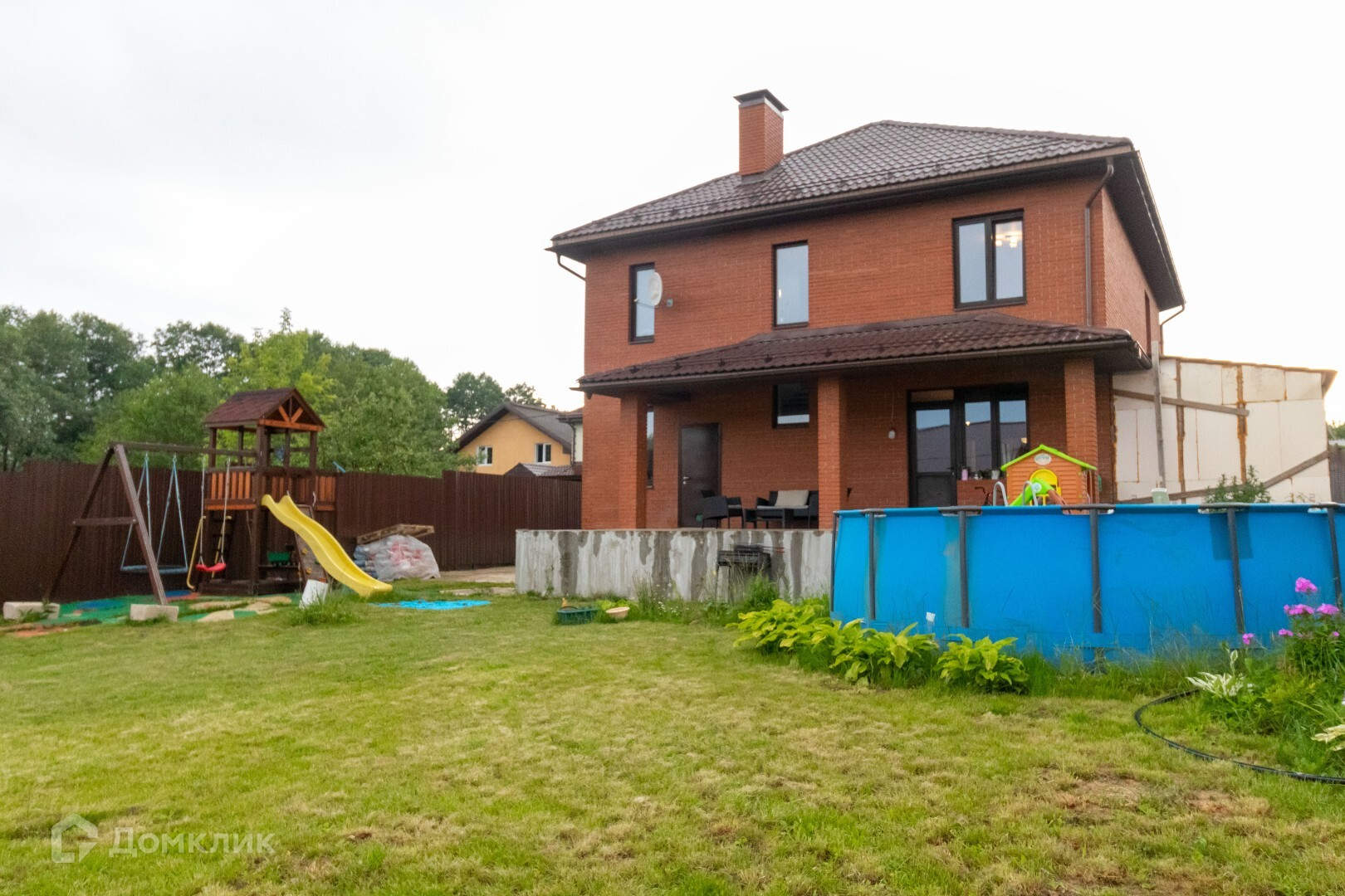На заднем дворе есть открытая терасса 40 кв.м,(выход с кухни),зона барбекю, установлен каркасный бассейн, наполняется теплой водой, детская площадка.
