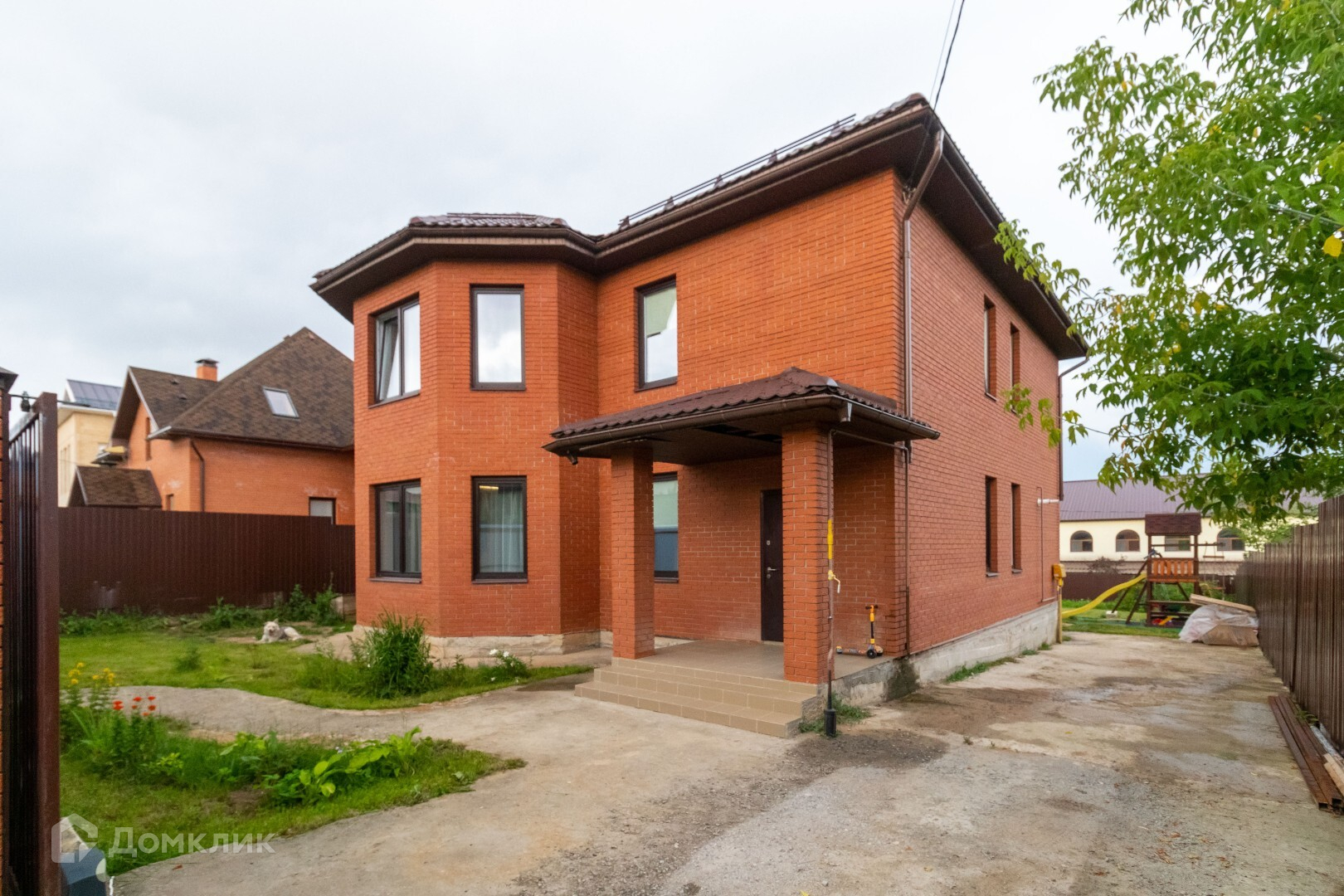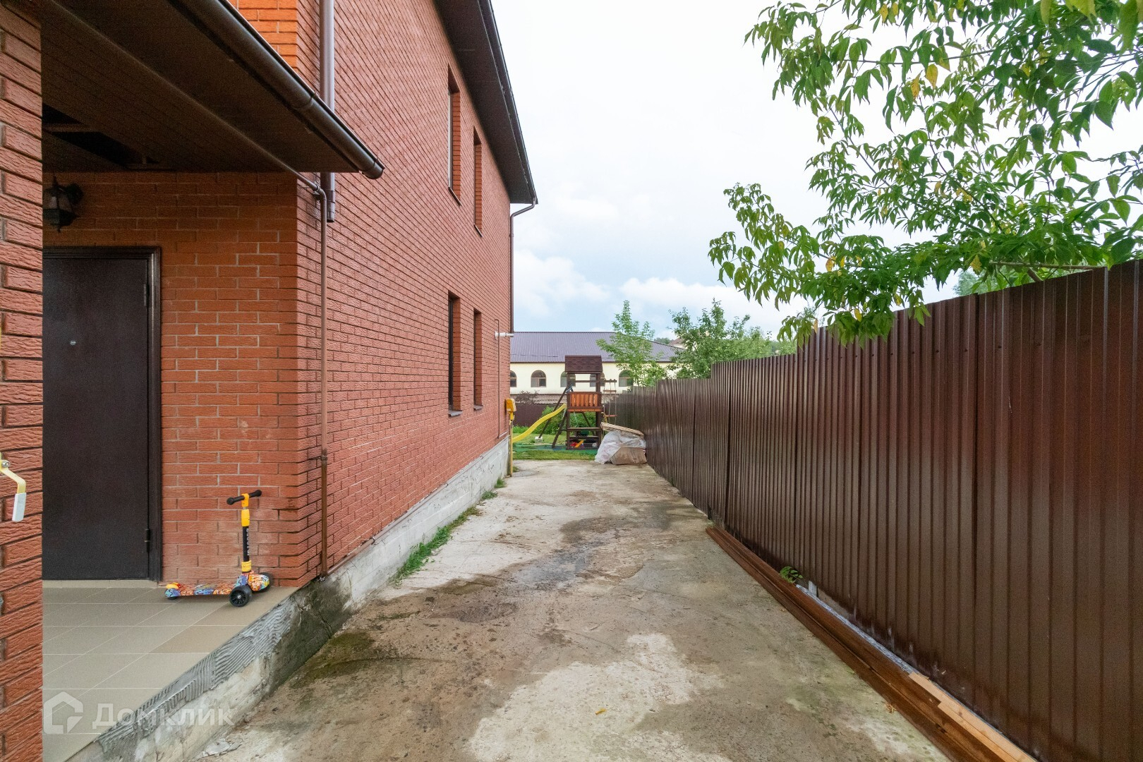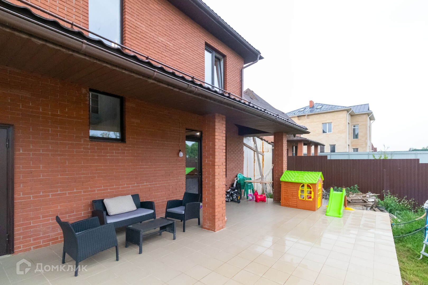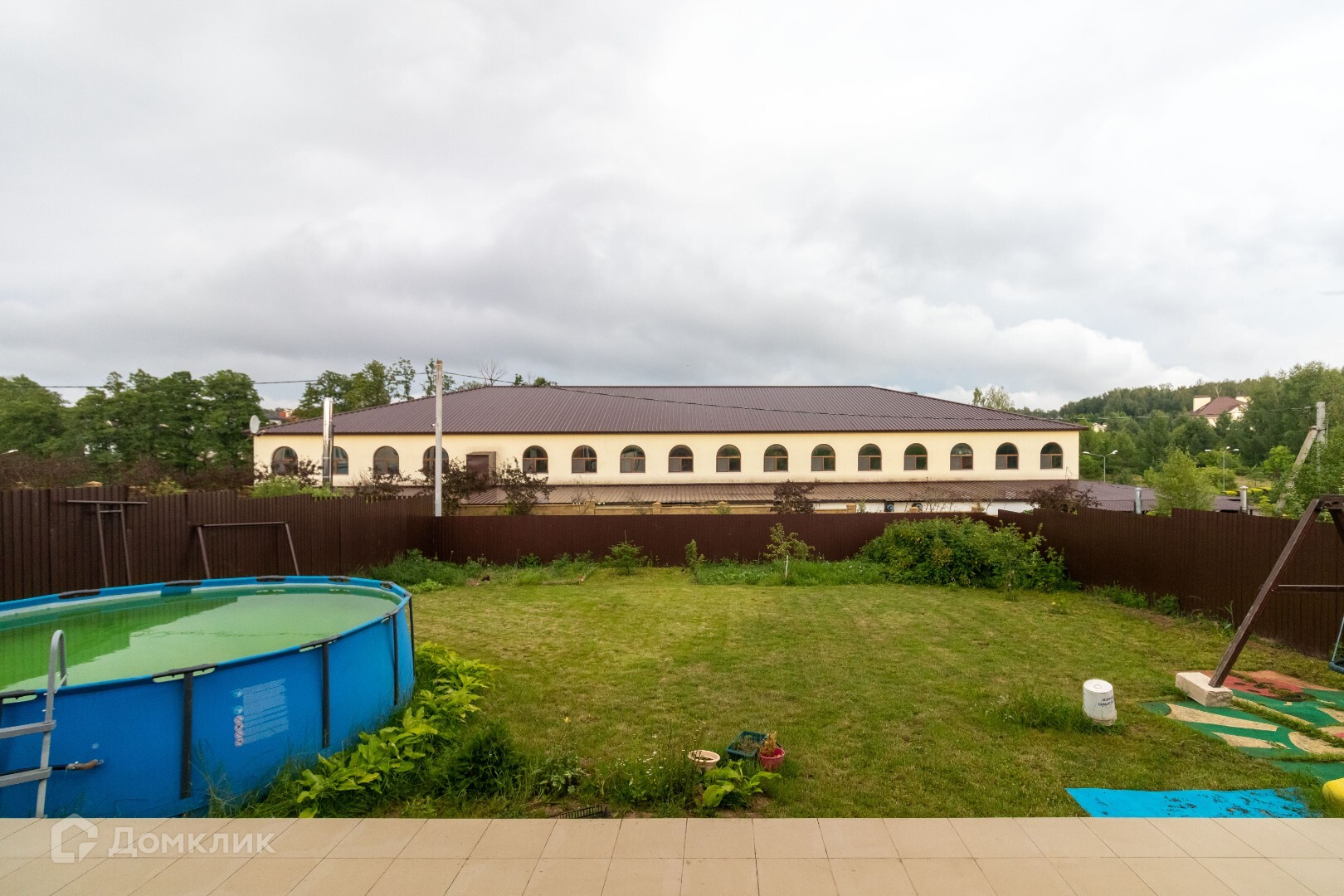 На заднем дворе есть открытая терасса 40 кв.м,(выход с кухни),зона барбекю, установлен каркасный бассейн, наполняется теплой водой, детская площадка.