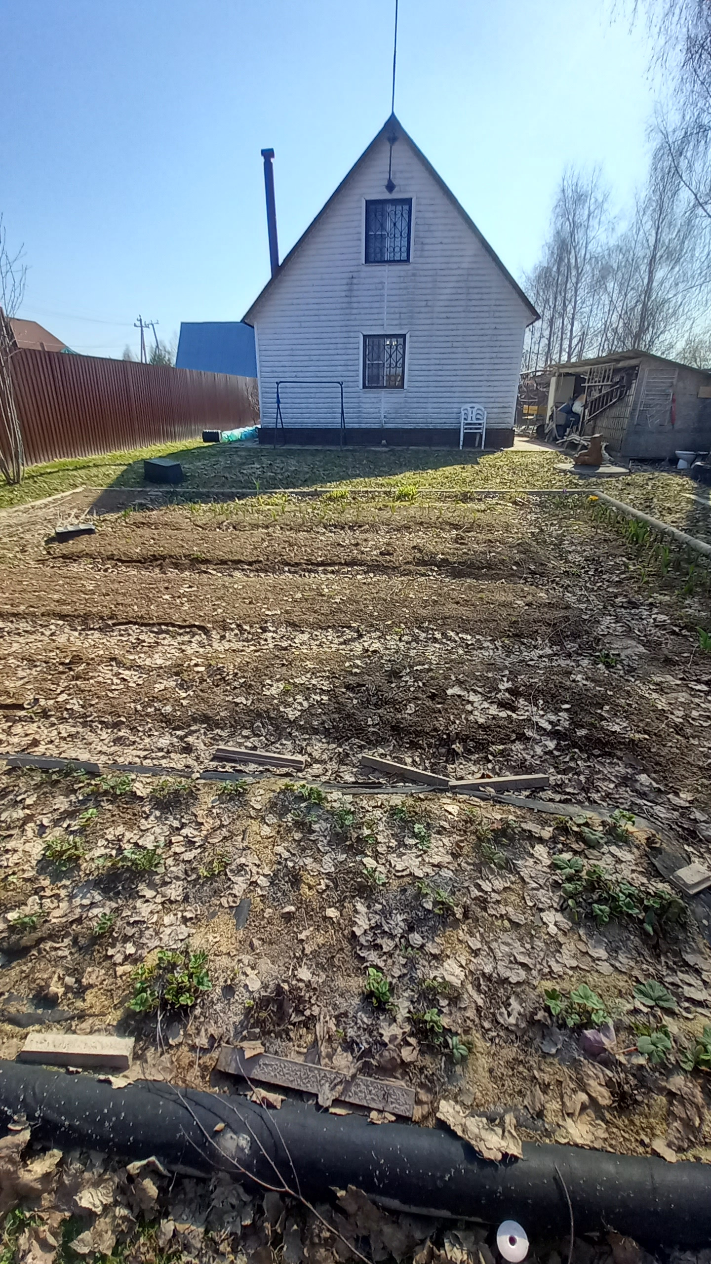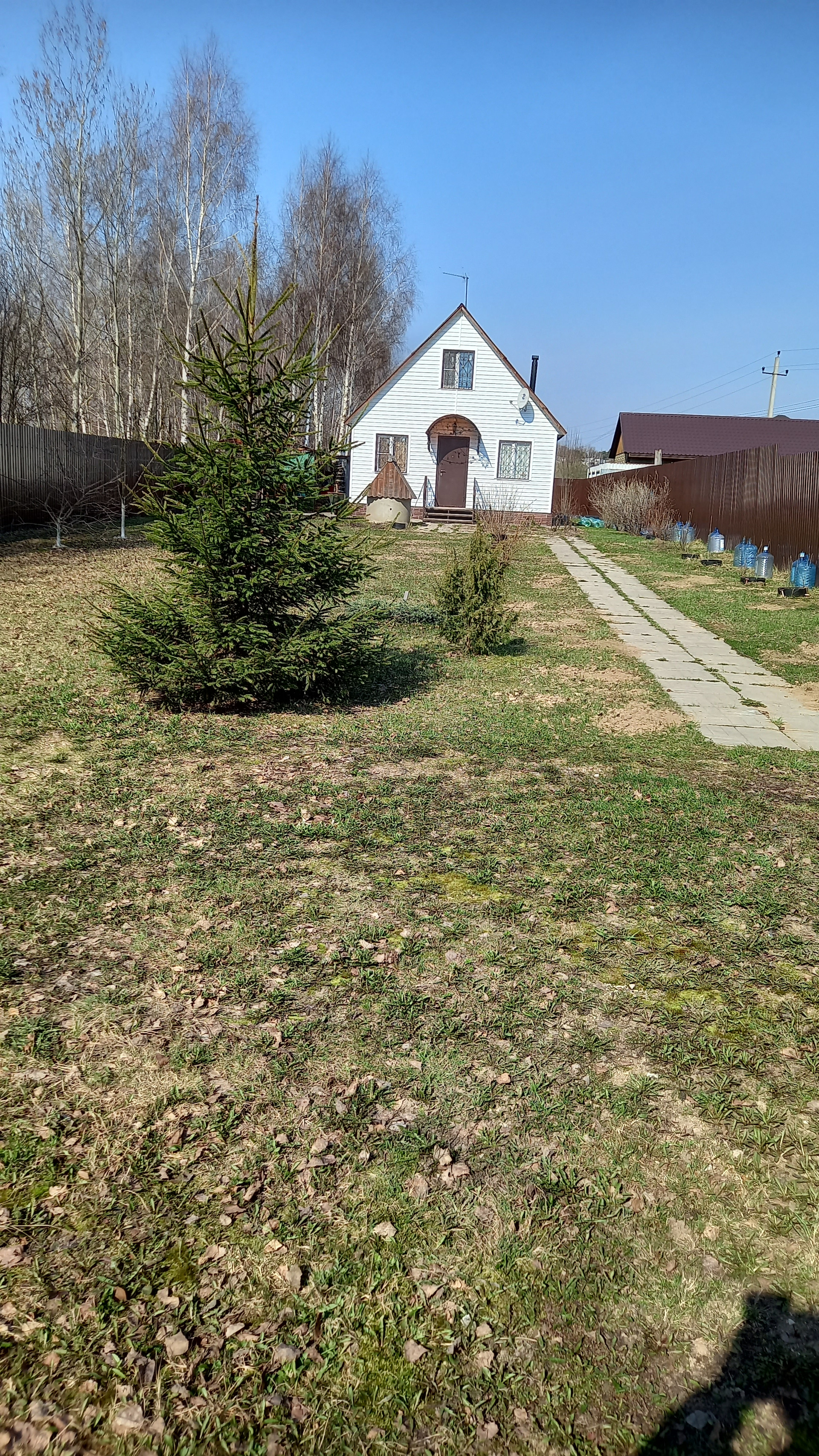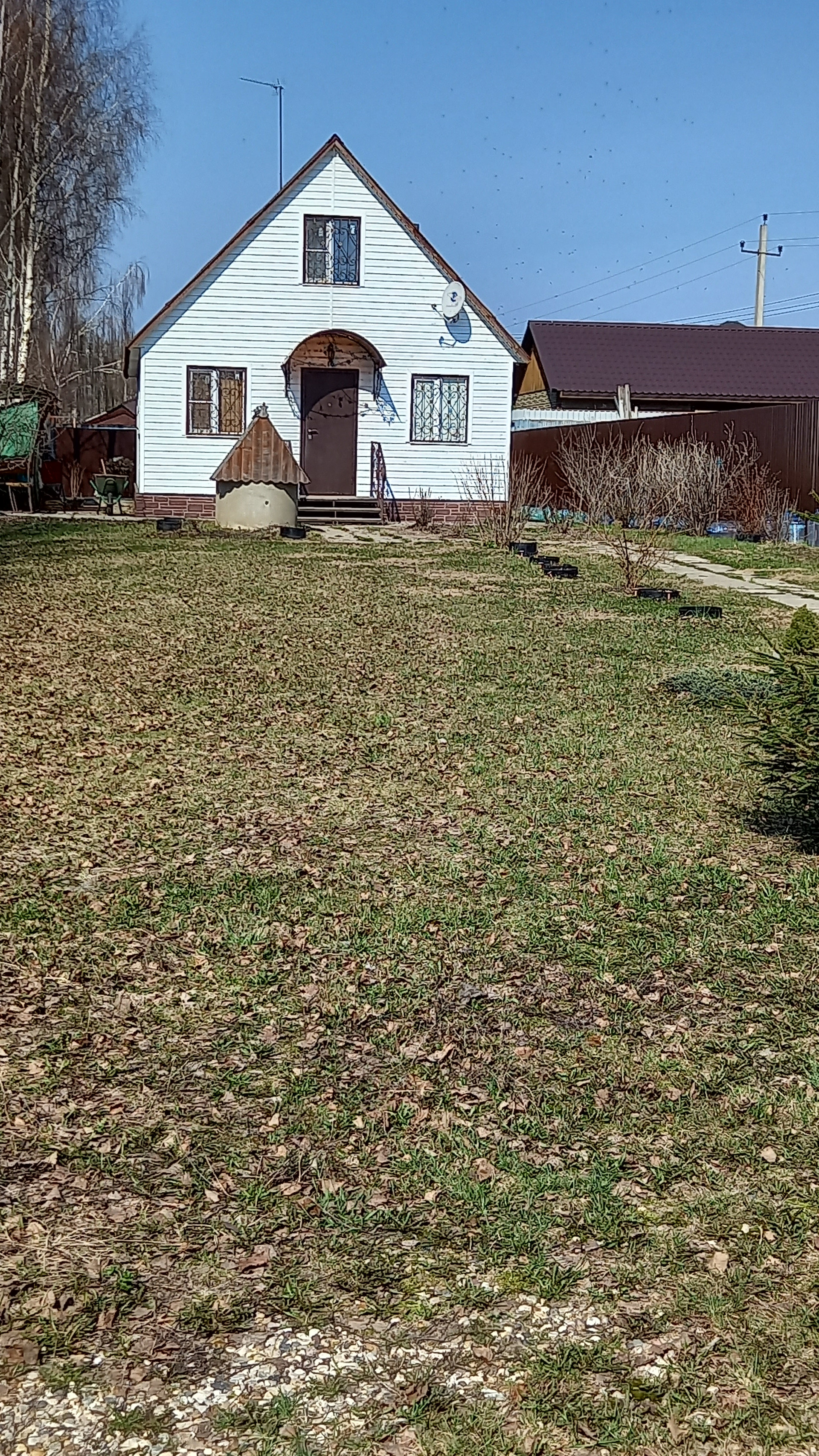 Участок ухоженный - правильной формы. Огорожен со всех сторон забором из профнастила. Перед домом газон, уголок из хвойников, вдоль забора с двух сторон плодоносящие слива, черешня, яблони, груша и другие кустарники. Перед входом в дом розарий. Также имеется зона отдыха - стол, скамейки под навесом, качели. За домом огород и вдоль забора большие березы. Сарай, дровница. Водоснабжение - колодец на 9 колец плюс насосы. Газ проведены трубы вдоль забора. В этом году планируется подключение всей деревни к газоснабжению.