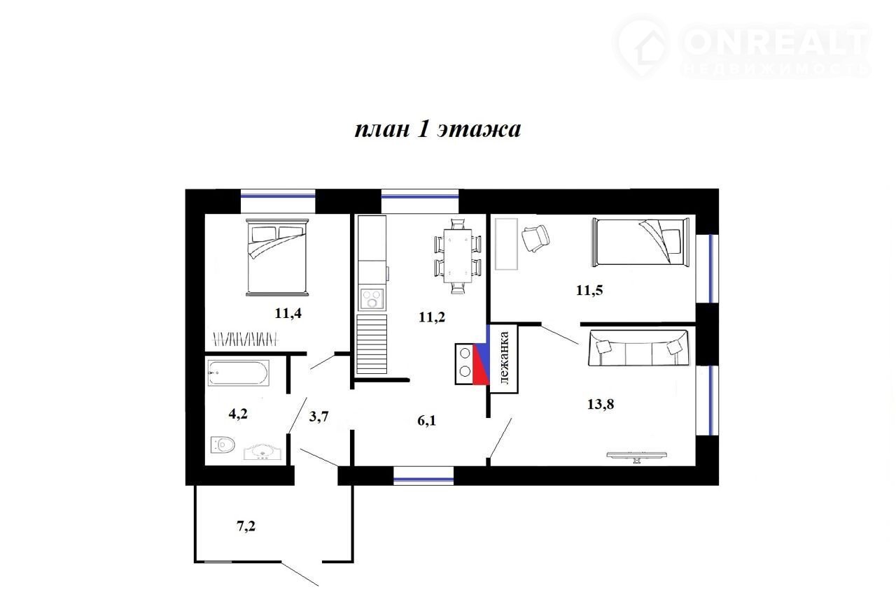 — жилой дом с мансардой 1996 года постройки. Площадь дома 61,9 кв.м., из бруса, фундамент — лента. Внутреннее пространство дома включает 4 комнаты, просторную кухню и душевую. Добротная функционирующая печь с лежанкой.