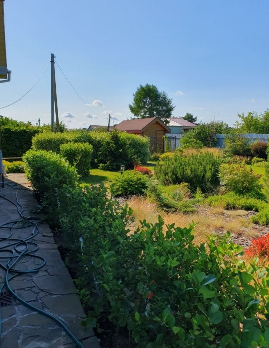 Участок ровный, правильной формы. На участке работает система полива газона. Территория огорожена забором с автоматическими воротами.