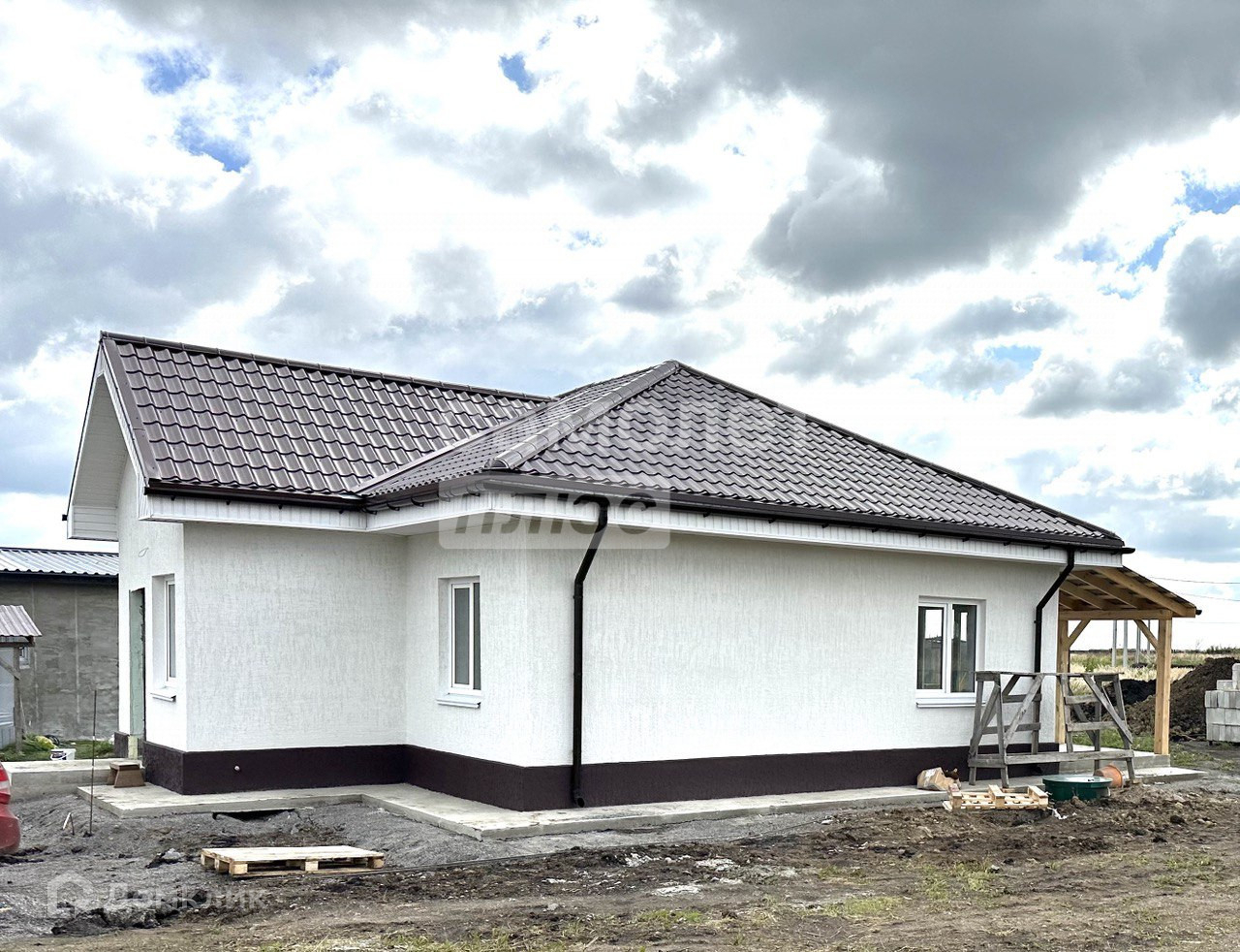 Дом построен из газоблока, утеплен и покрыт фасадной штукатуркой. Четырехскатная крыша, фундамент -  монолитная армированная плита.