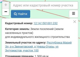 Продам участок 15 соток в живописном месте рядом лес и река Волга до Волги 1 мин.от Казань 1 час 10 мин в Республике Марий Эл деревня Чуваш Отары до города Звенигово 2 мин ,деревня находится в городе по береговой линии .15 соток.один собственник, документ в порядке кадастровый номер:12:14:1501001:198 |
