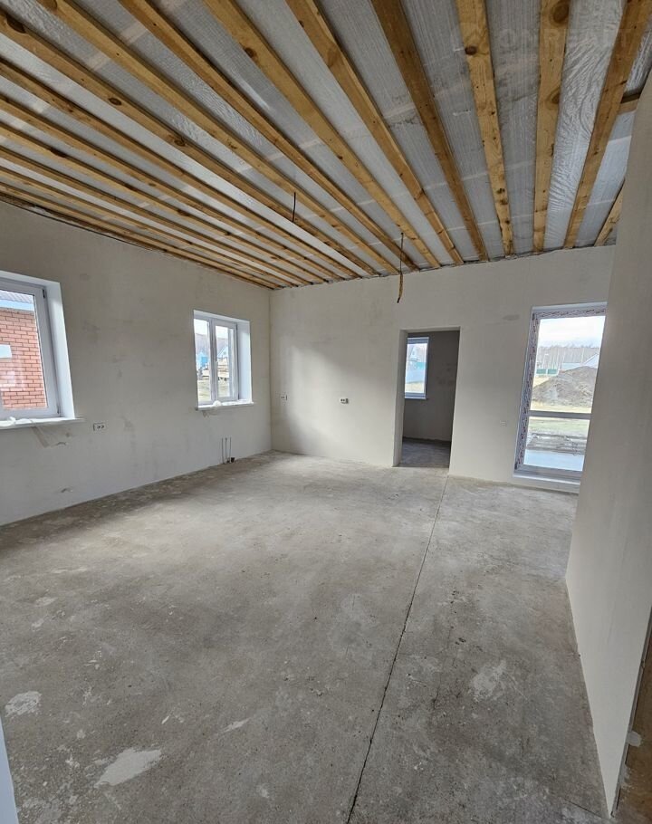 Дом построен качественно, усадку не даст. Полный шлакоблок с утеплением снаружи 10 см, заштукатурен и покрашен кароедом. В доме будут натяжные потолки.