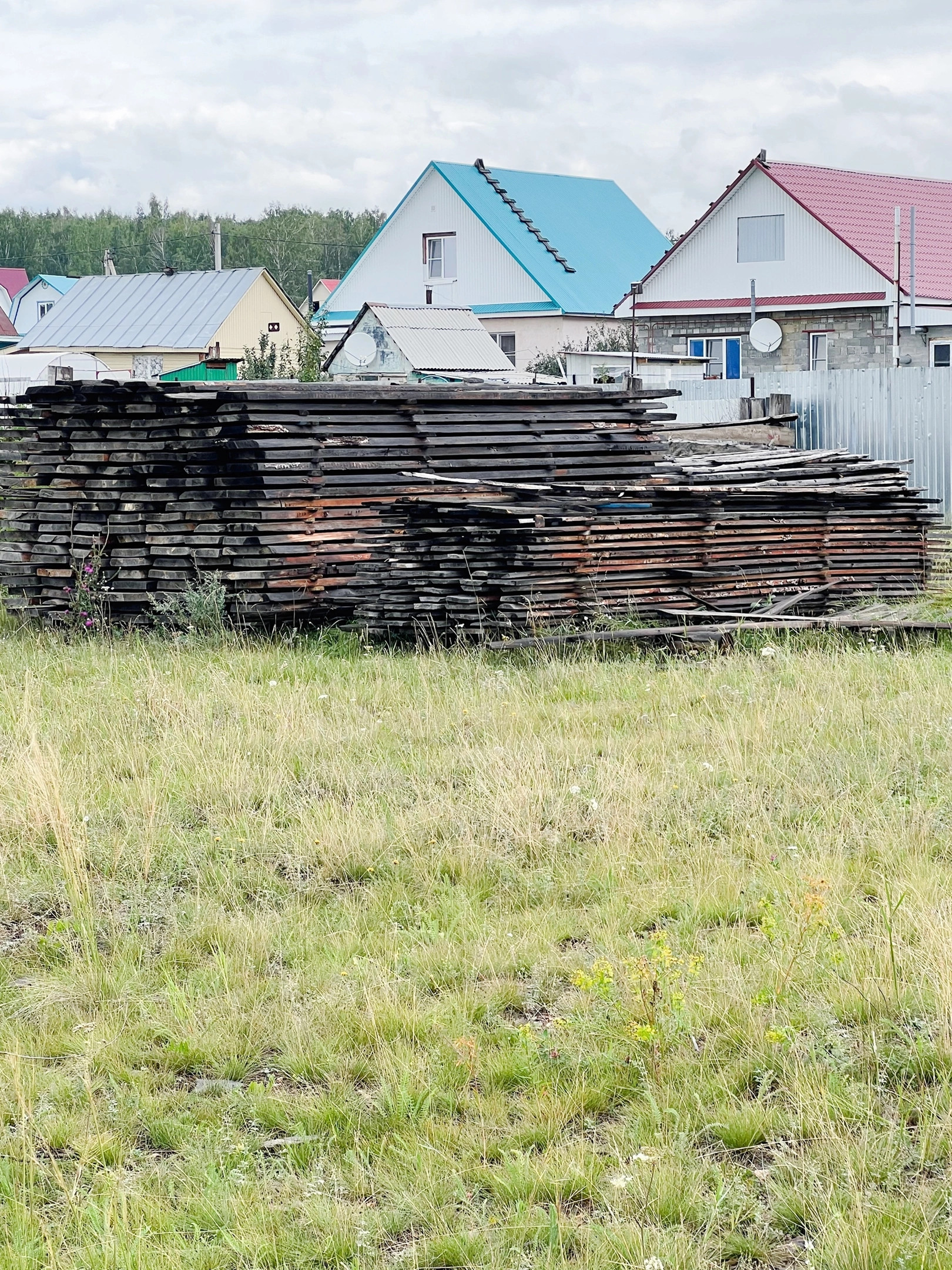 Продам участок с коробкой (бревно) 8х9 под крышей, на монолитном фундаменте, с материалом (доски)