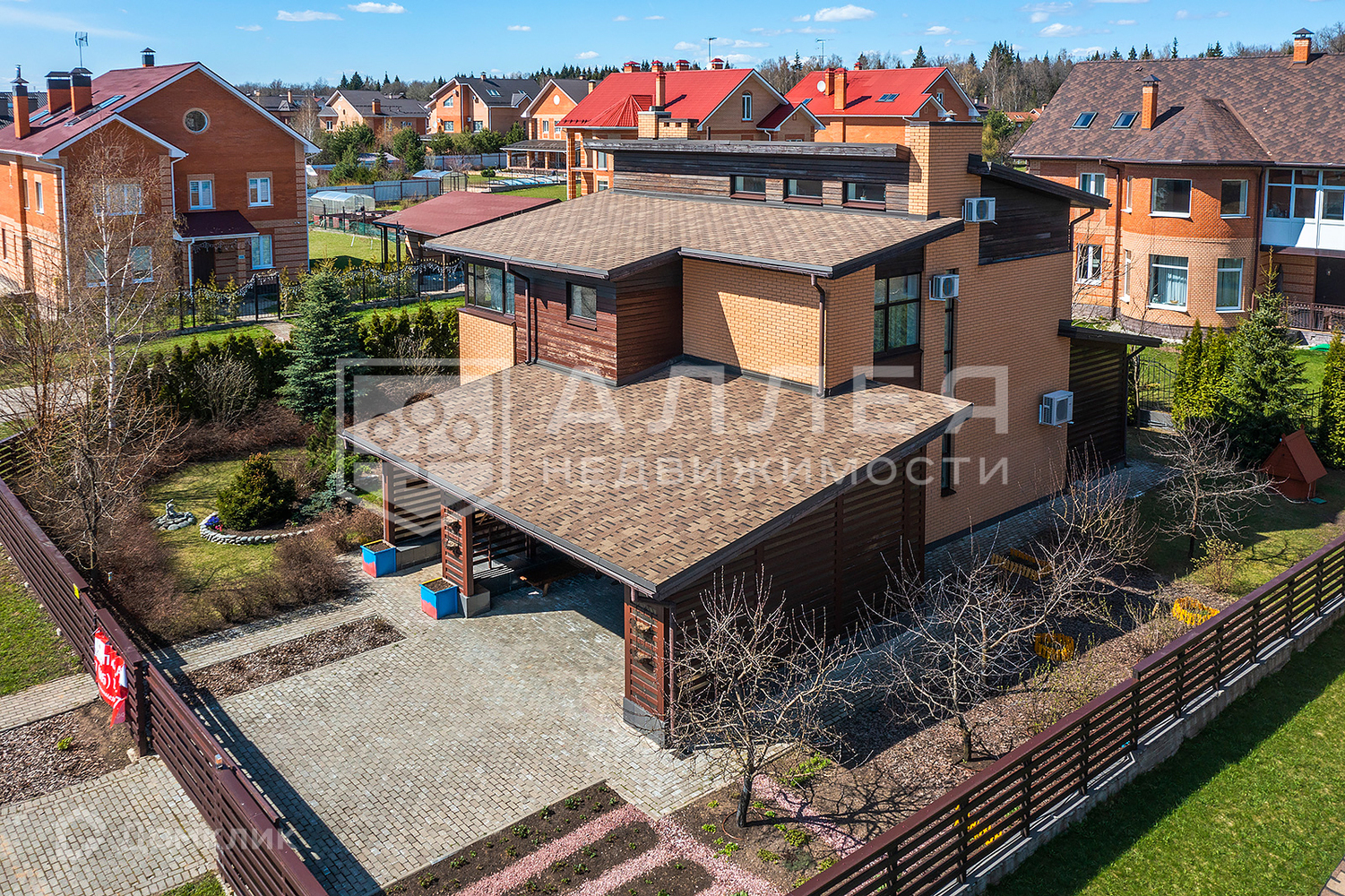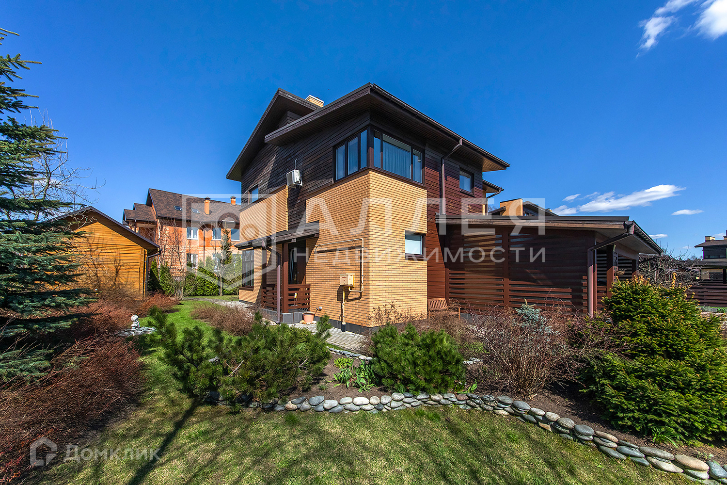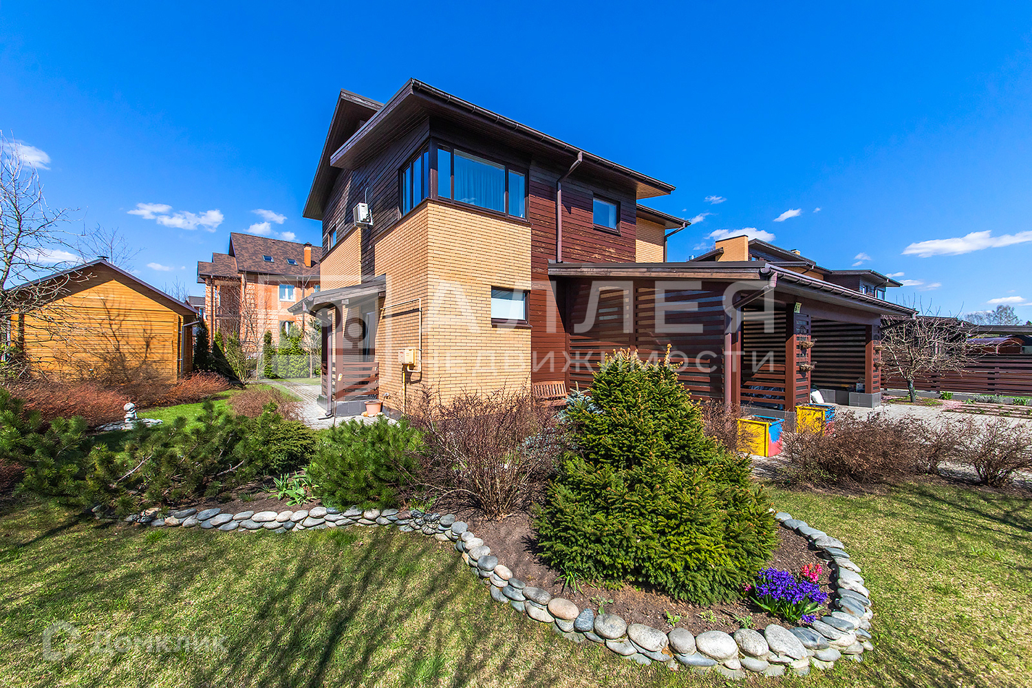 Участок: Ровный участок правильной формы с ландшафтным дизайном. Есть баня на дровах. Навес на две автомашины. Высажены взрослые деревья, выложен газон. Дорожки из брусчатки. С участка открывается замечательный вид на лесной массив, который окружает поселок со всех сторон. Все соседи построились и живут круглогодично.