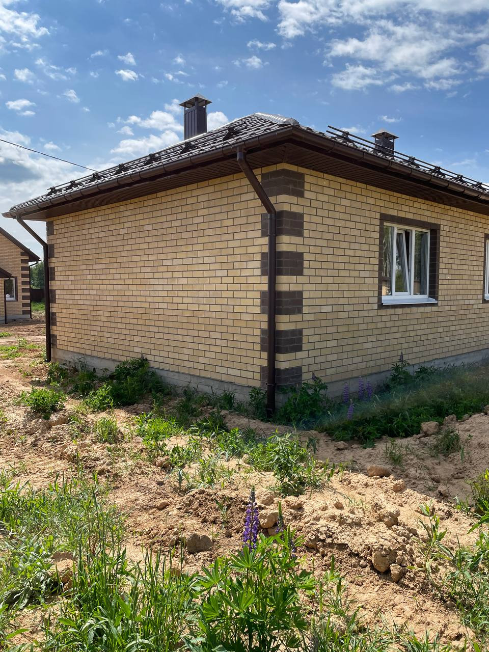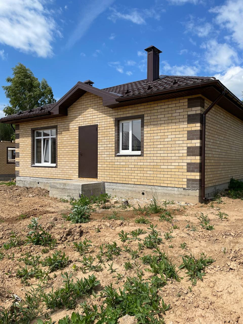 Дом с крыльцом: фундамент, ж/б перекрытие, стены (55 см: блок с облицовкой кирпичом), окна, дверь, крыша с утеплением.