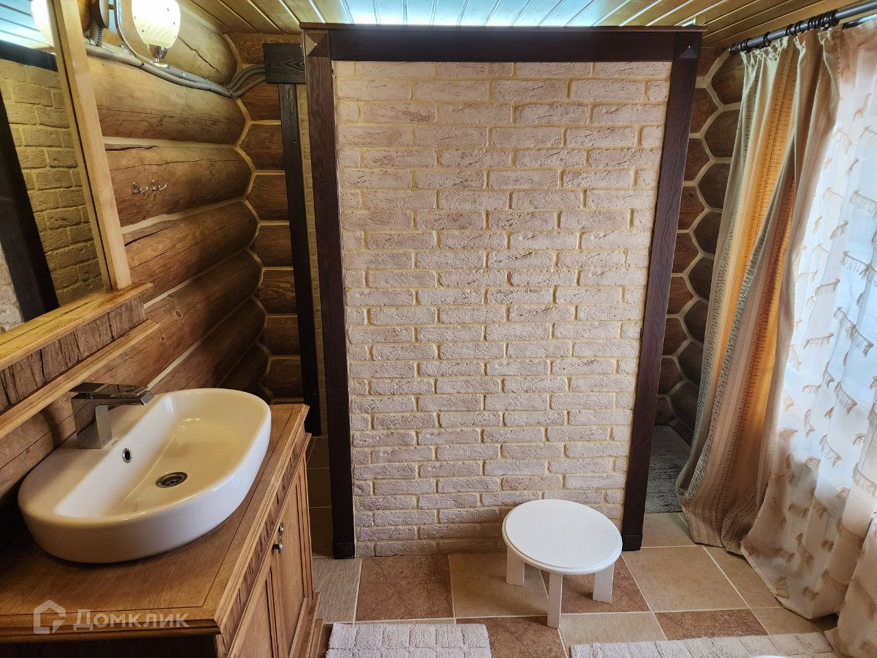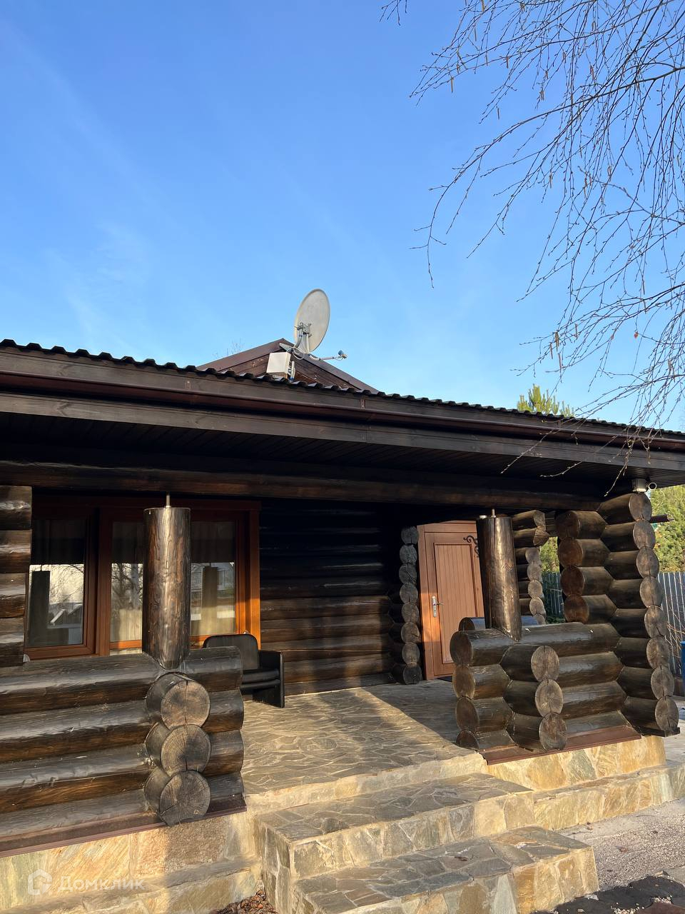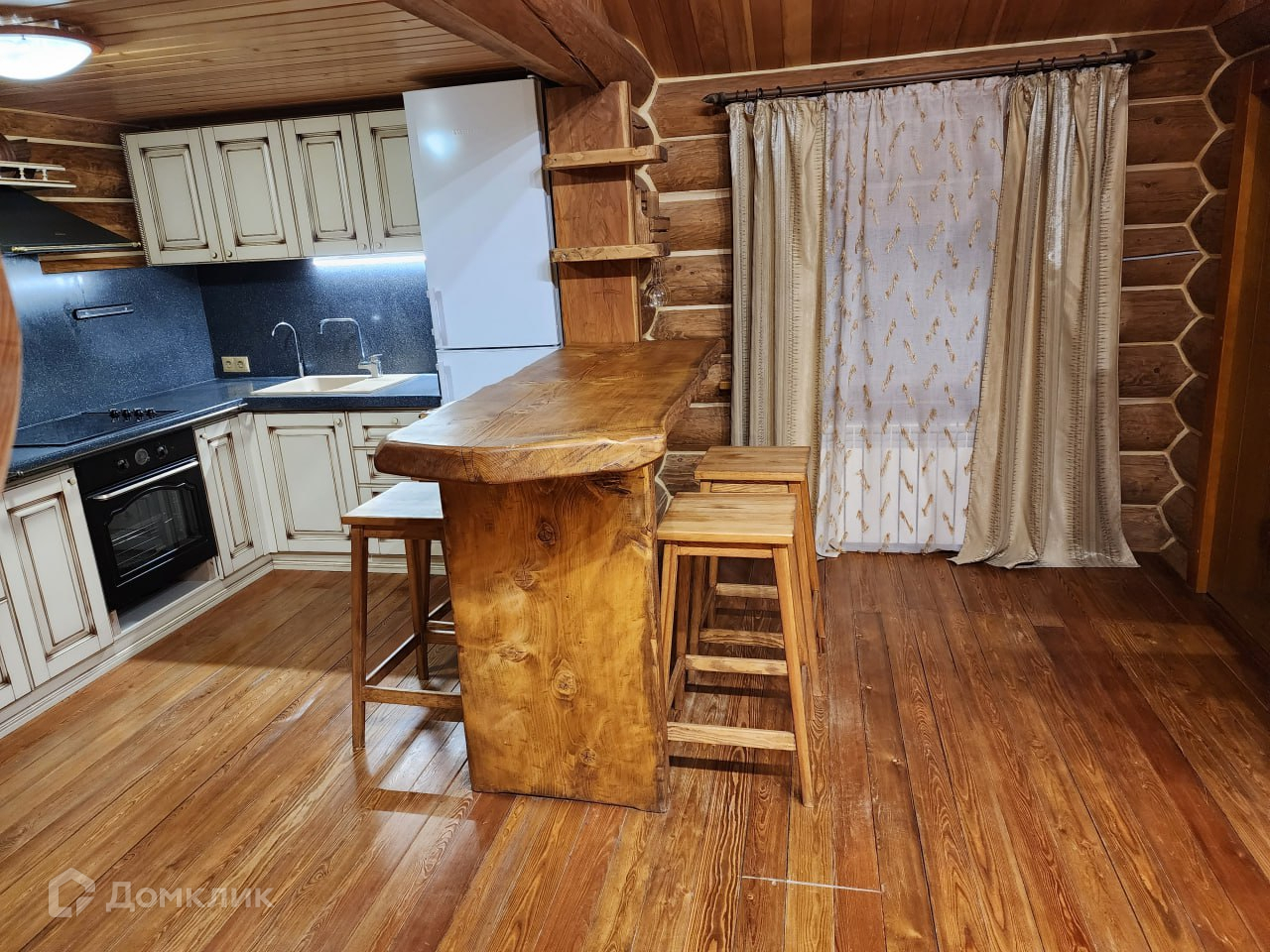 Дом 100 м2 из бревна большого диаметра покрытого маслом с теплым швом, что делает помещение энергоэффективным — в жару прохладно, в мороз без теплопотерь. Низкие затраты на содержание.