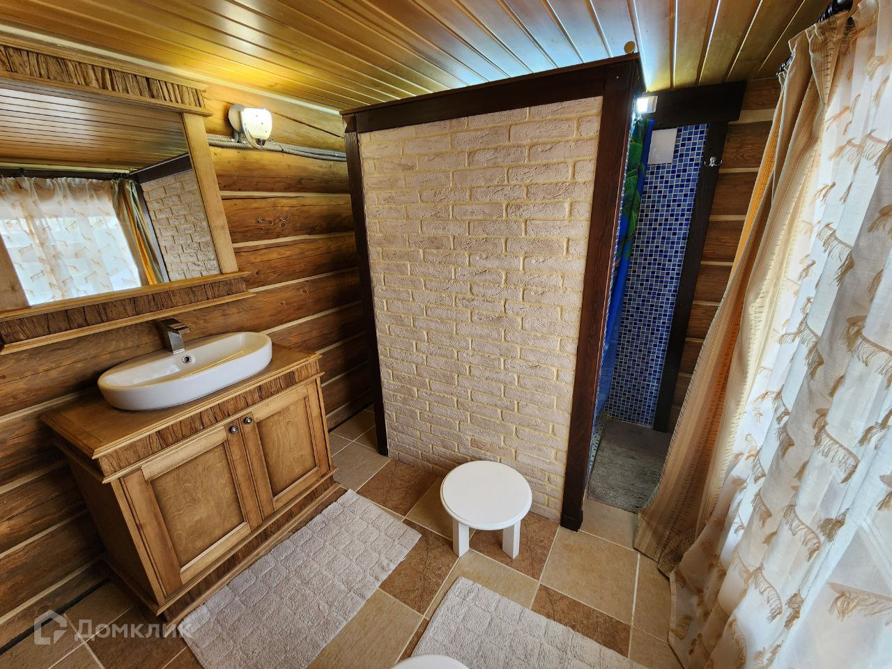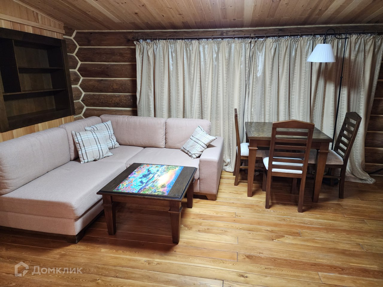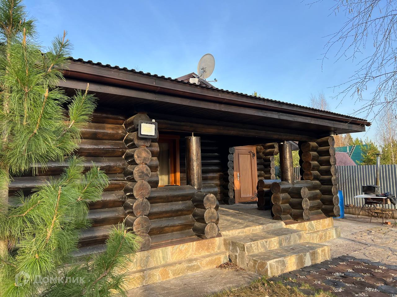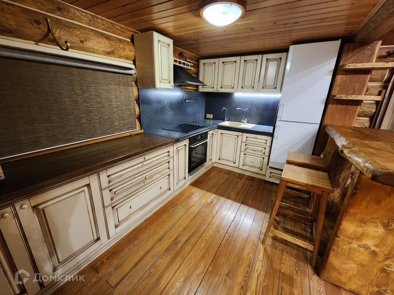 Дом 100 м2 из бревна большого диаметра покрытого маслом с теплым швом, что делает помещение энергоэффективным — в жару прохладно, в мороз без теплопотерь. Низкие затраты на содержание.