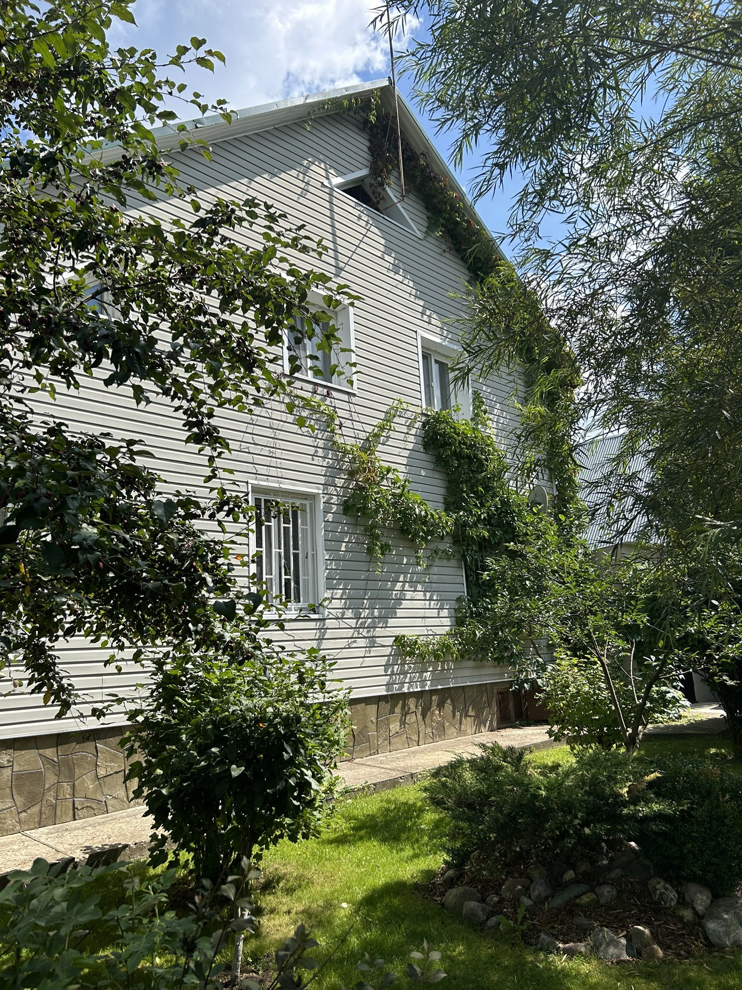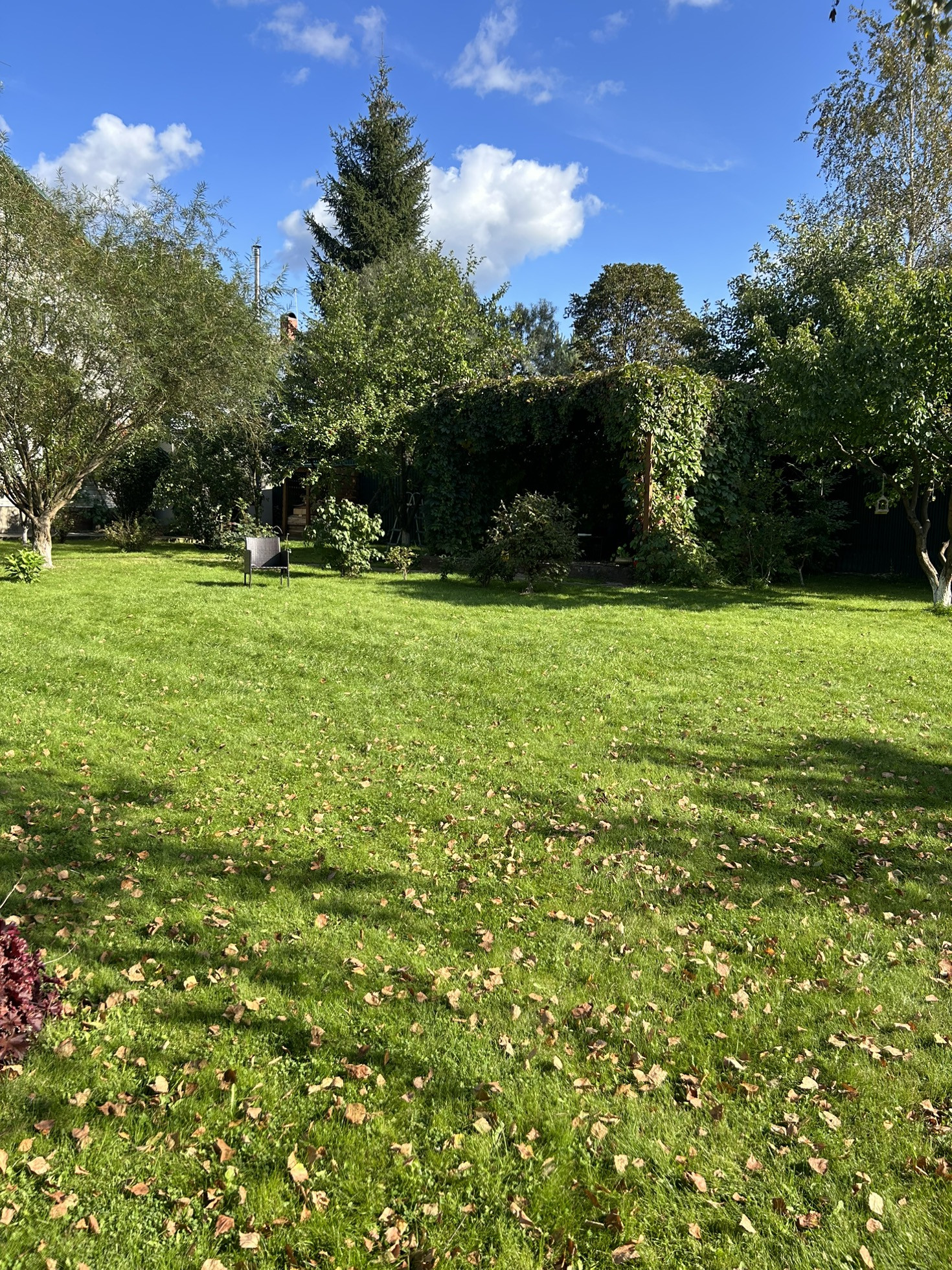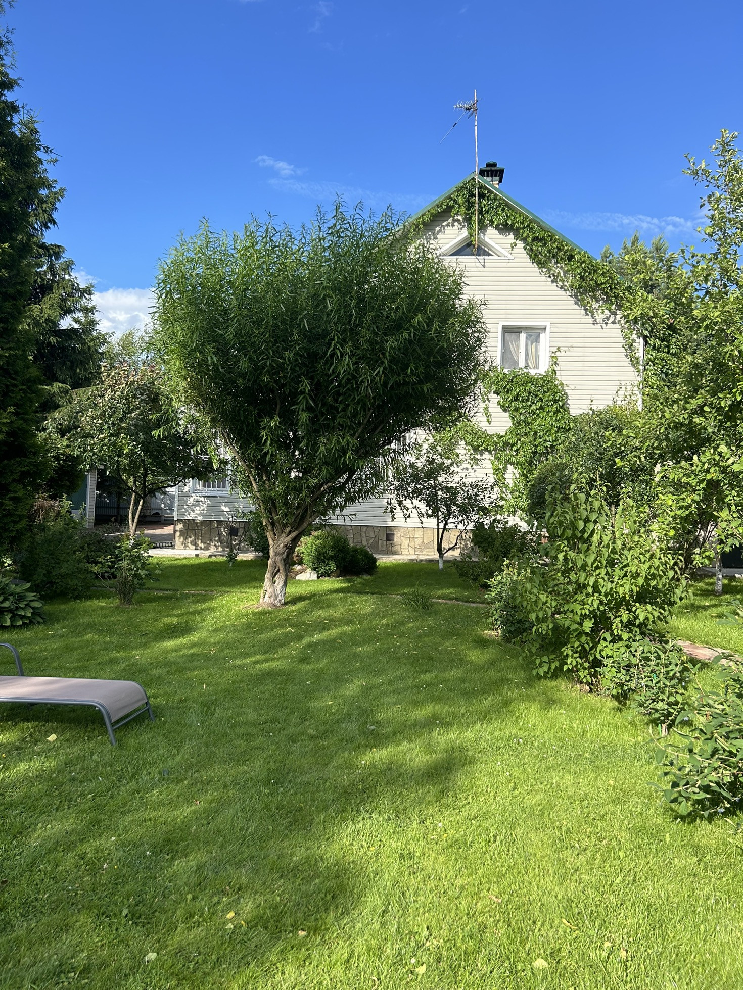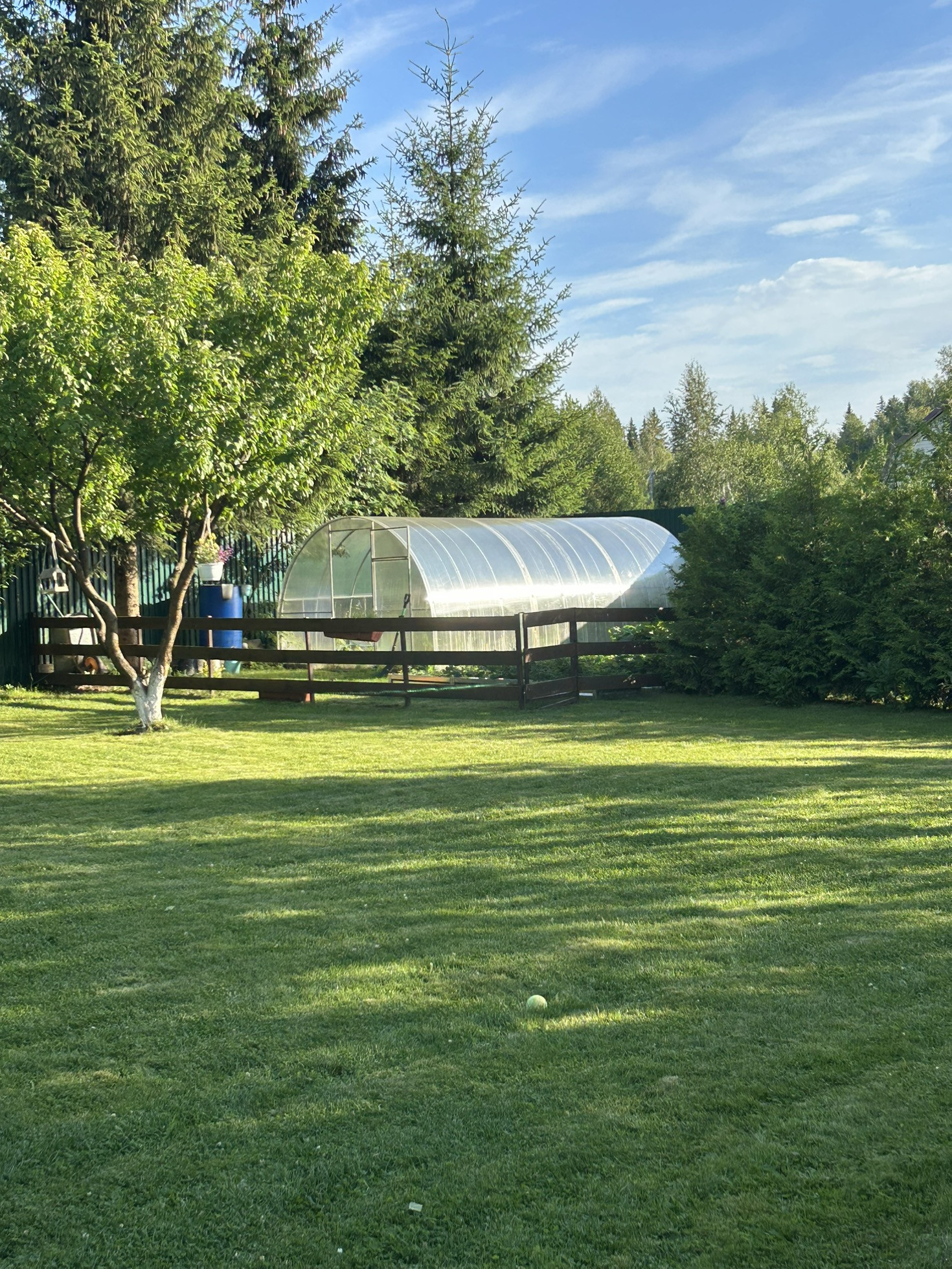 На участке имеется: баня (5*7), летняя кухня, котельная, туалет летний, детская площадка, парник, гараж, навес на 1 машину, веранда, парковка на 3 машины, зона барбекю, фруктовые деревья, вольер для собаки.