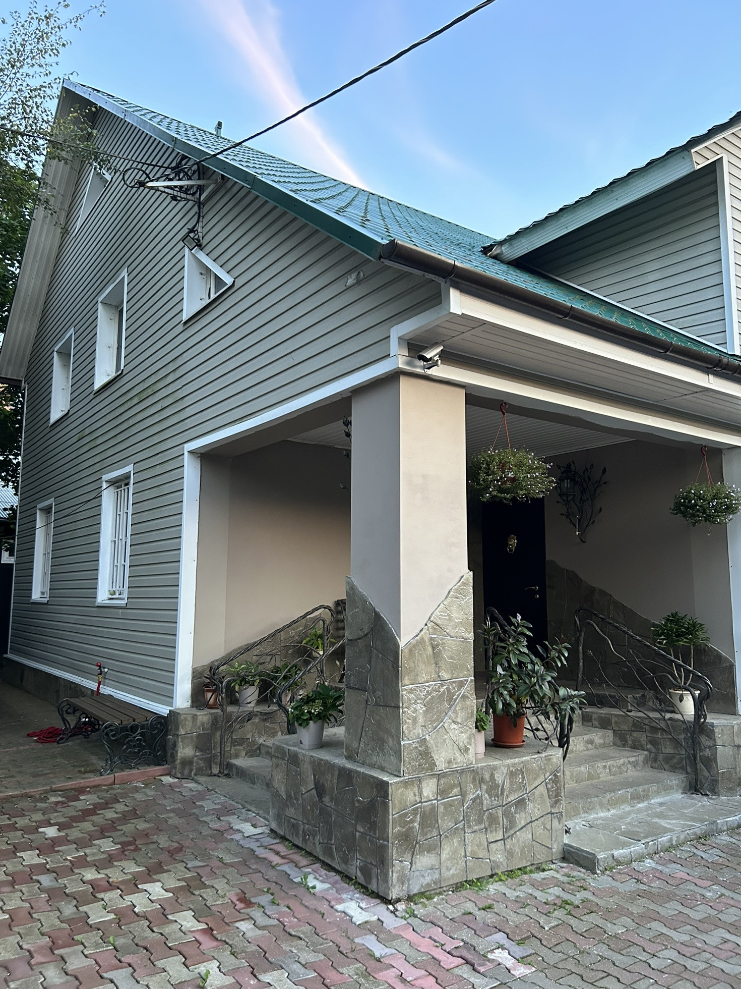 Дом для круглогодичного проживания с мебелью и оборудованием. Материал стен -кирпич, фасад отделан сайдингом. Фундамент ленточный. Полы и стены отделаны ценными породами дерева (вишня, дуб, бук, акация, груша,ясень).