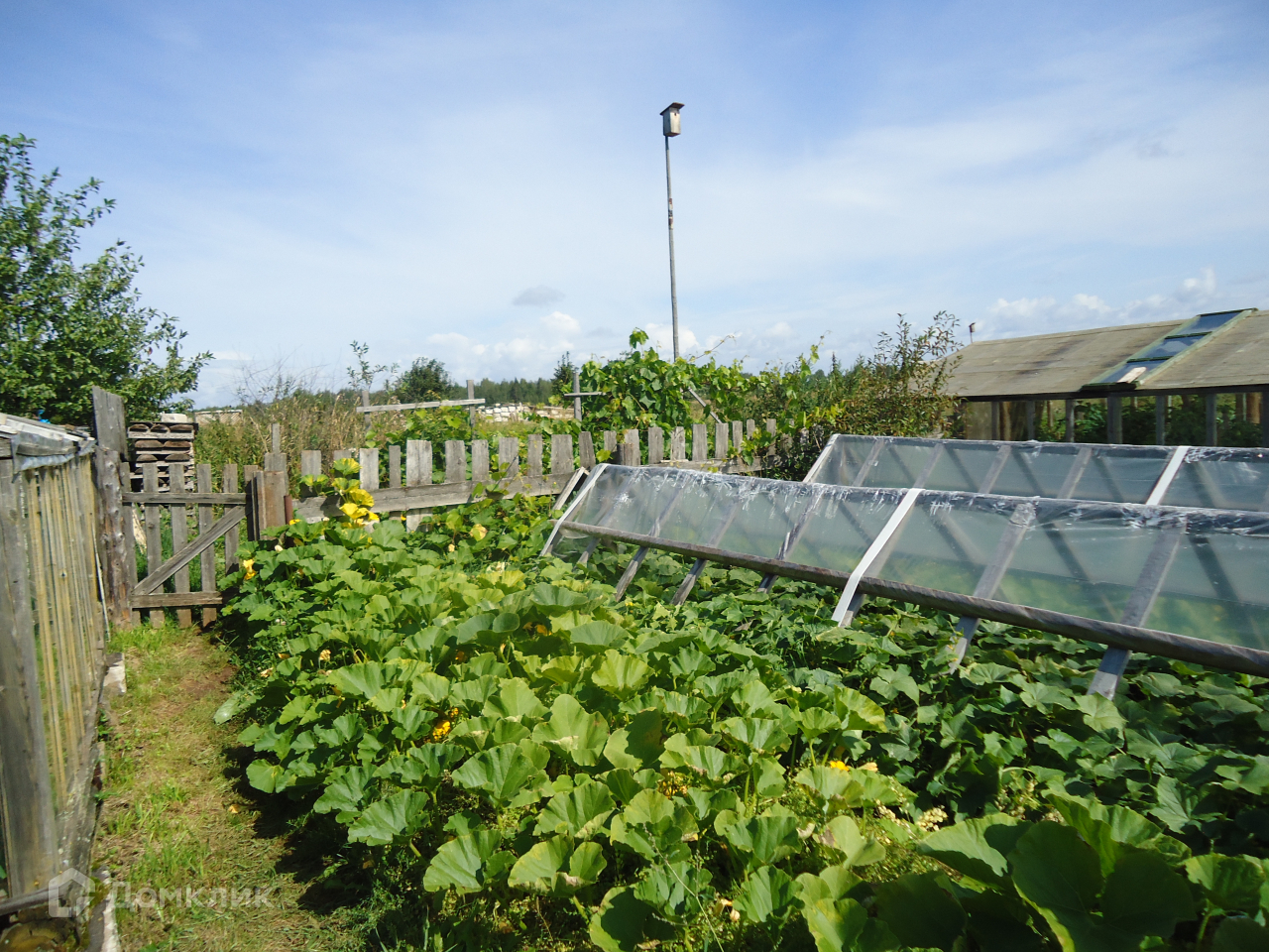 Дом огорожен металлическим забором. В собственности 44 сотки земли. Часть земель возделана. 3 теплицы. Есть плодово-ягодные насаждения.