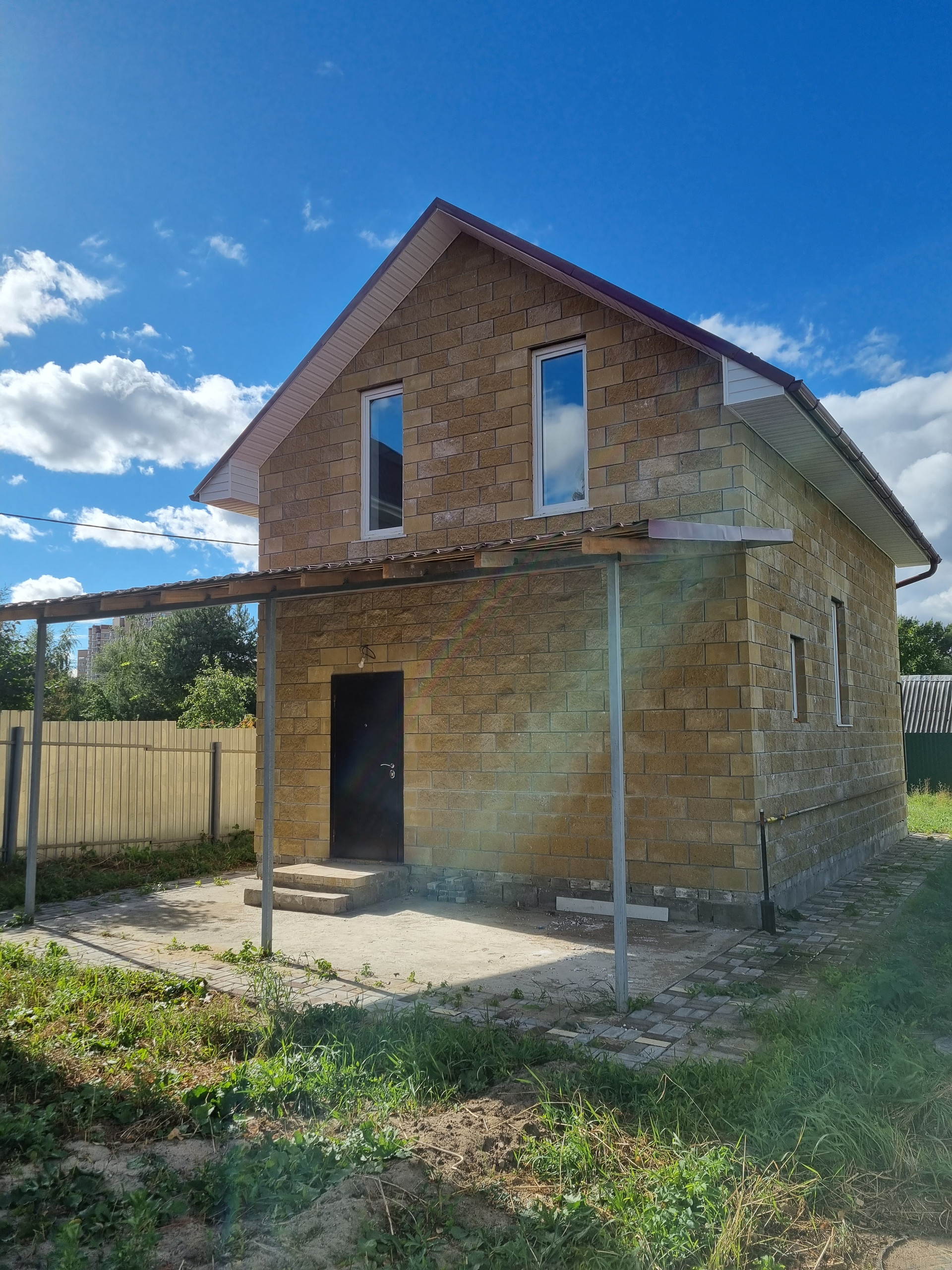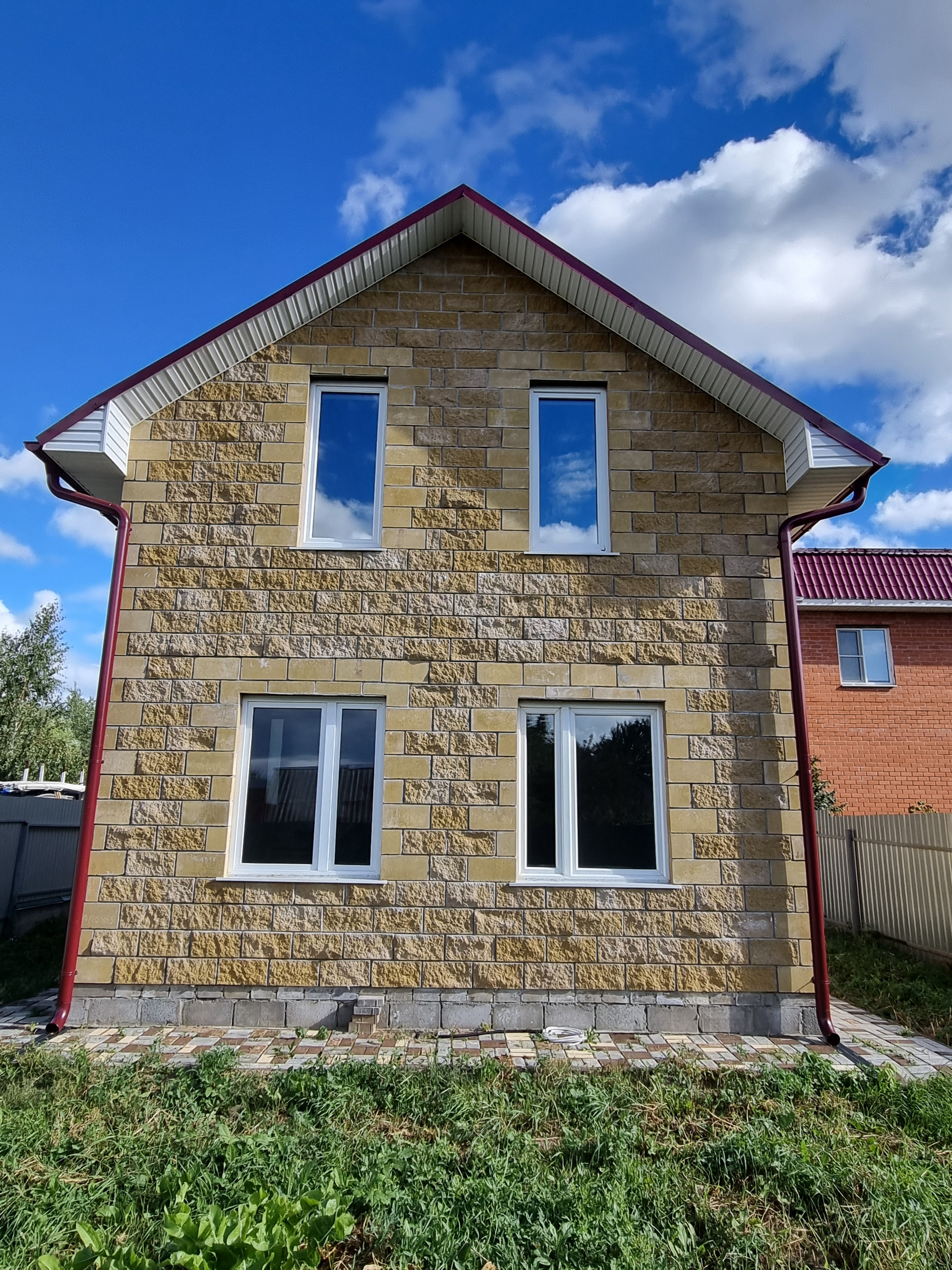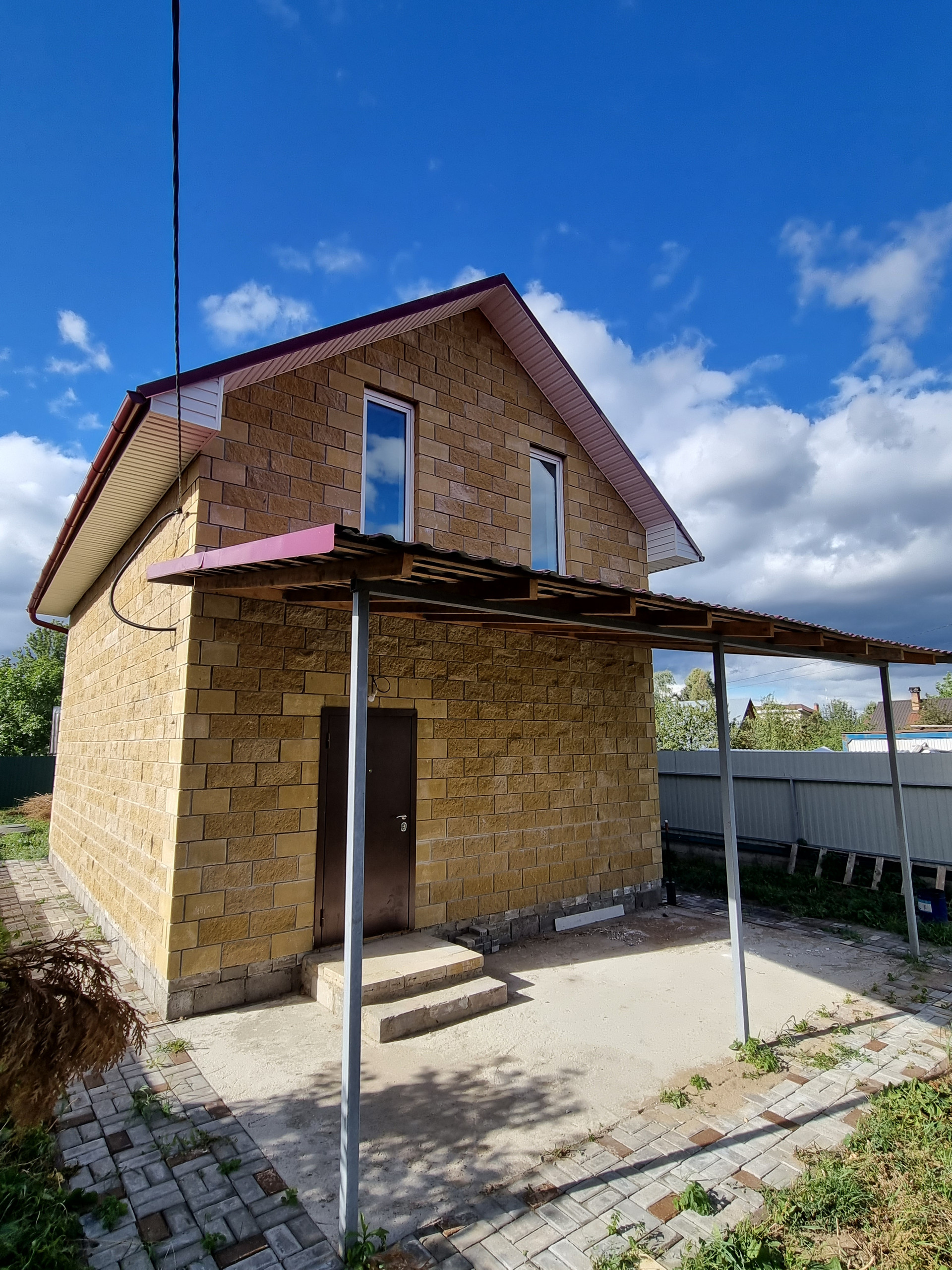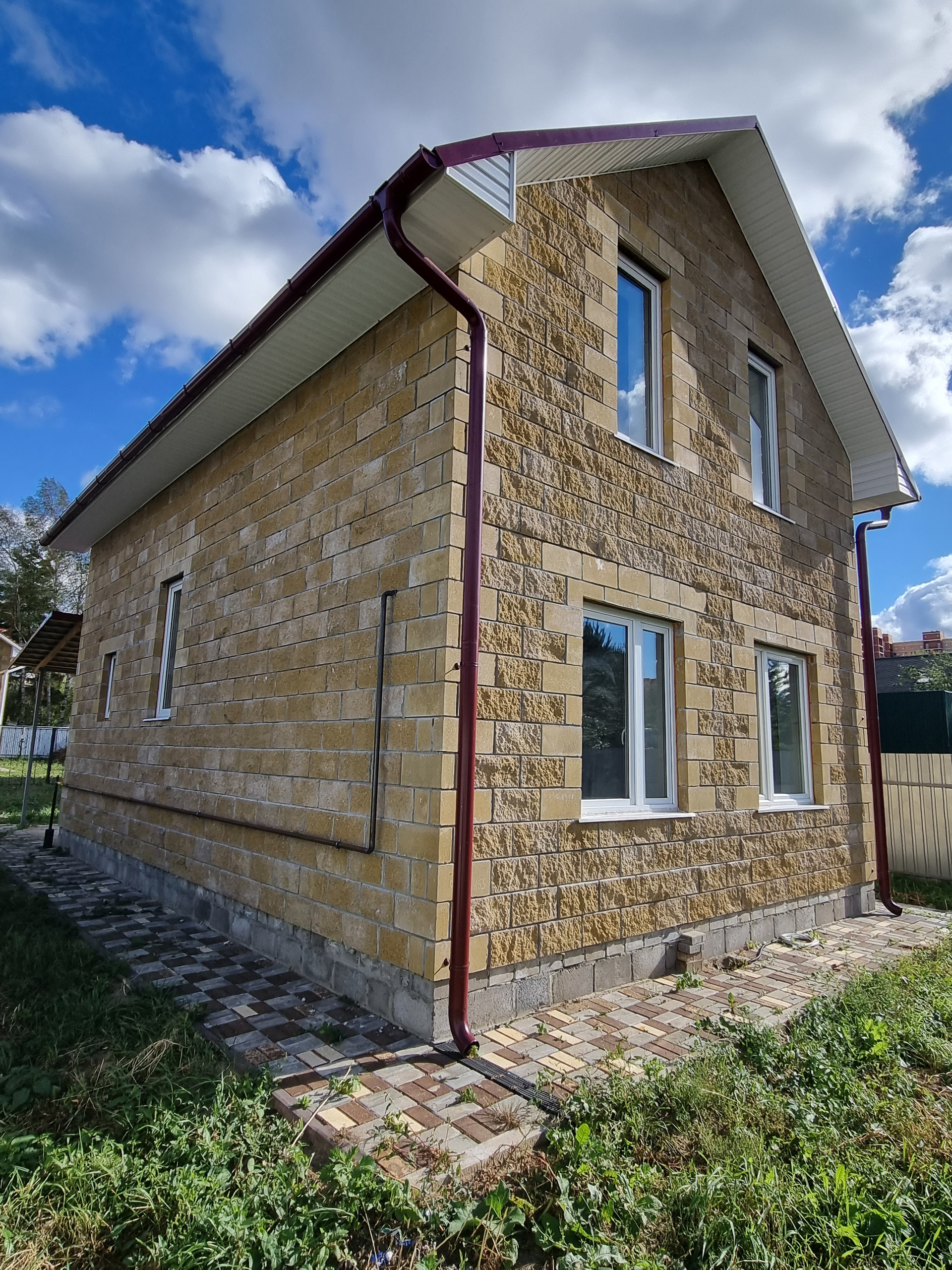 Стены - облицовочный колотый блок 10см, утепление 5см, пеноблок;