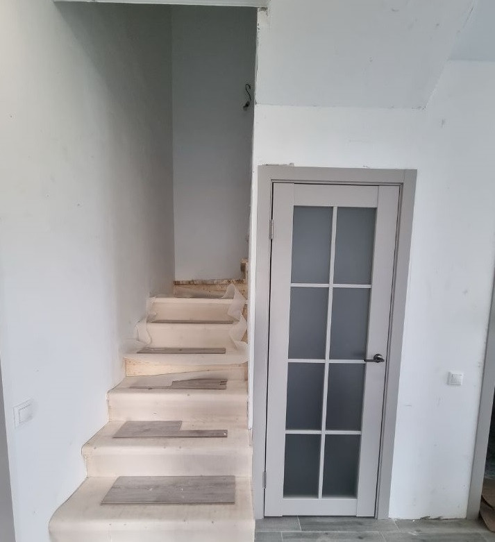Фундамент - монолитная железобетонная плита; Стены - облицовочный колотый блок 10см, утепление 5см, пеноблок; Кровля - утепленная минераловатными плитами 200мм, натуральная керамическая черепица, водосточная система Grandline; Окна - с ПВХ переплётом и с двухкамерным остеклением; Внутренняя отделка: Пол 1-го этажа - керамогранит под ламинат; Пол 2-го этажа - ламинат 8мм, 33 класс; Стены отшпатлеваны по ГКЛ, подготовлены под окраску или обои; Потолки - 1-го и 2-го этажа натяжные; Для доступа на 2-ой этаж предусмотрена бетонная лестница.