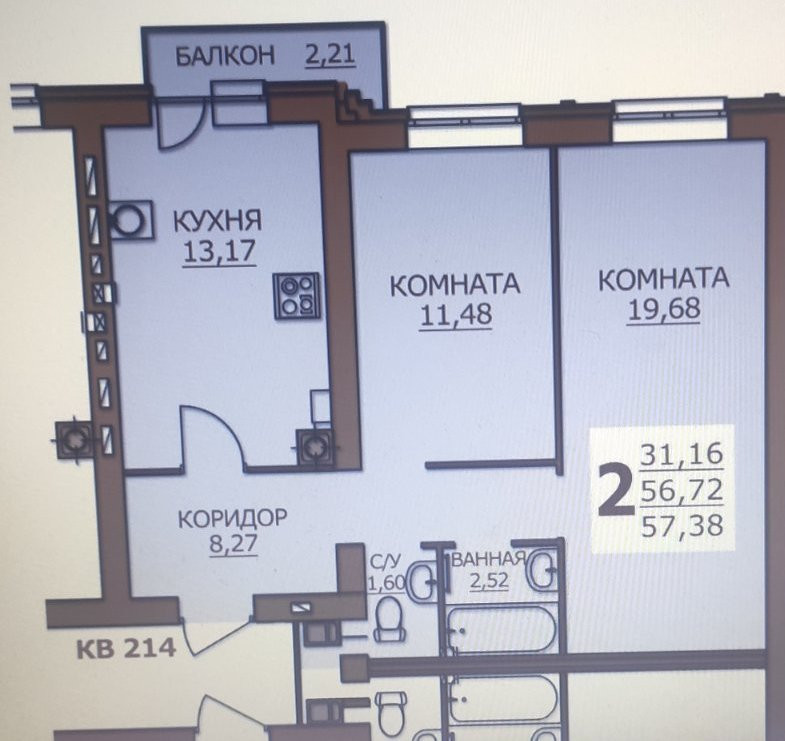 Общая площадь 57.38 м2
