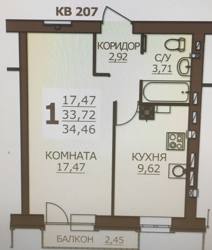 Общая площадь 34.46 м2