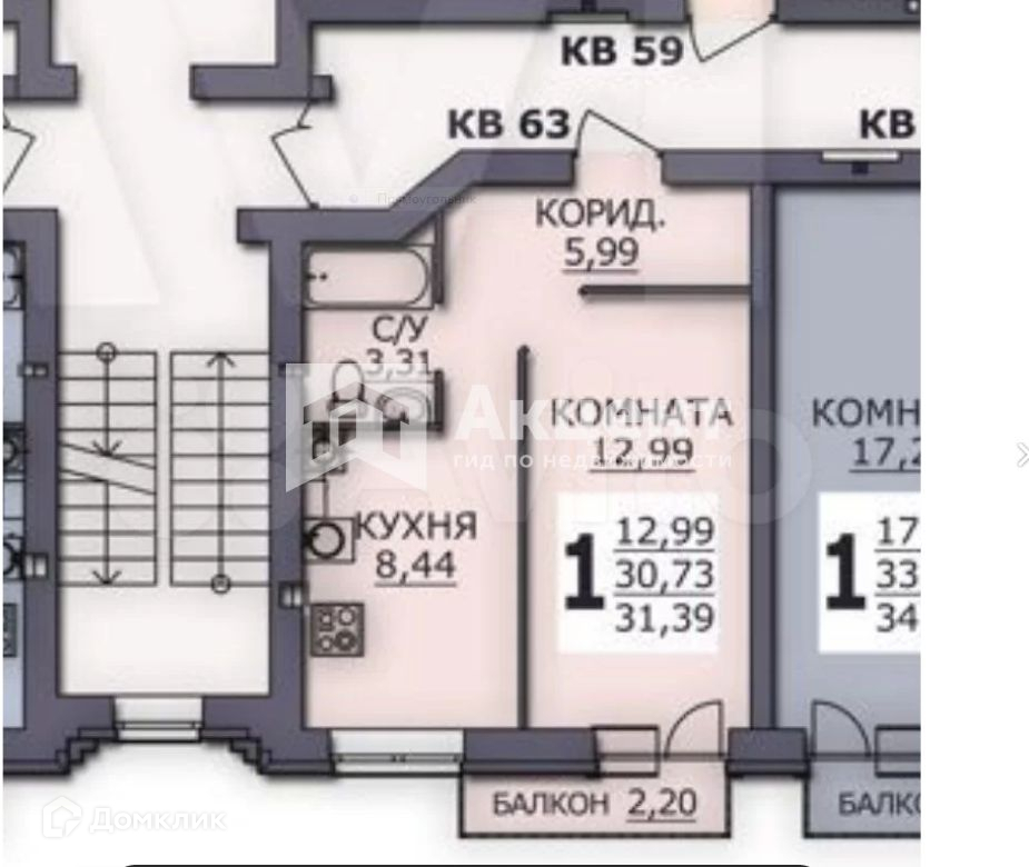 1-комнатная квартира, 31.4 м2, этаж 6 / 8, на продажу в деревне Дерябихе, деревня Дерябиха, 76