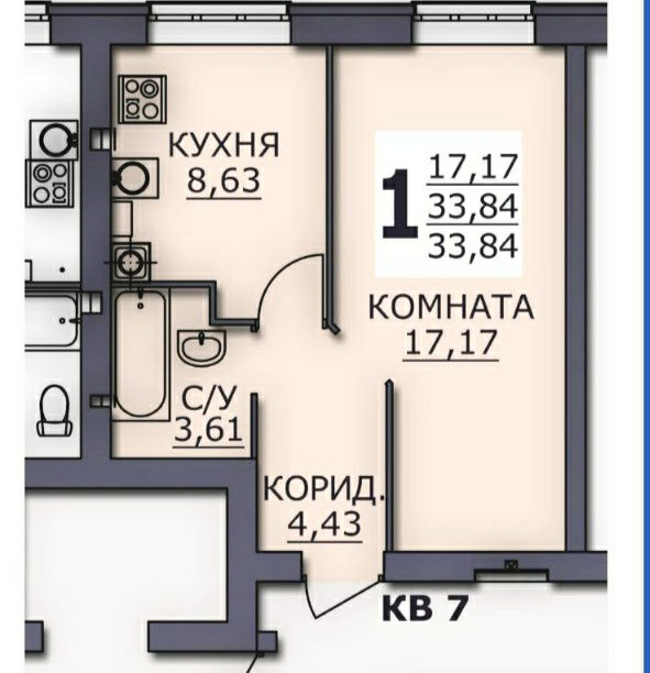 Общая площадь 34.4 м2