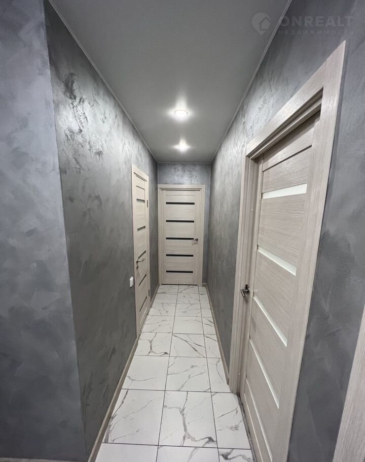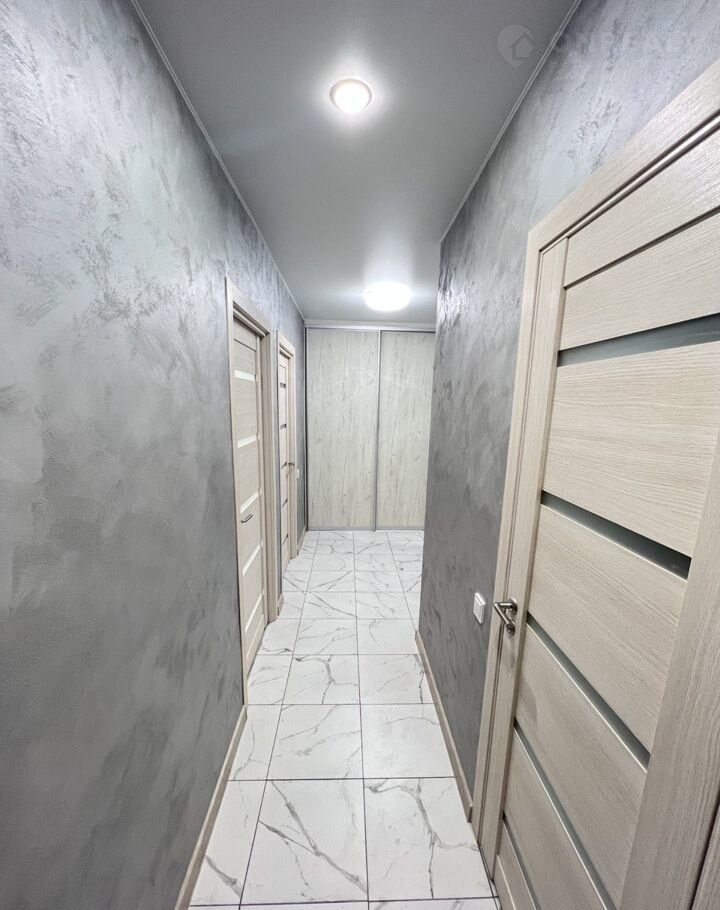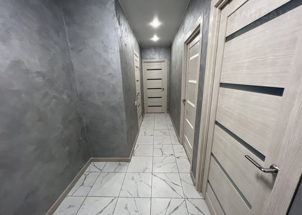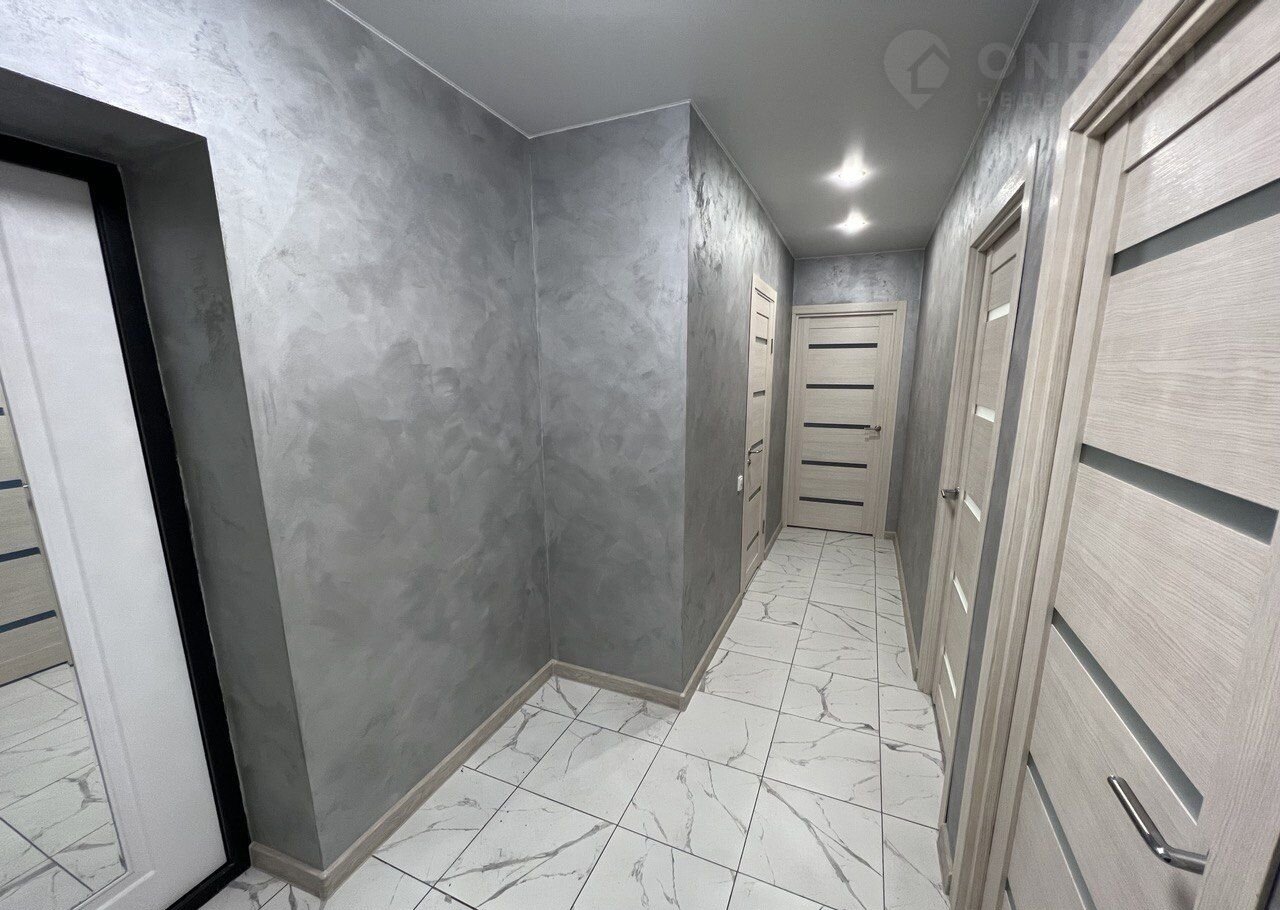 Натяжные потолки с точечными светильниками и люстрами. Отделка пола выполнена керамогранитом в коридоре, прихожей, кухне и санузле, в комнатах - ламинат. Стены - декоративная штукатурка.