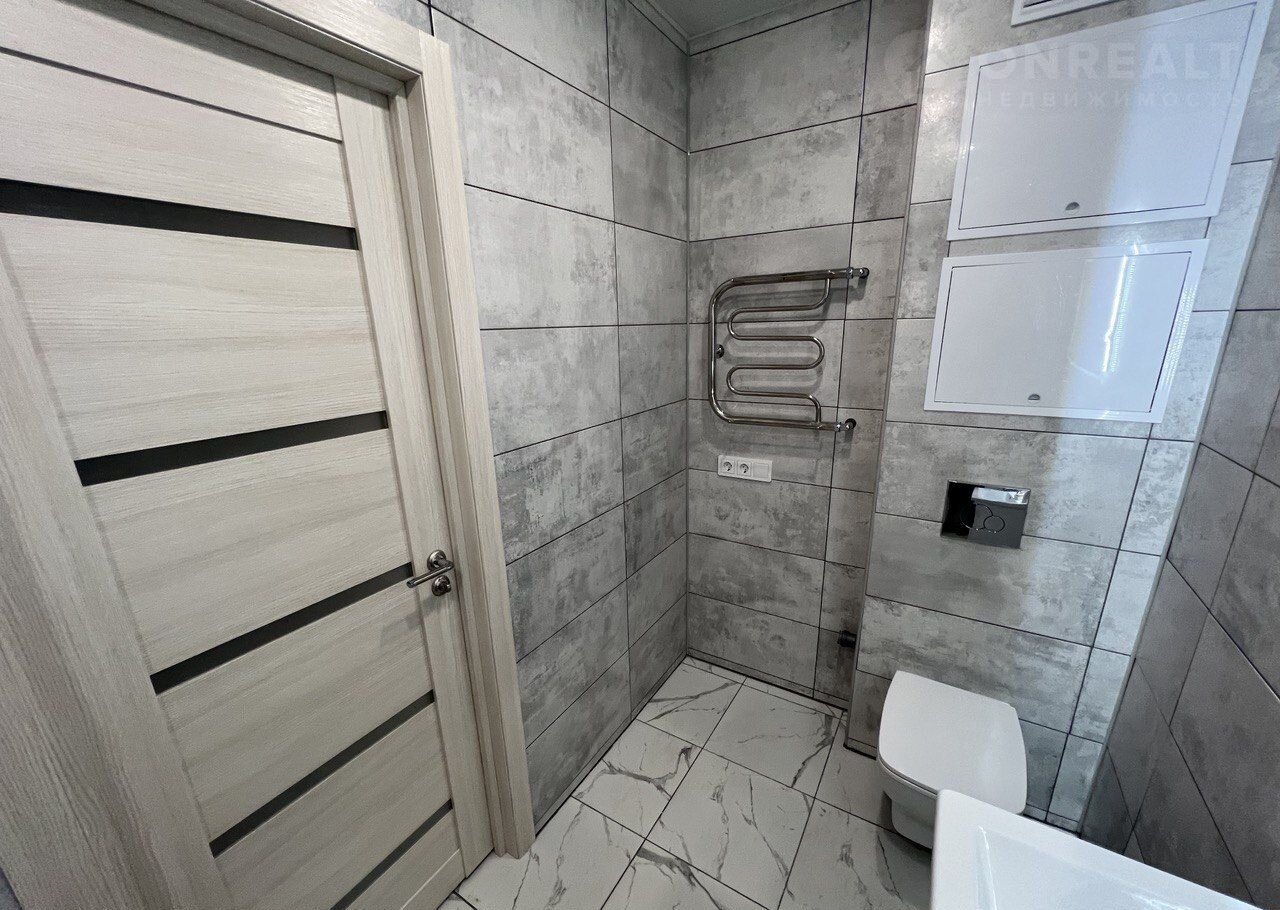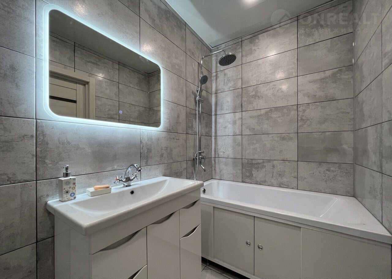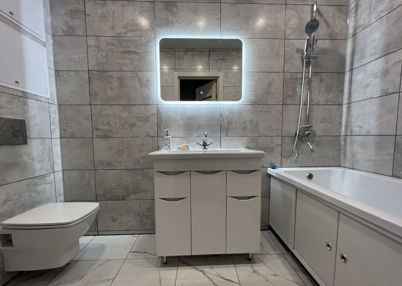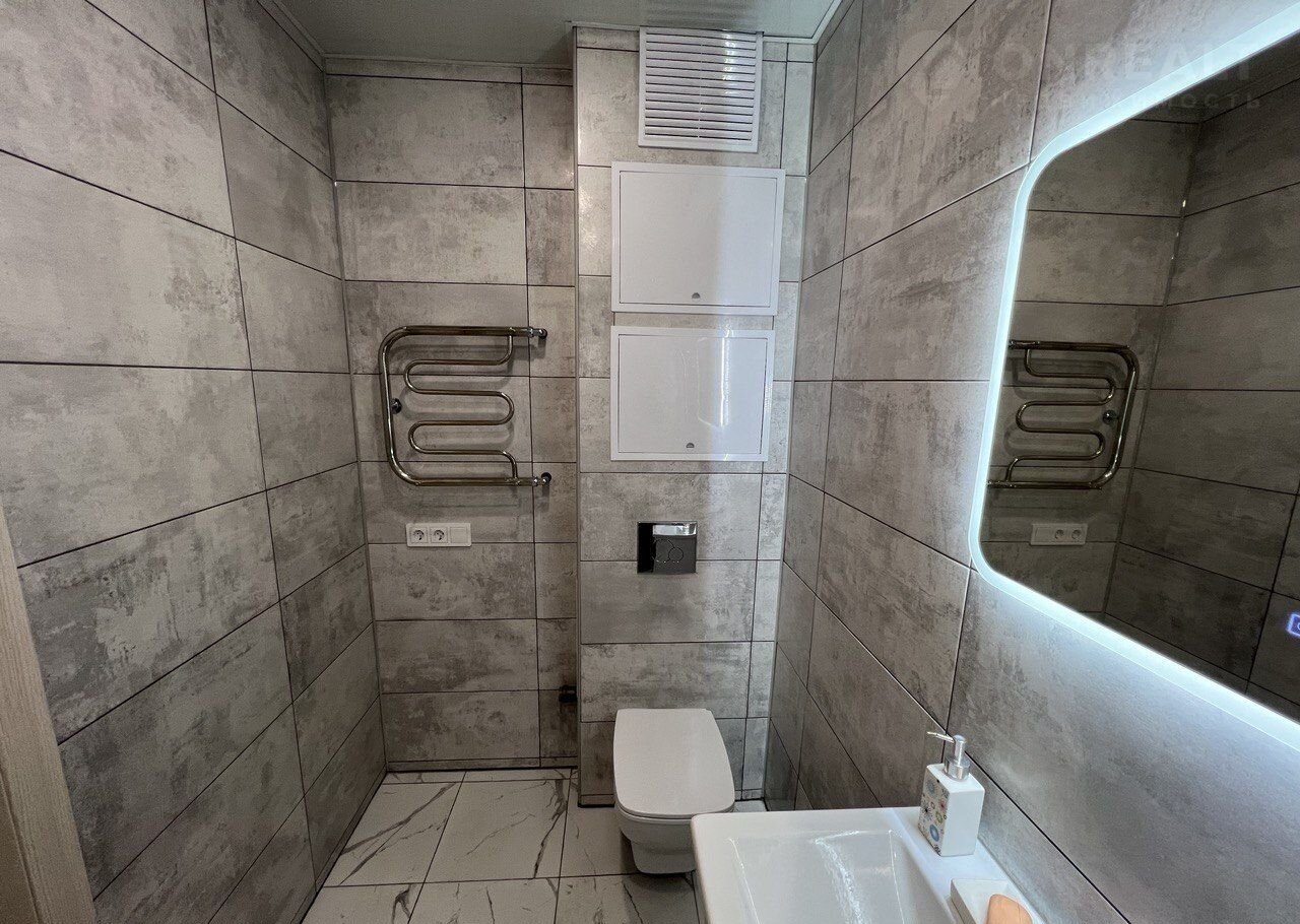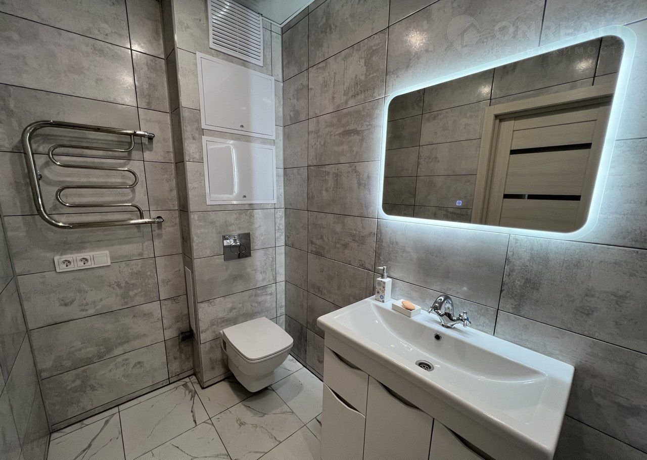 Санузел совмещенный, отделка выполнена керамогранитом. Установлен тропический душ, инсталляция и большое зеркало с подлсветкой.